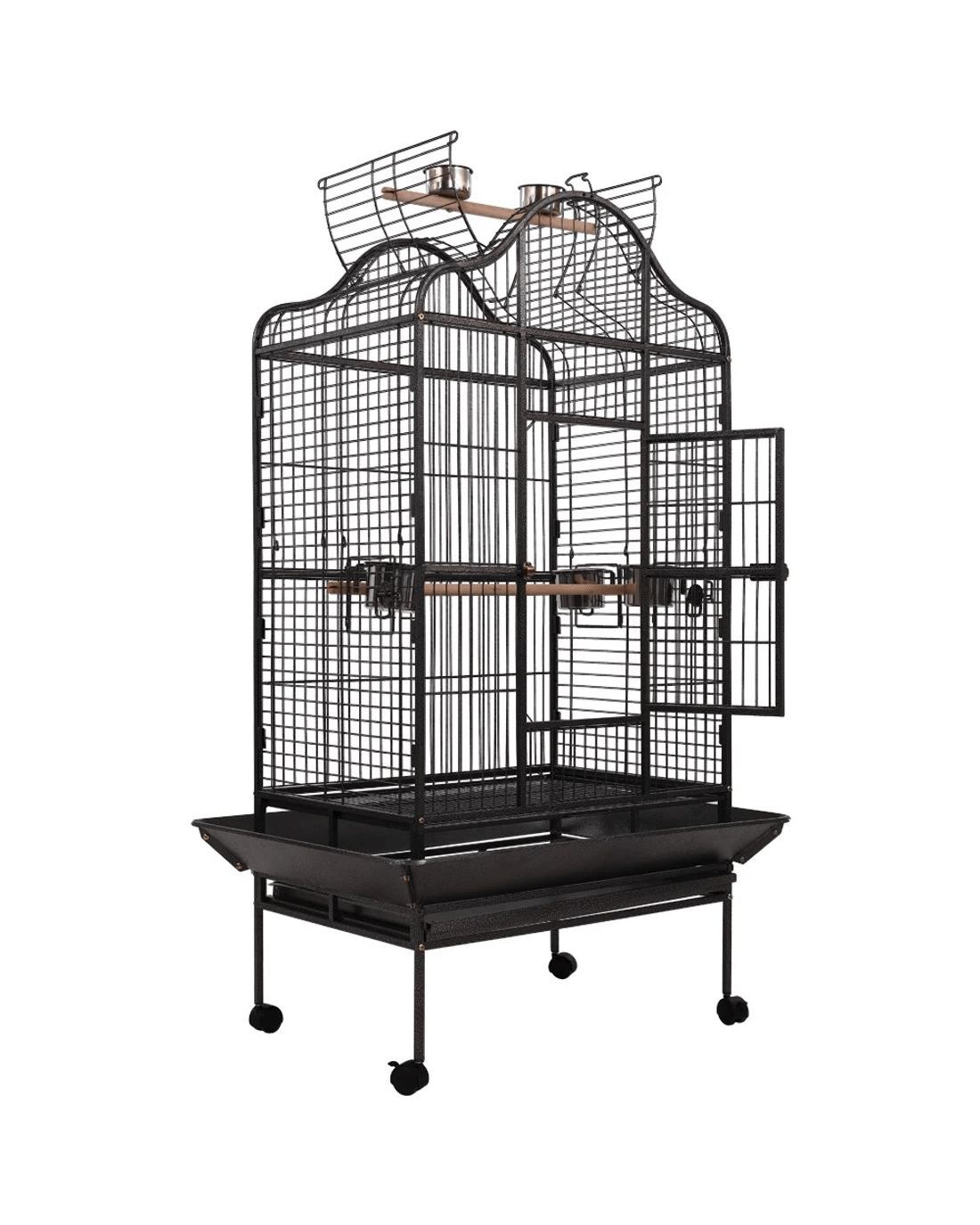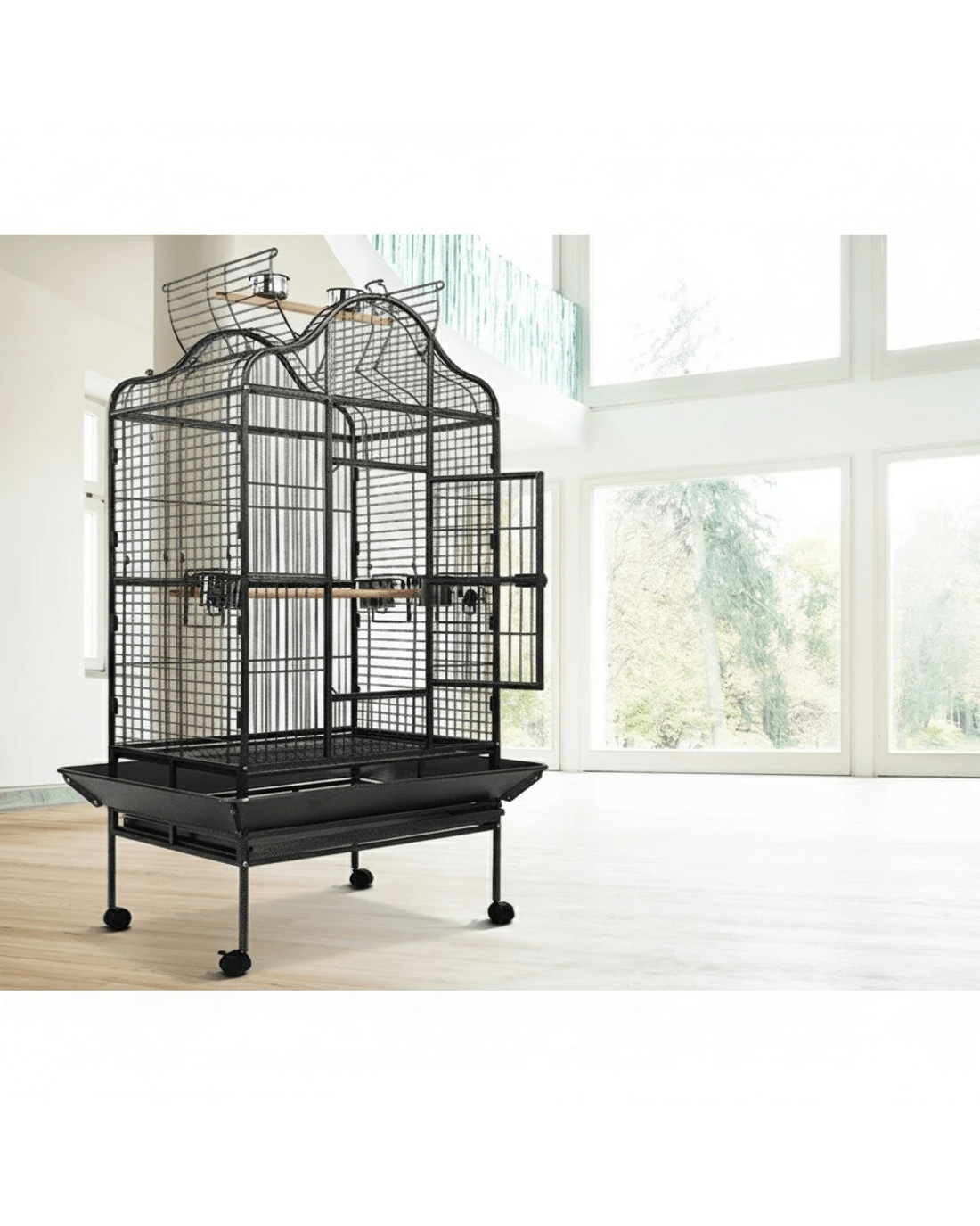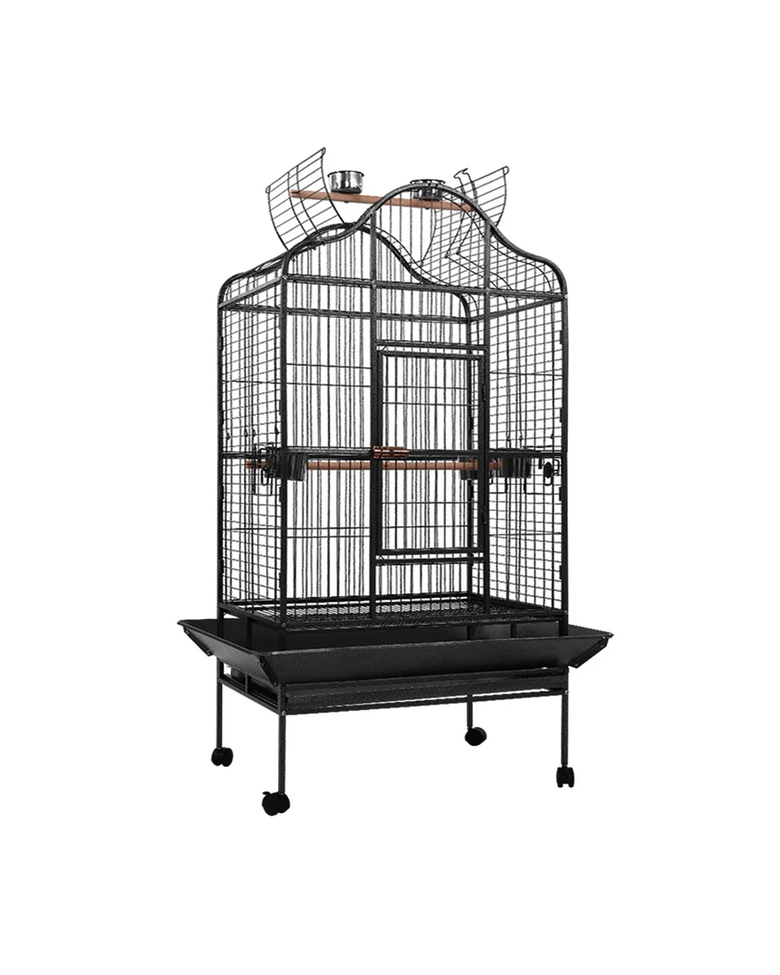 This fantastic and spacious i.Pet Bird Cage with open top is definitely the most comfortable roost for your little one. Our bird cage frame is made of heavy-duty wrought iron with vein powder-coated finish, so it is tough and durable. The size of this cage is perfect for medium and large sized birds and parrots, with ample room for them to move about. You can convert the cage to open roof easily and let your bird perch up high. It also features seed skirts all around the cage, a large access door, small side access windows for stainless steel food/water trays, two timber perches (one with two stainless steel feeders for the open roof), and removable bottom tray for easy clean-up. Best of all, castor wheels are fitted to the matching stand to provide great mobility. Equipped with all the favourite entertainments that a bird would need, your little one will surely love it.