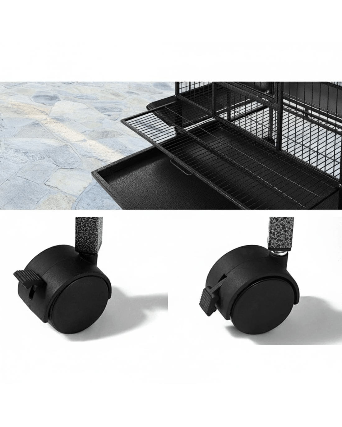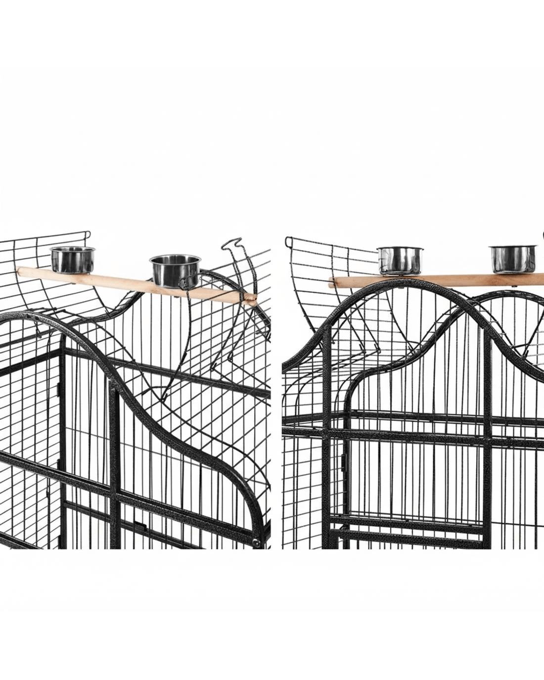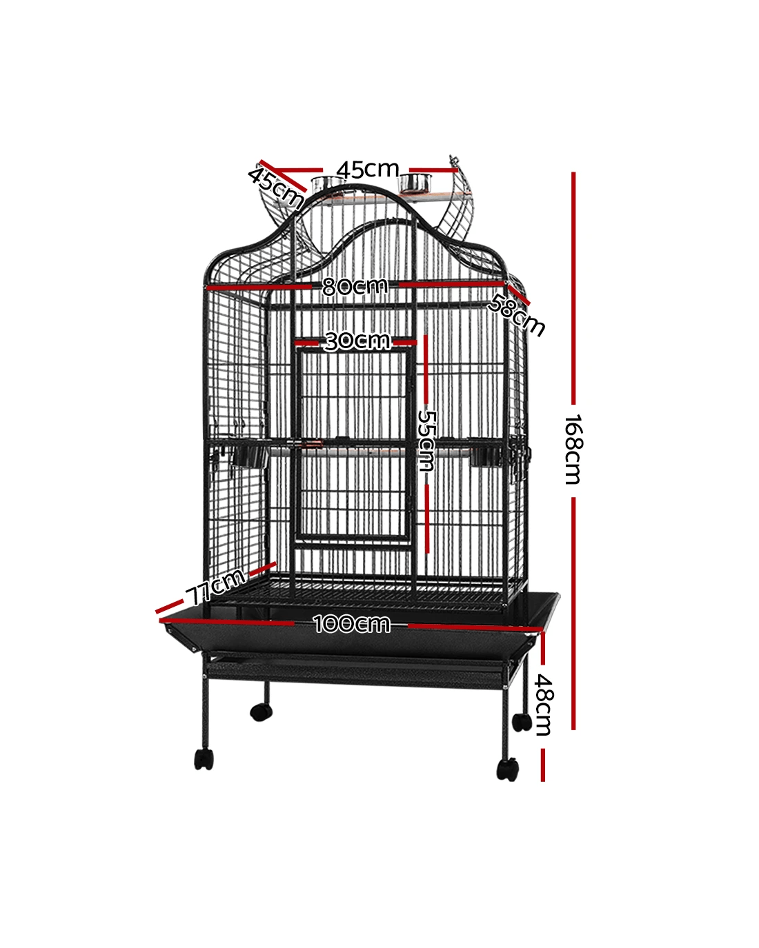 This fantastic and spacious i.Pet Bird Cage with open top is definitely the most comfortable roost for your little one. Our bird cage frame is made of heavy-duty wrought iron with vein powder-coated finish, so it is tough and durable. The size of this cage is perfect for medium and large sized birds and parrots, with ample room for them to move about. You can convert the cage to open roof easily and let your bird perch up high. It also features seed skirts all around the cage, a large access door, small side access windows for stainless steel food/water trays, two timber perches (one with two stainless steel feeders for the open roof), and removable bottom tray for easy clean-up. Best of all, castor wheels are fitted to the matching stand to provide great mobility. Equipped with all the favourite entertainments that a bird would need, your little one will surely love it.