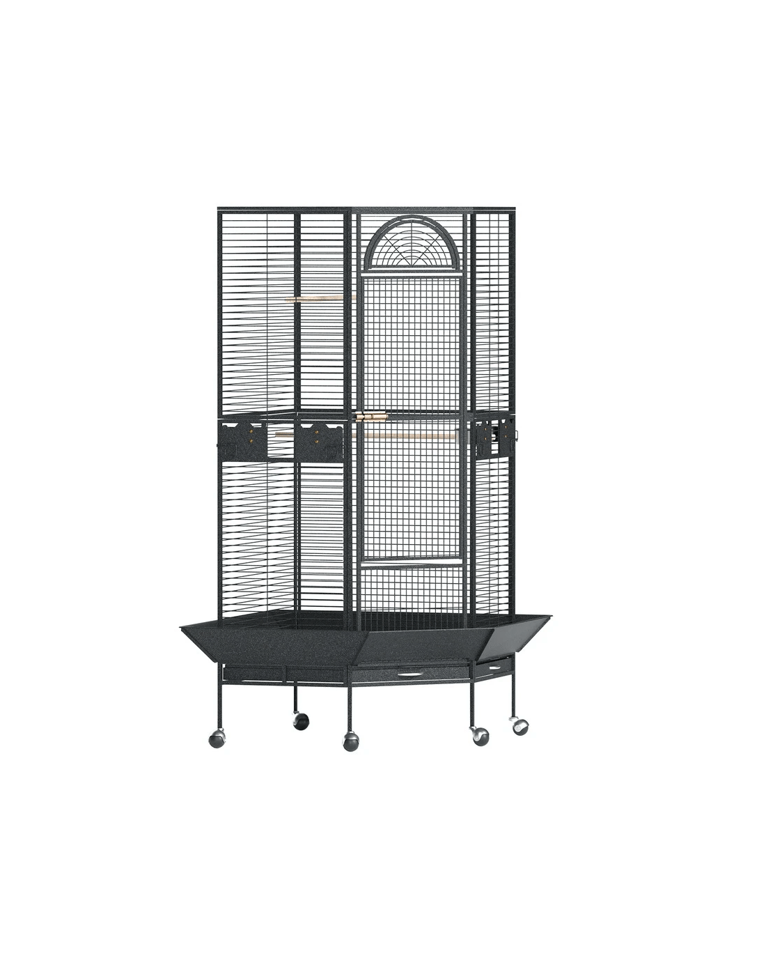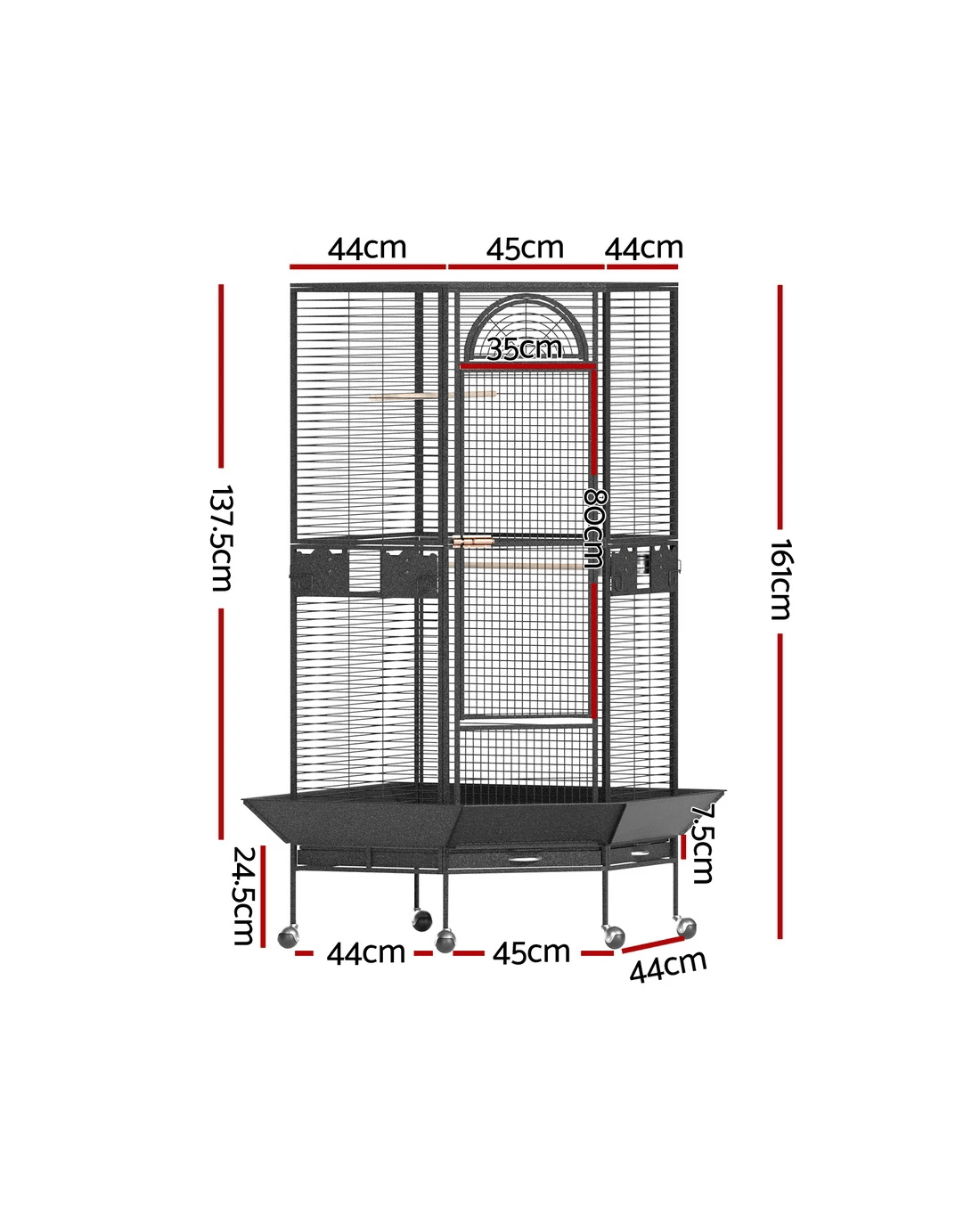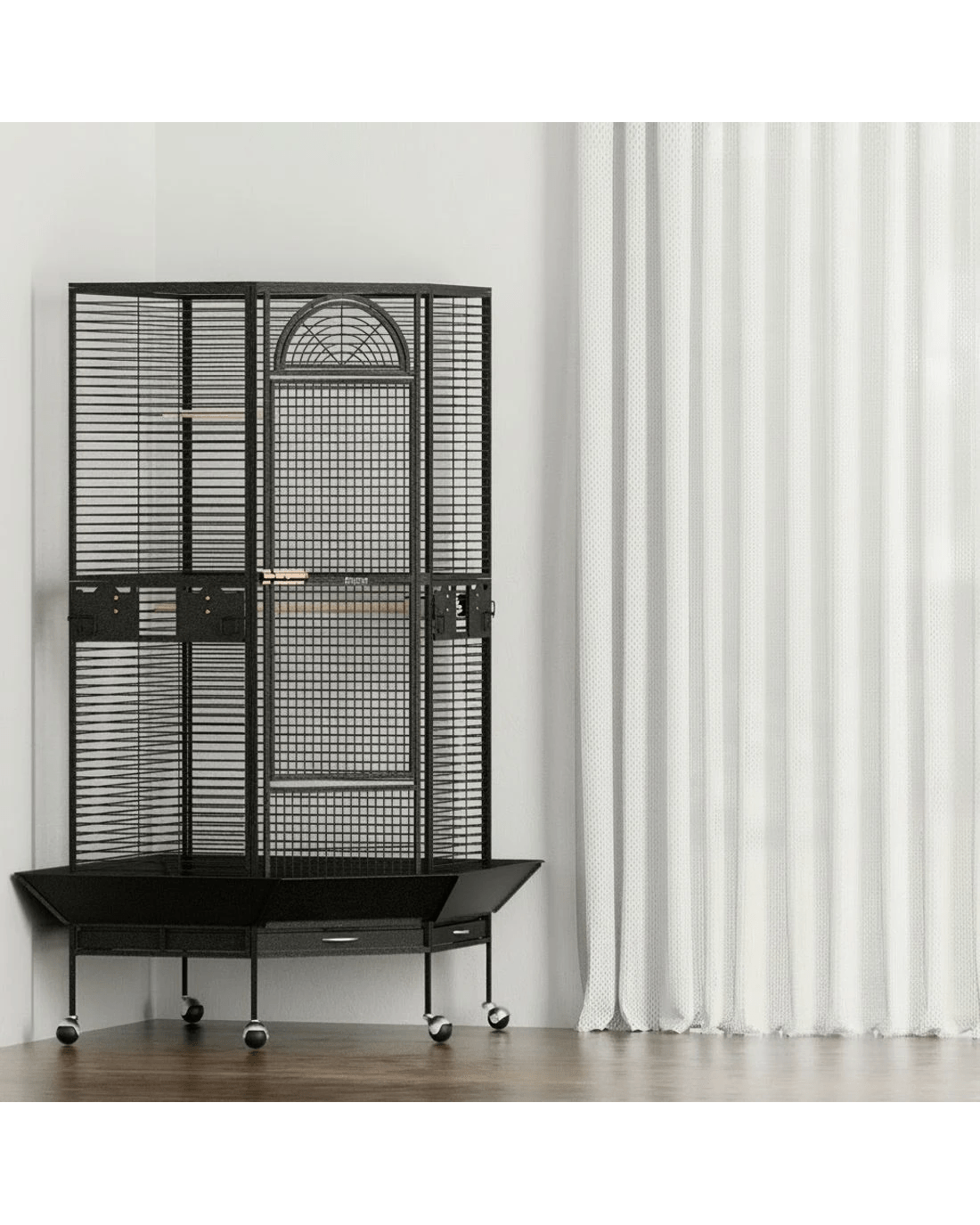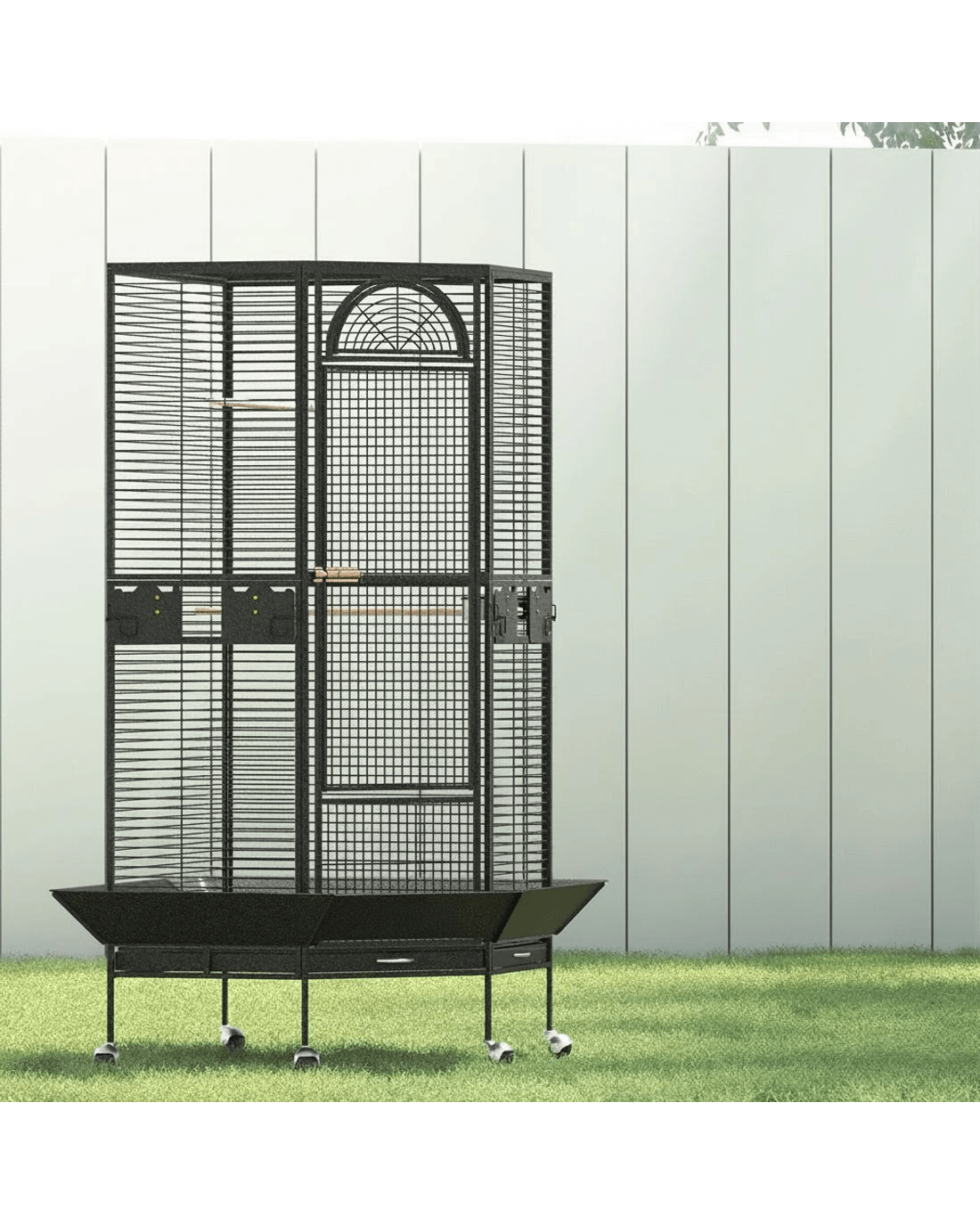 Caring for your flock is easy with an i.Pet Bird Cage. With our space-saving corner design, you can keep your birds in good company while maintaining free movement in your home. Made from durable wrought iron with a protective coating, this cage is built to last. It features a large entrance and four swinging food access windows, providing easy access for both you and your bird. Two slide-out removable trays and two removable grates make cleaning a breeze. With two wooden perches and four feeder cups, your birds will have plenty of space to eat and play. The stand is supported by four smooth castor wheels, making it easy to move around. Suitable for small to medium birds, you'll love the convenience of the i.Pet Corner Bird Cage.