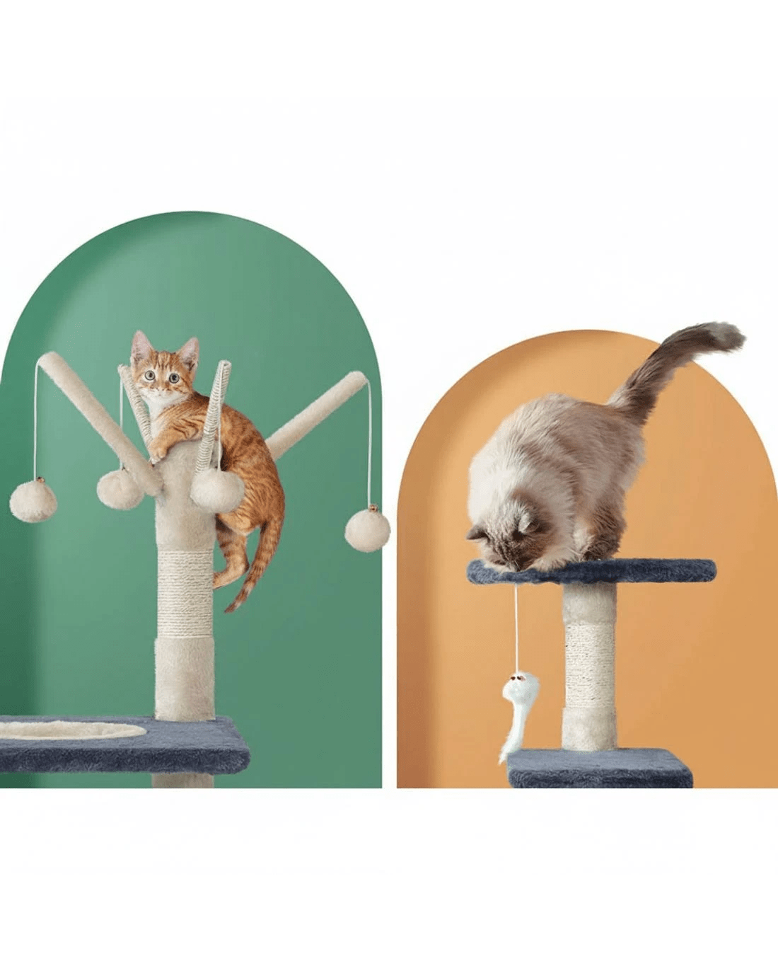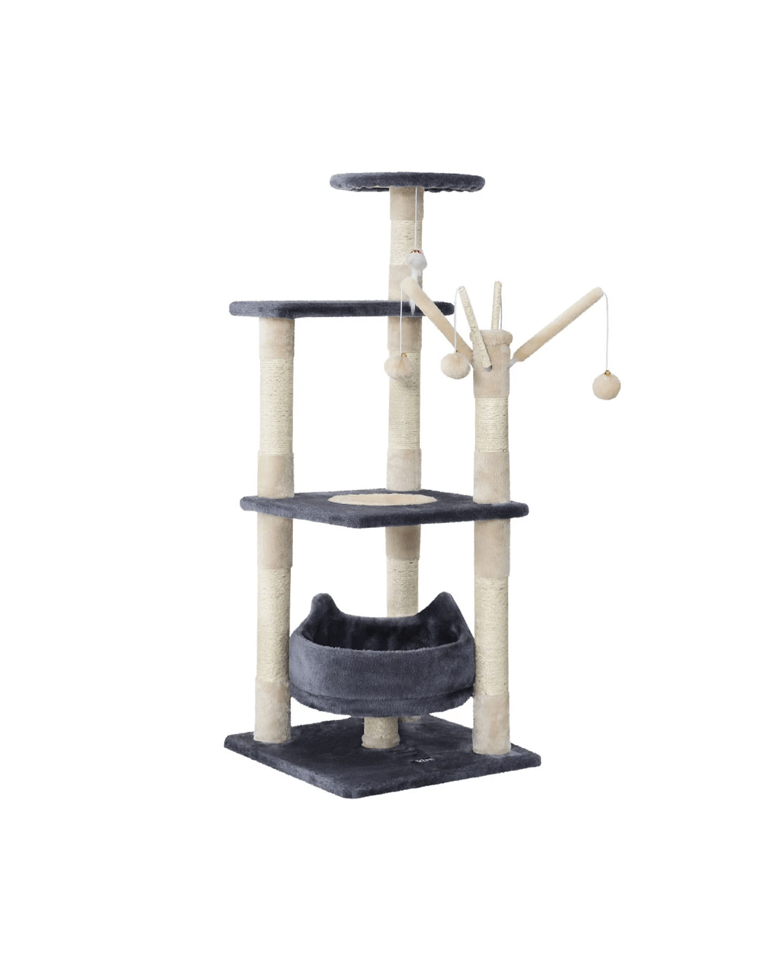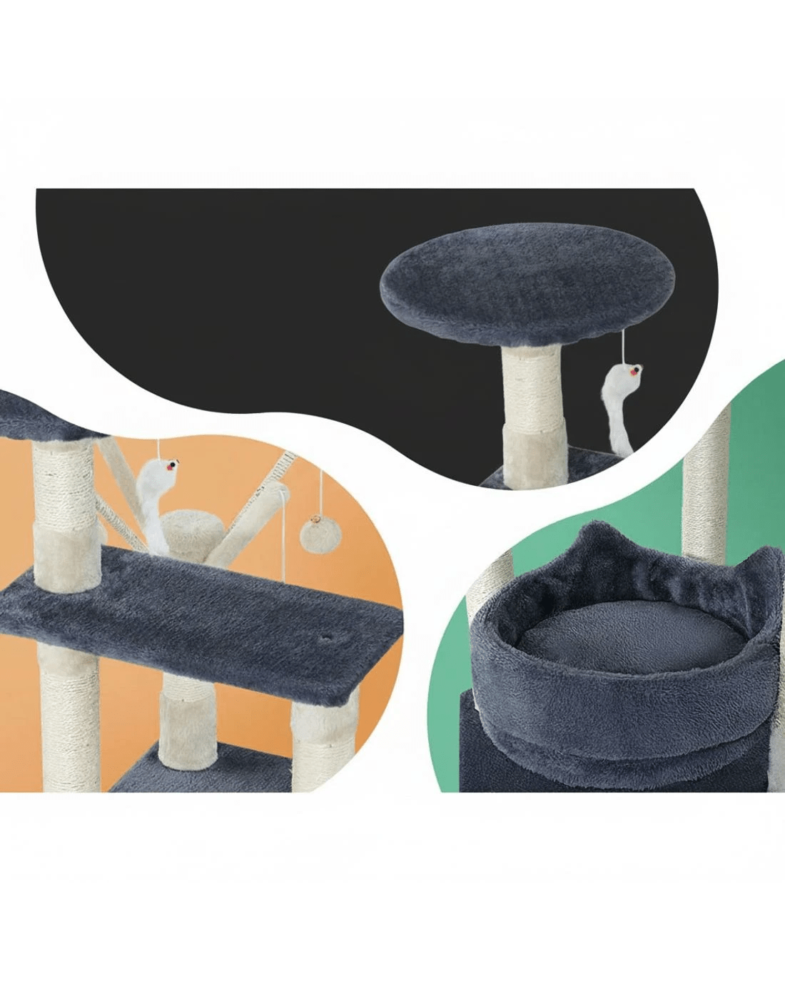Our cat tree will let your feline friend play out its natural instinctive behaviour. It features a multi-level design with play cubicles, hanging toys, activity balls, sisal posts, and much more. This cat tree offers unlimited opportunities to provide your pets with fun-filled moments and keep them healthy. It also has comfortable velvet upholstered surfaces, ideal for napping after a long playtime. Furthermore, the sisal-wrapped poles are ideal for your pets to scratch and claw, keeping their claws healthy and distracting them from scratching the furniture. Crafted from fir wood with sisal posts, our cat tree is both pet and eco-friendly.