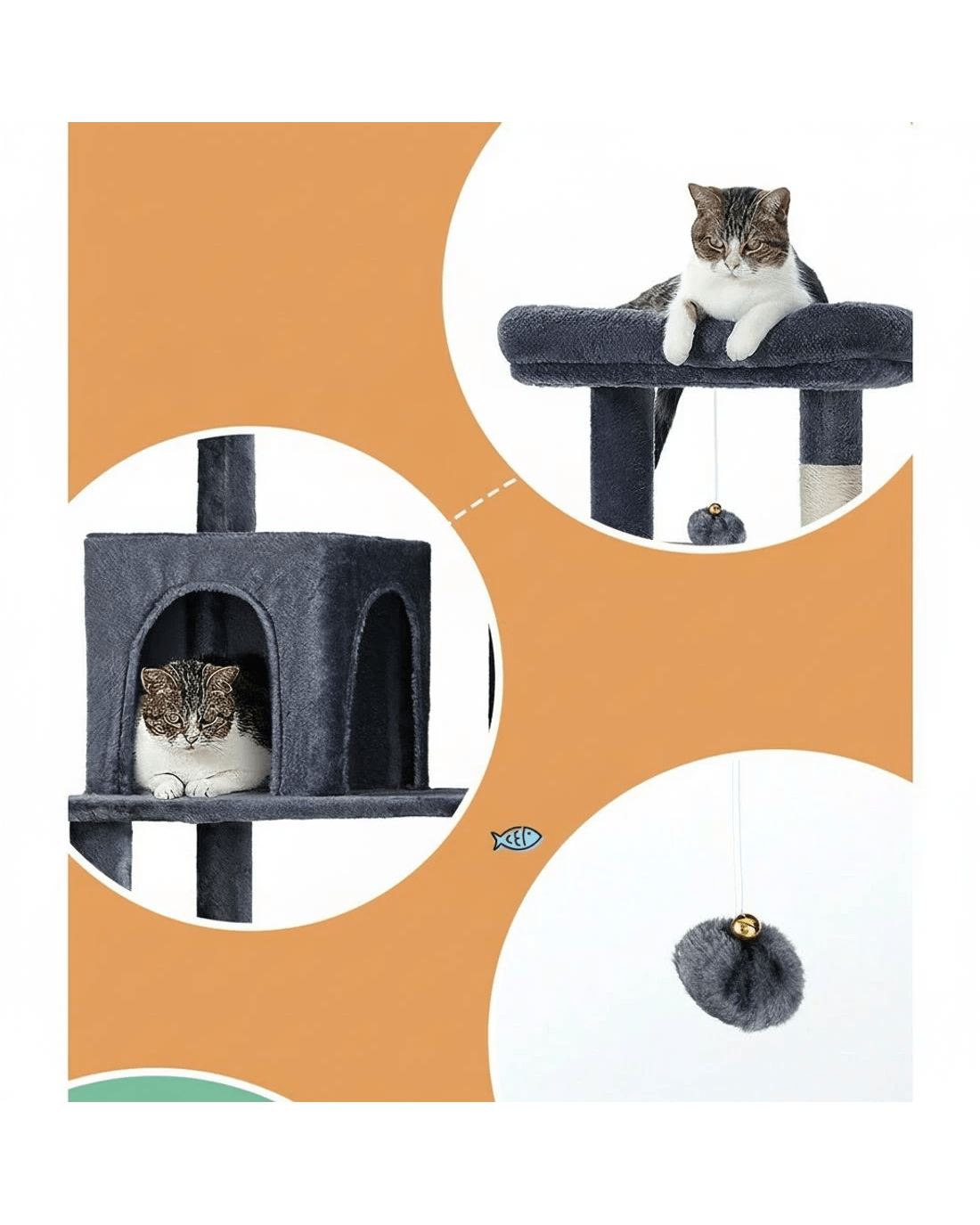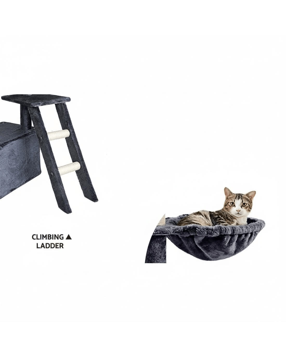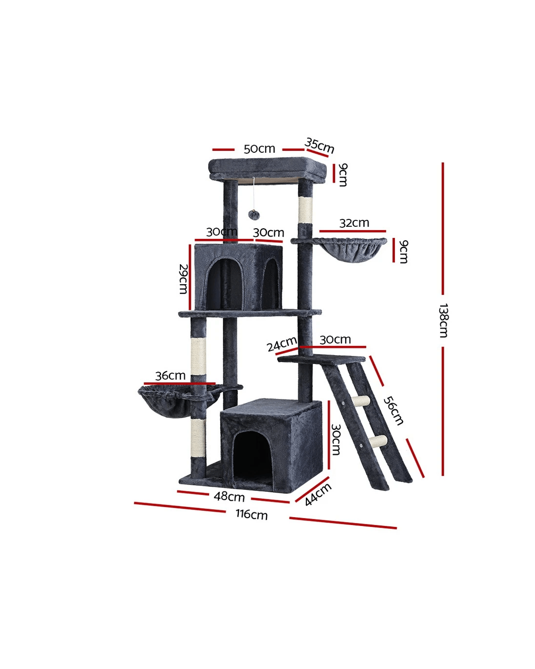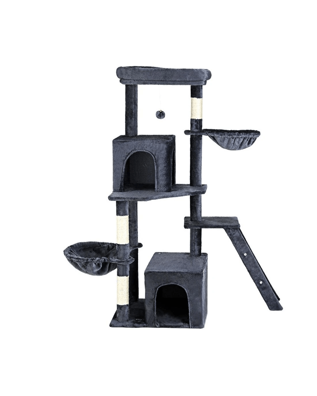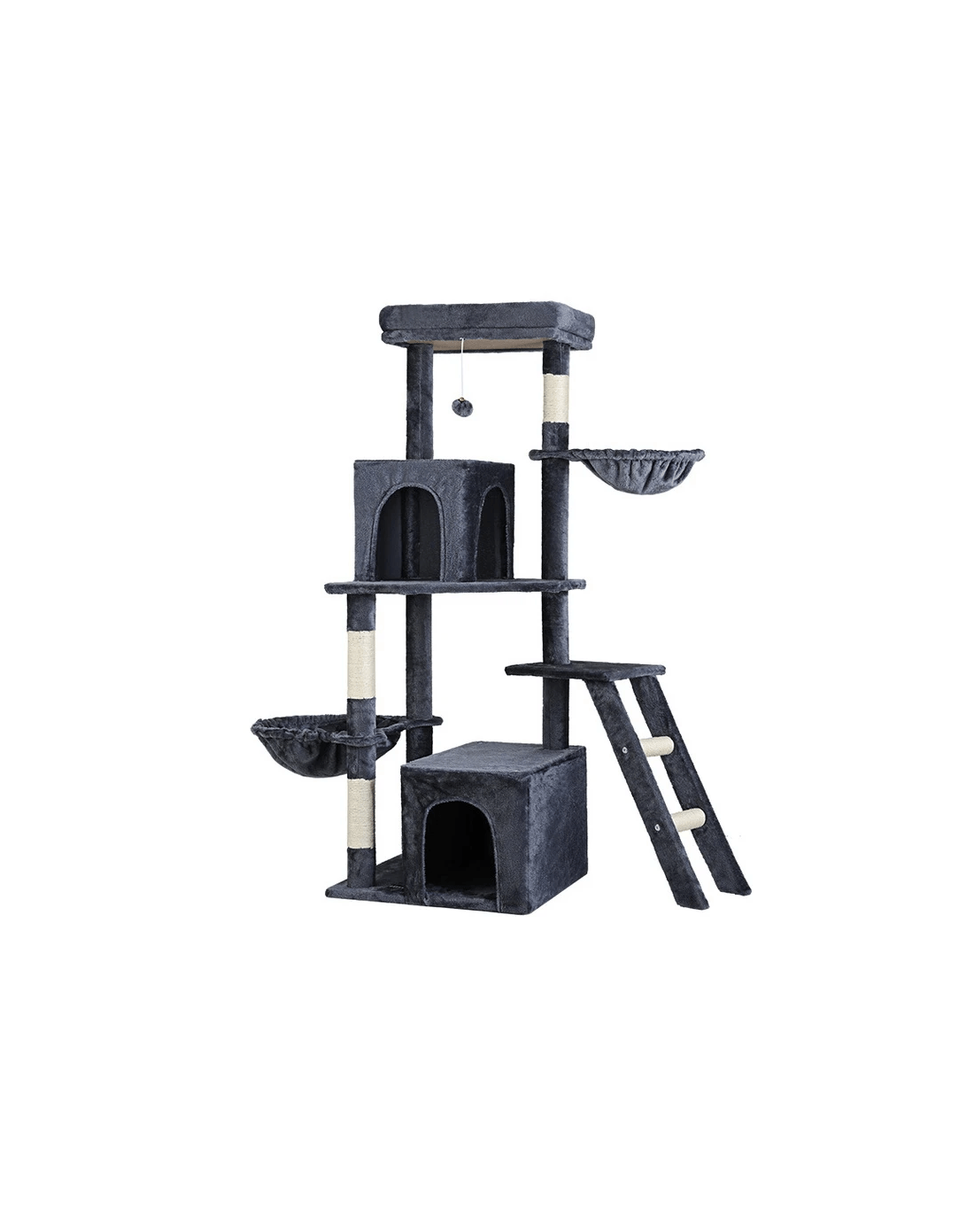 Built to satisfy the natural instincts of your precious pet, our i.Pet Cat Tree includes a host of nooks and crannies for your cats to have hours of fun scratching, hunting, climbing, jumping, hopping or simply lounging around. The tree is made from sturdy wooden construction and upholstered with a plush scent- and chemical-free velvety linen surface for extra comfort and style. The hanging balll will keep your cat curious and alert. Natural woven sisal twine towers encourage your cat's scratching instincts while keeping your furniture scratch-free. Best of all, the firm base ensures that the tree remains a durable, solid-standing cat haven with total peace of mind for you. Can we hear a meow to that?