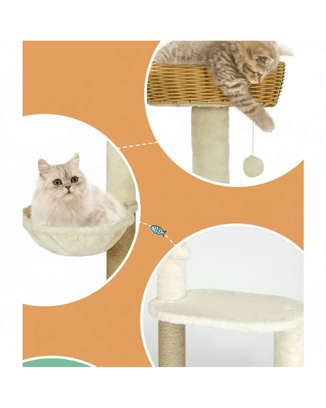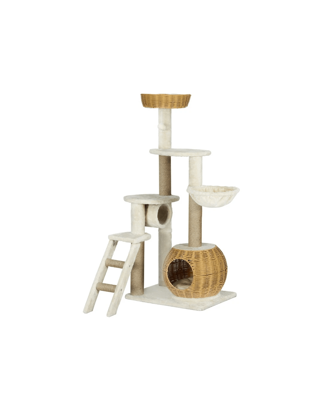 Built to satisfy the natural instincts of your precious pet, our i.Pet Cat Tree includes a host of nooks and crannies for your cats to have hours of fun scratching, hunting, climbing, jumping, hopping or simply lounging around. The medium-sized cat tree is built on a stable base to prevent tipping and the sturdy wood construction is built to last through years of play. Natural sisal posts encourage your cat's scratching instincts and help maintain healthy claws. The plush, soft linen cover will lull your cats to sleep on two plush platforms, one fabric hammock, a fabric tunnel, a closed rattan cubby and a rattan sleeping platform. A hanging ball keeps your cats alert and playful. With multiple levels and access points your cats can jump, climb and observe the home on high. Keep your cat feline fine with an i.Pet Cat Tree.