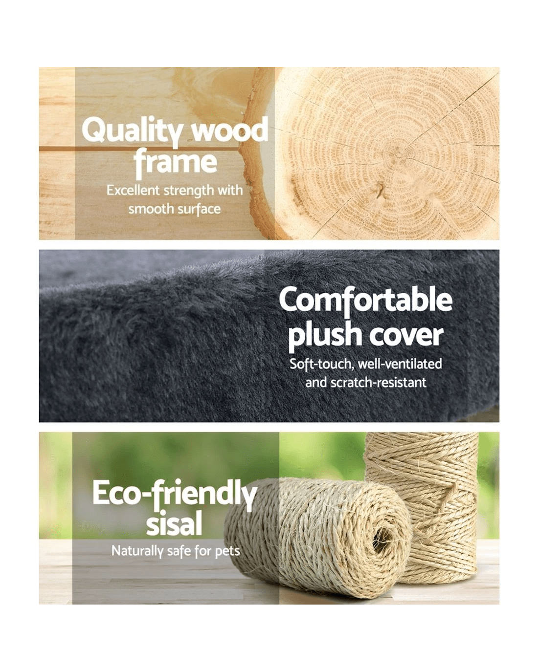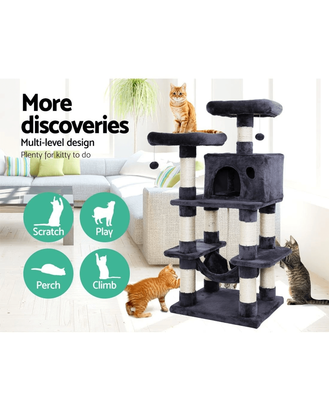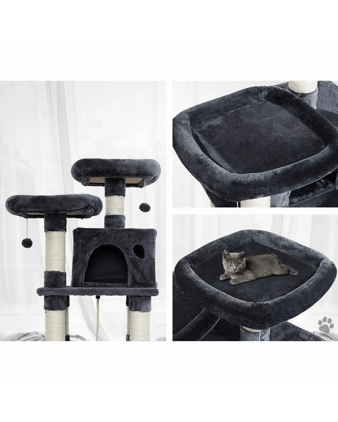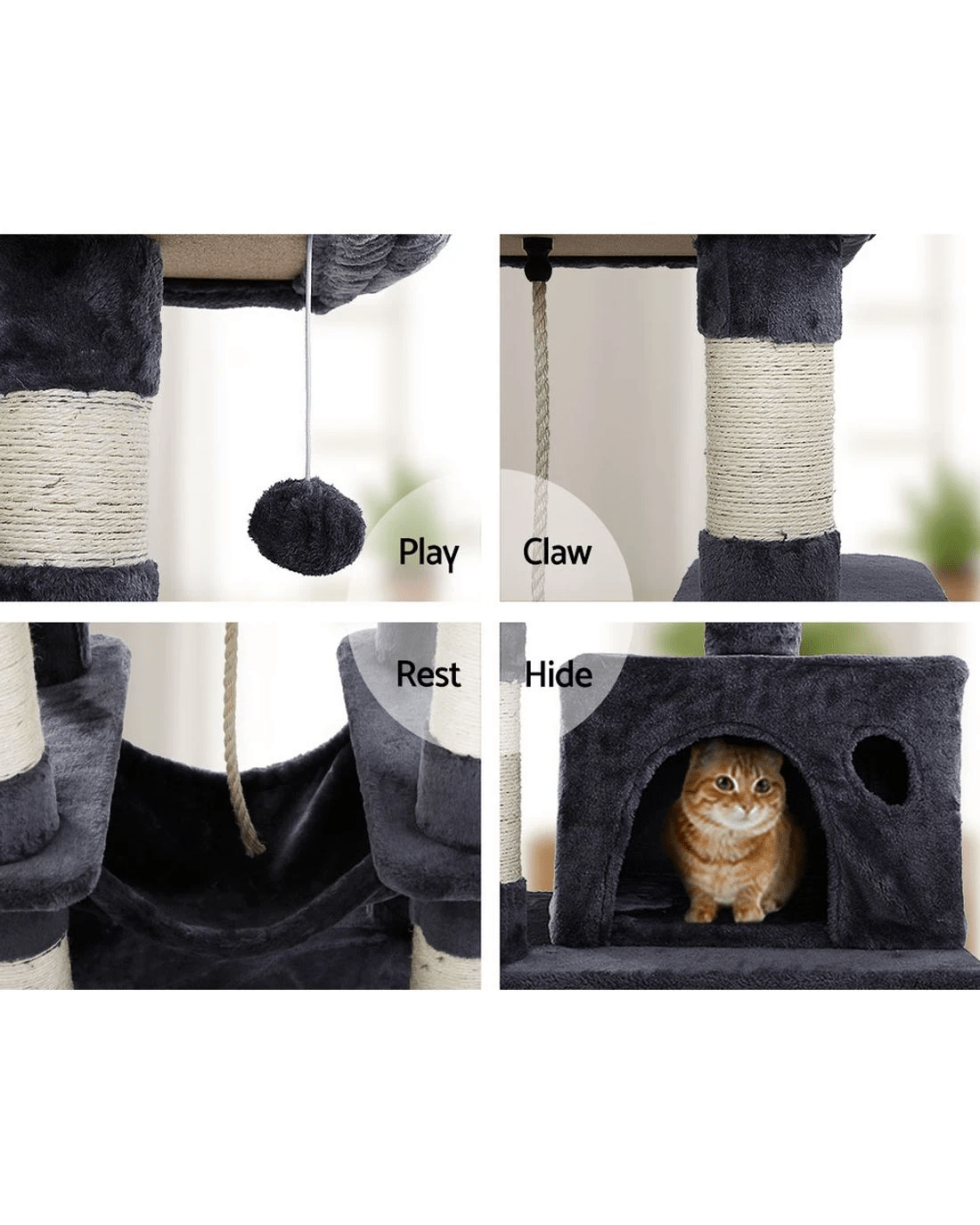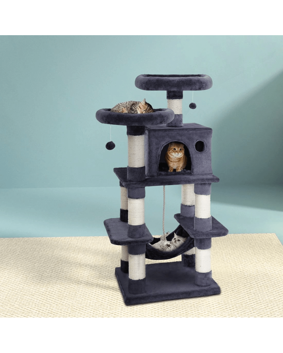 It is an absolutely feline wonderland with our i.Pet Cosmo Cat Tree! Built to satisfy the natural instincts of your precious pet, our cat tree includes a host of nooks and crannies for tom and tabby to have hours of fun scratching, hunting, climbing, jumping, hopping or simply lounging around. Even Garfield would be proud of this tree. Plus, with its sisal-covered scratching posts, you can rest assured that your furniture will stay cat-free for a very long time. Best of all, the sturdy construction with extra-thick 12cm posts and 4cm thick base, much thicker than the standard 6cm thick posts and 2cm thick base of most cat trees on the market, ensures that the tree remains a durable cat haven long into the future with total peace of mind for you. This cat tree is certainly an essential furniture for any cat owner and is just right for your cat's energetic exploration. Can we hear a meow to that?