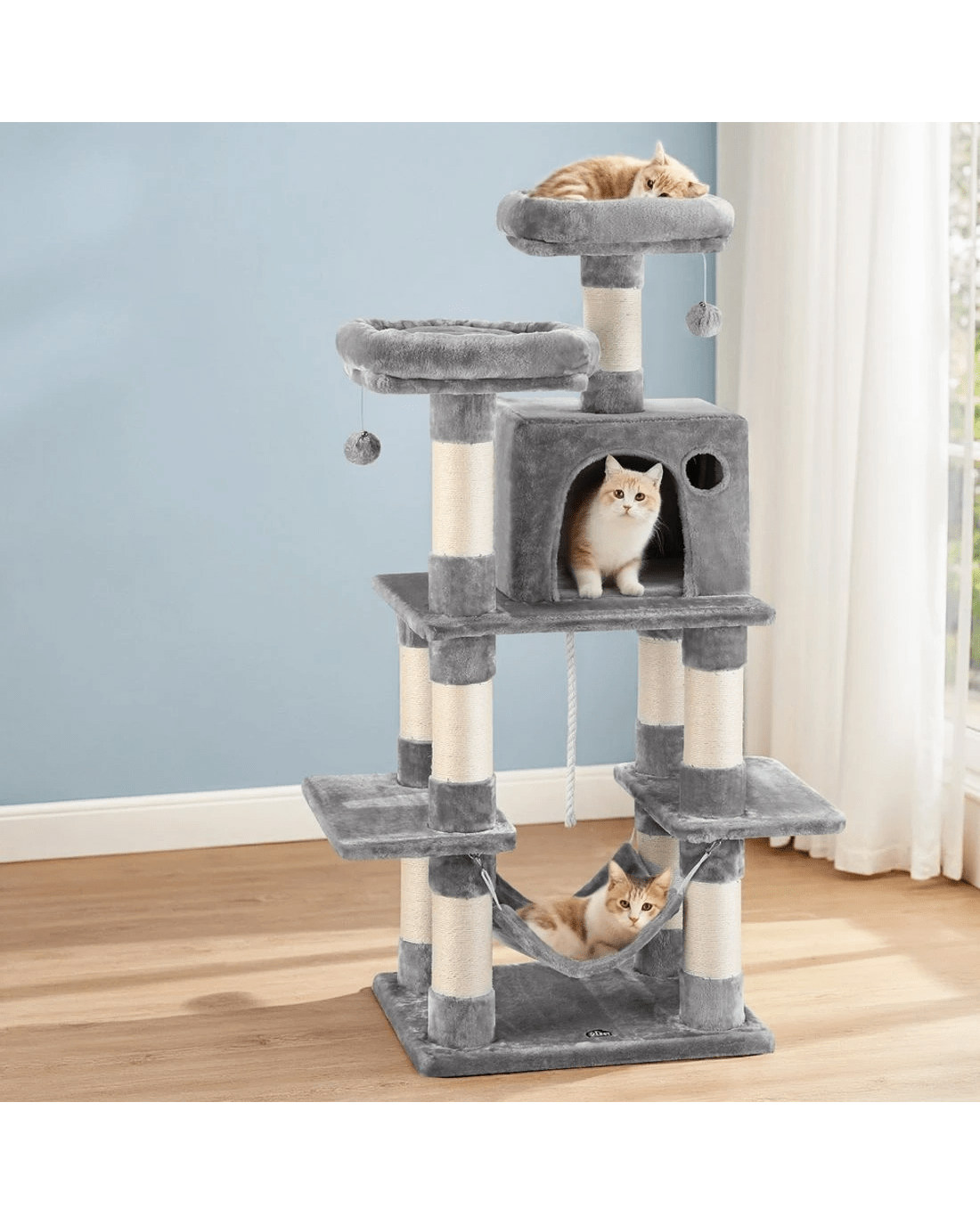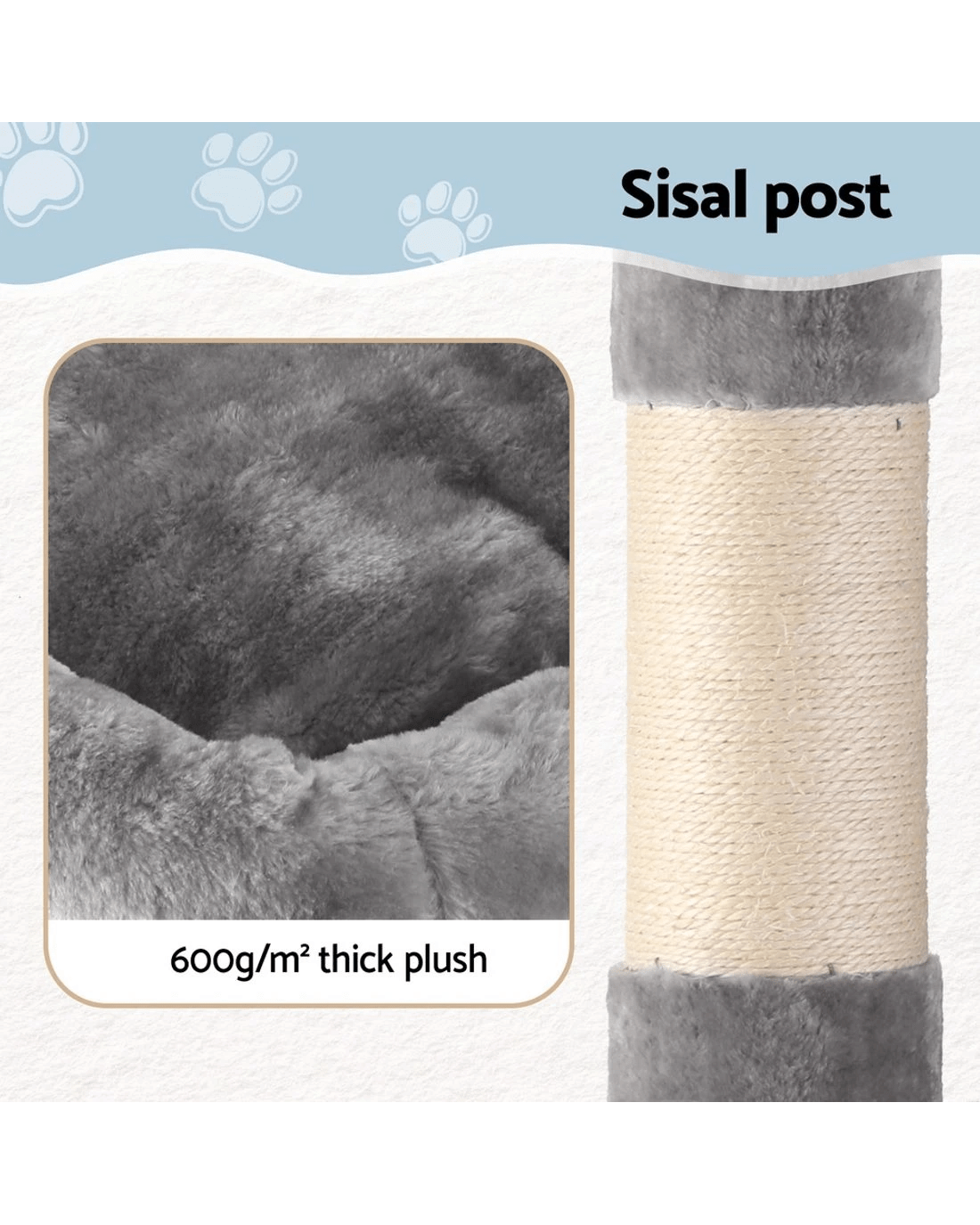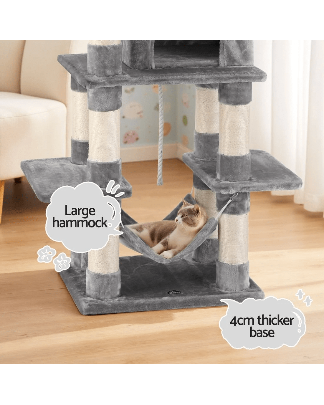 It is an absolutely feline wonderland with our i.Pet Cat Tree! Built to satisfy the natural instincts of your precious pet, our cat tree includes a host of nooks and crannies for tom and tabby to have hours of fun scratching, hunting, climbing, jumping, hopping or simply lounging around. Even Garfield would be proud of this tree. Plus, with its sisal-covered scratching posts, you can rest assured that your furniture will stay cat-free for a very long time. Best of all, the sturdy construction with extra-thick 12cm posts and 4cm thick base, much thicker than the standard 6cm thick posts and 2cm thick base of most cat trees on the market, ensures that the tree remains a durable cat haven long into the future with total peace of mind for you. This cat tree is certainly an essential furniture for any cat owner and is just right for your cat's energetic exploration. Can we hear a meow to that?