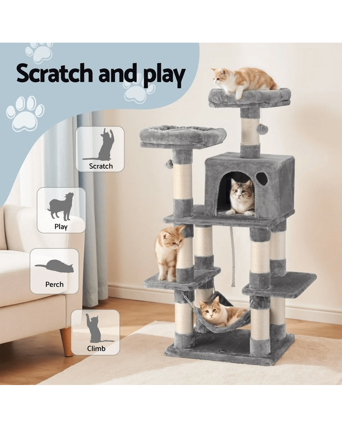Includes scratching, perching, climbing, sleeping all in one piece