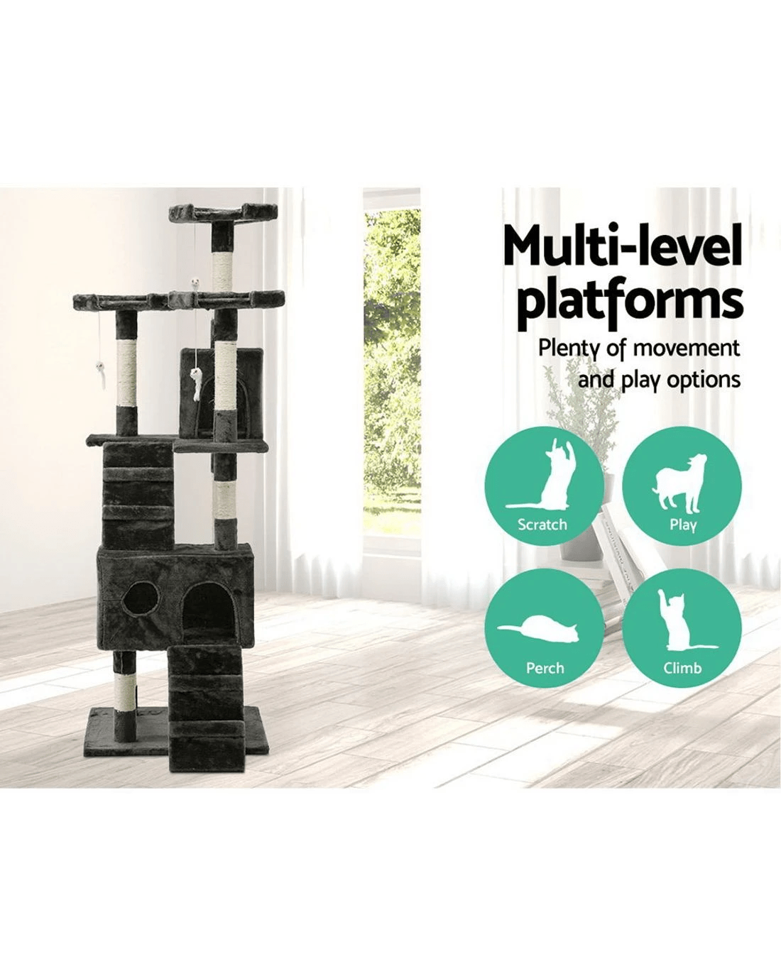 Designed to be a condo that exudes a sense of security, the 1.8m Scratch Tree features cubby holes and platforms of various heights to allow your pet to jump, hop, skip, scratch, rest and nap to its heart's content. And as for its claws maintenance, the fully wrapped 7cm thick sisal covered poles are ideal for your pet to practice her daily regime of keeping its claws in good shape. Besides, it also helps to keep your pet off your expensive furniture too.