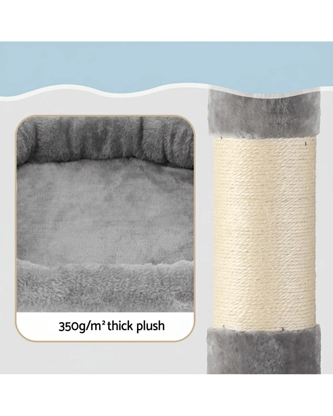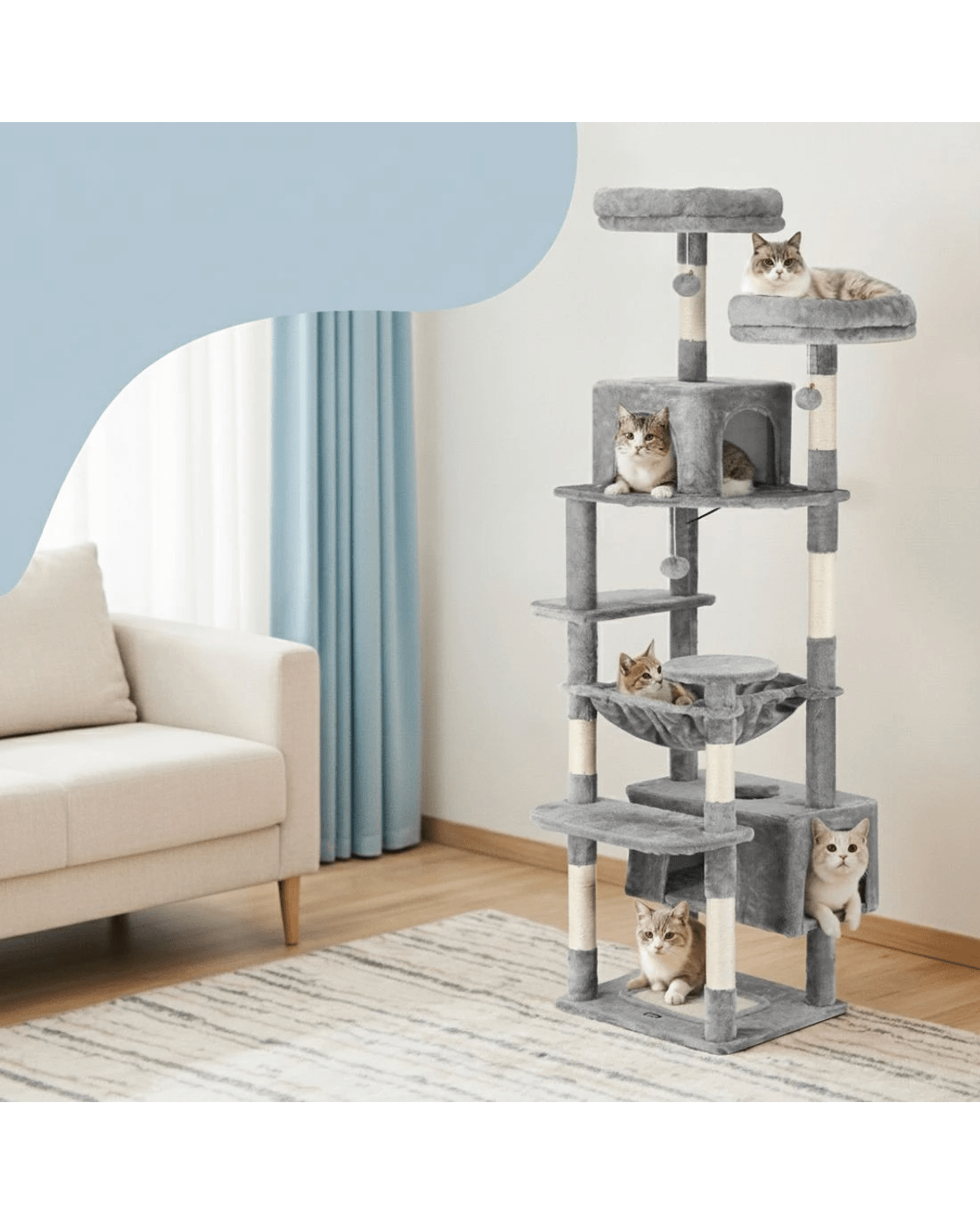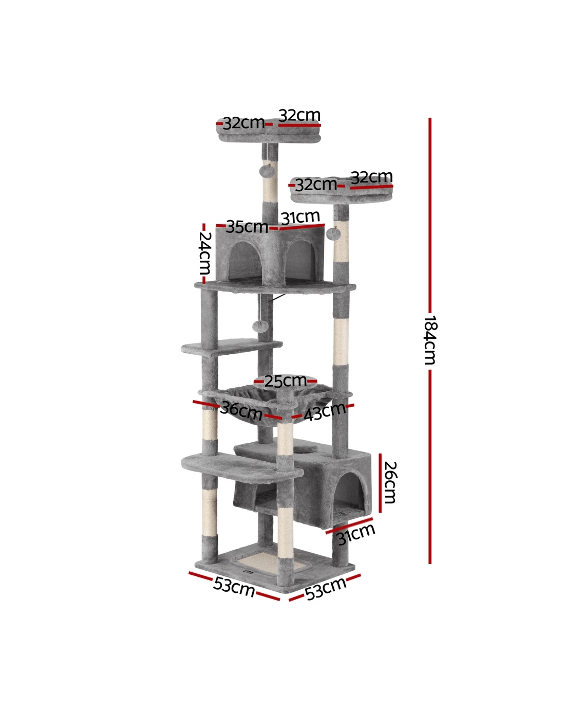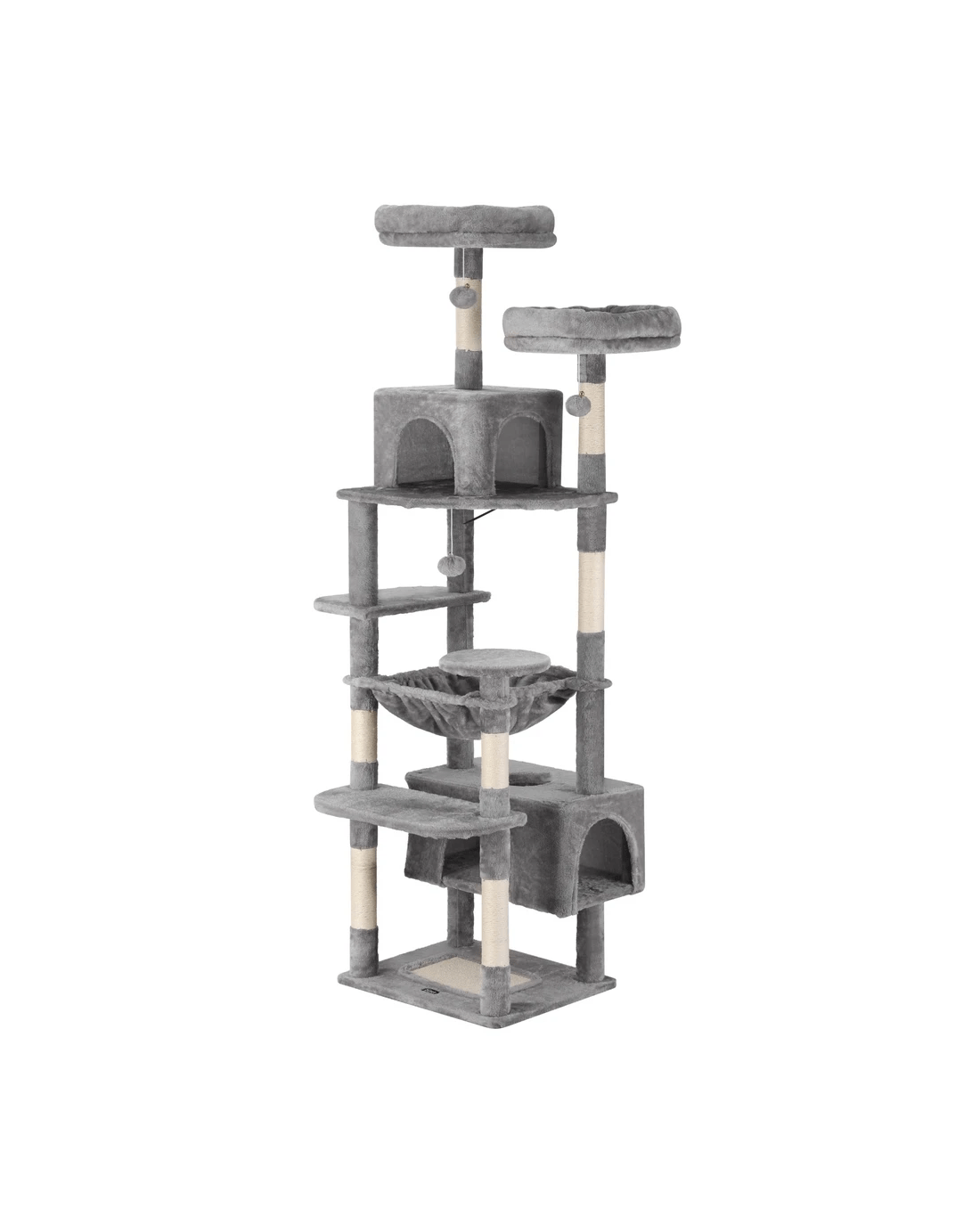 Built to satisfy the natural instincts of your precious pet, our i.Pet Cat Tree includes a host of nooks and crannies for your cats to have hours of fun scratching, hunting, climbing, jumping, hopping or simply lounging around. The tree is made from sturdy wooden construction and upholstered with a plush scent- and chemical-free velvety linen surface for extra comfort and style. The hanging and standing balls will keep your cat curious and alert. Natural woven sisal twine towers encourage your cat's scratching instincts while keeping your furniture scratch-free. Best of all, the firm base ensures that the tree remains a durable, solid-standing cat haven with total peace of mind for you. Can we hear a meow to that?