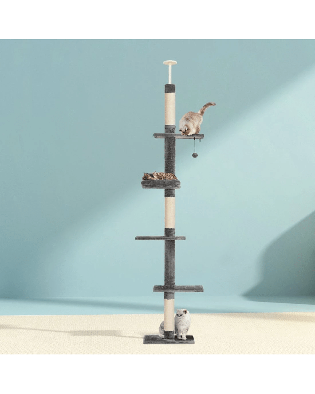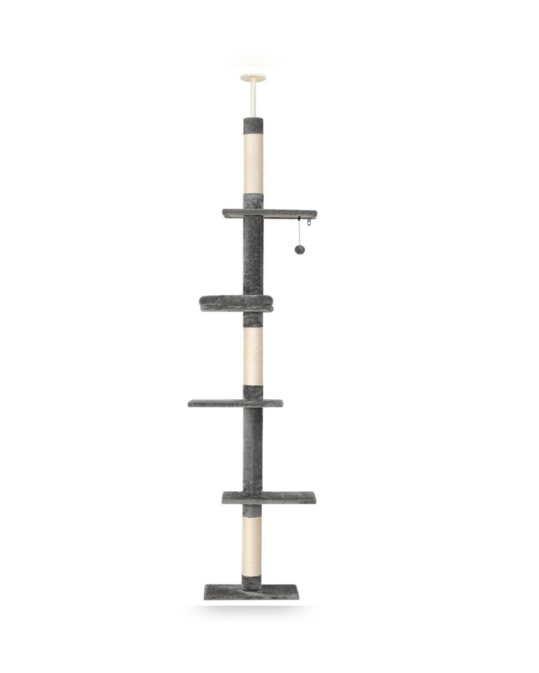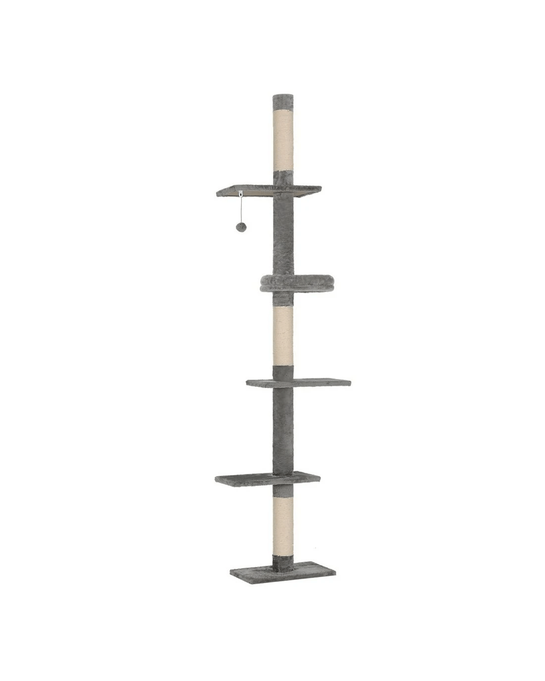 Give your cat a fun place to play and rest without sacrificing space with the floor-to-ceiling Cat Tree from i.Pet. With various playing and napping spots, your cat can have fun and frolic without taking up floor space. Made from a sturdy wood construction with a stable base, the cat tree will stand tall and proud. Wall mounting tools are included for additional stability. Adjust the height of the tree to accommodate different homes and cat preferences. Natural sisal posts encourage your cat's scratching instincts and keep them away from your furniture. A hanging toy encourages playful hunting behaviour, while the multi-layer design with 5 distinct platforms allows your cat to sit on high and observe the home. The soft, plush cover is easy on hands and paws. With the i.Pet floor-to-ceiling Cat Tree, your cat will be able to express its natural instincts in safety, comfort and style.