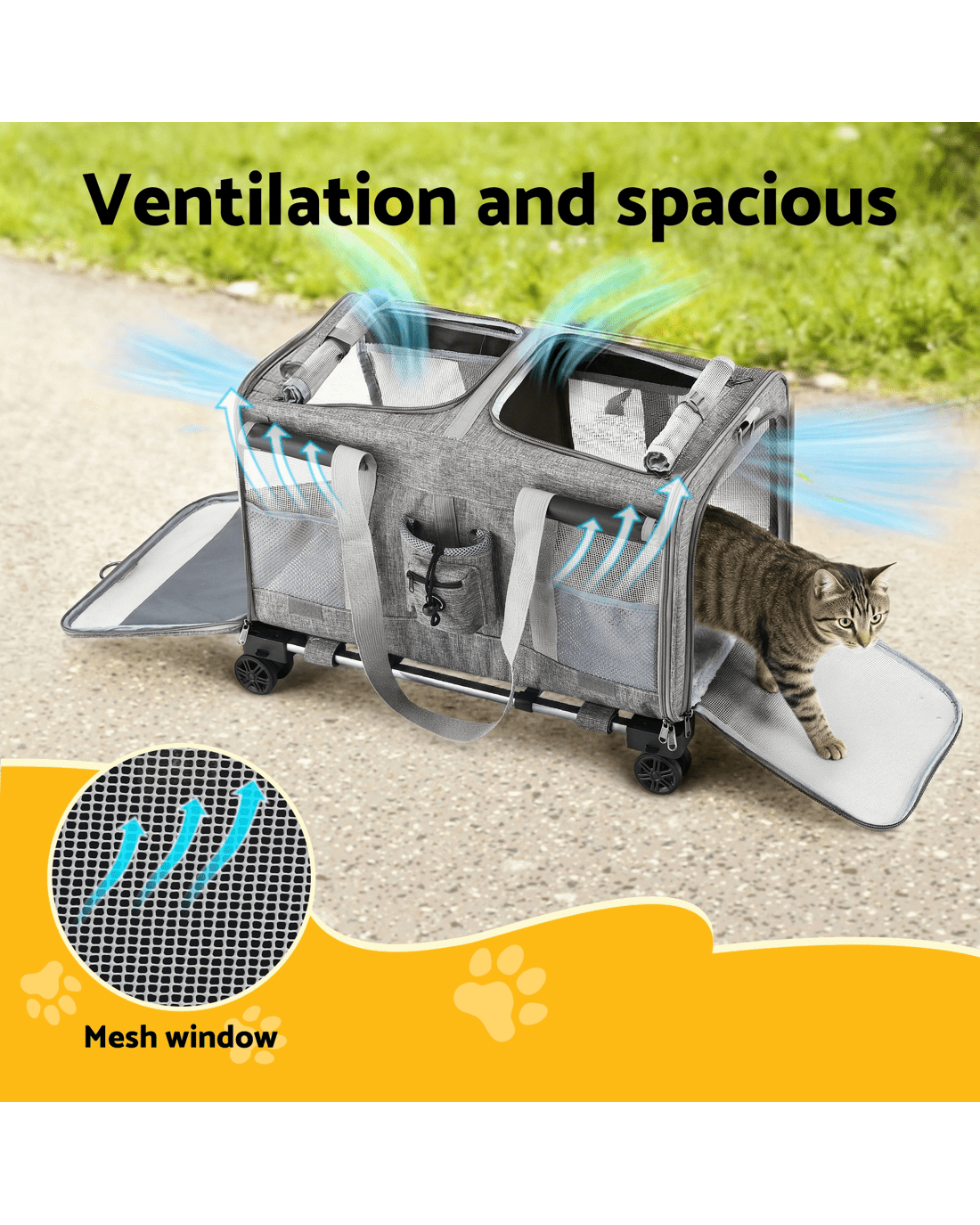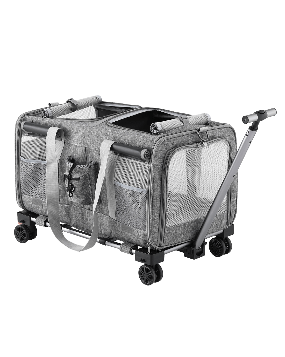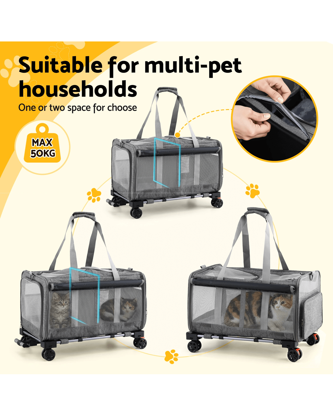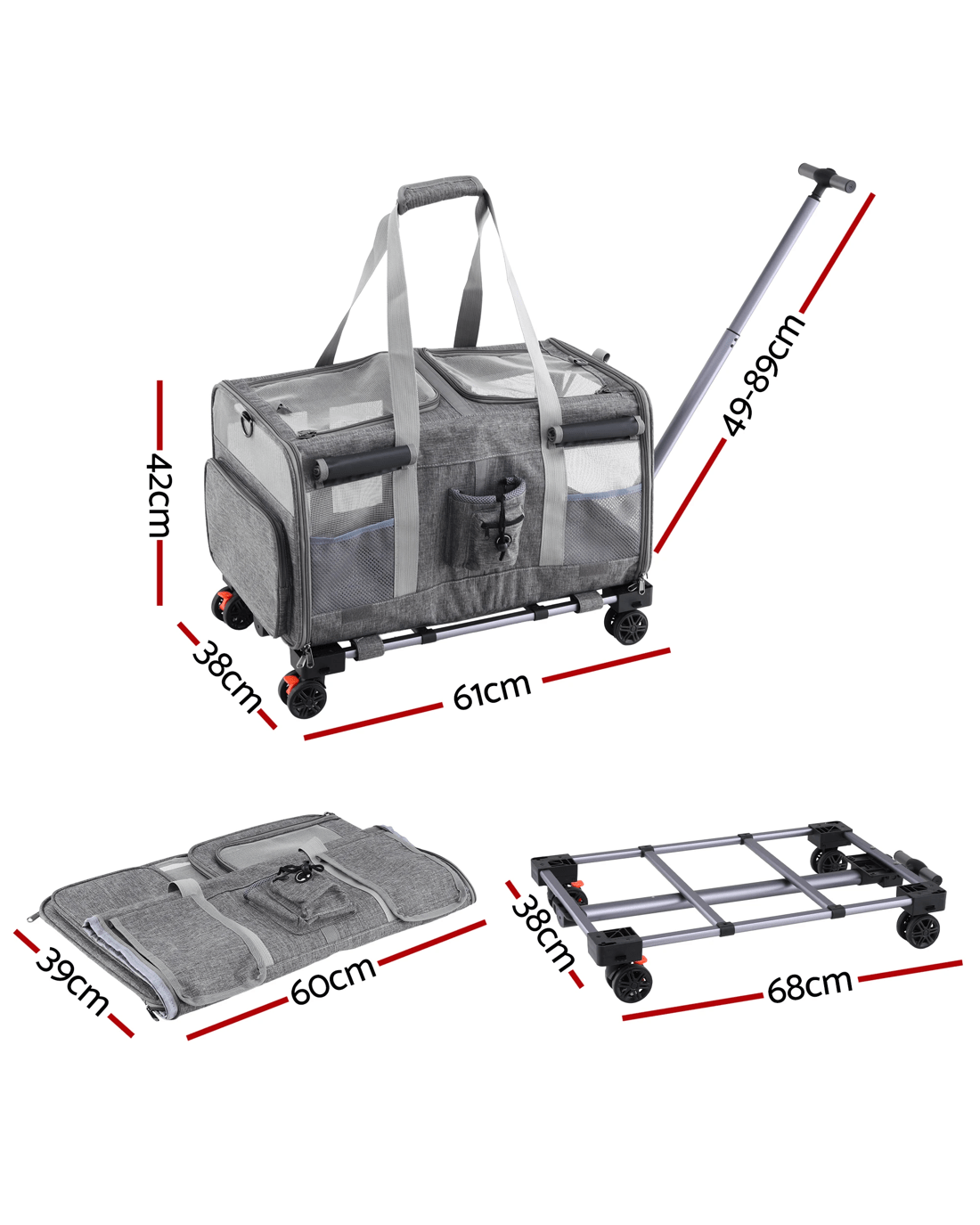 For the pet owner who needs a reliable and easy way to transport their larger furry mate, the i.Pet Premium Pet Trolley Carrier is a game-changer. Combining the durability of a high-quality carrier with the convenience of a smooth-rolling trolley, this is the perfect solution for vet visits, moving house, or any journey across the landscape.Heavy-Duty and Effortless Mobility Designed to handle pets up to a substantial 50kg, this carrier is built with a robust aluminum frame and covered in high-quality Oxford fabric. The standout feature is the effortless mobility provided by the Telescopic Handle and 360° Swivel wheels, allowing you to push or pull your pet with minimal effort, even when fully loaded.Versatile and Comfortable Design This carrier offers Versatile usages, functioning as a trolley, a traditional carrier with a Durable handle, or even a backpack with the Adjustable shoulder strap (approx. 76-115cm). Inside, your pet will enjoy a Ventilation and spacious environment, thanks to the breathable and see-through mesh window. The removable and washable mat ensures a clean and comfortable ride.Safety and Convenience Safety is paramount, which is why the carrier includes a Built-in safety clip to secure your pet. Access is simple with the Smooth and easy to open zipper. When not in use, the Foldable and portable design makes storage easy. This carrier is Washable and easy to clean, making it suitable for both Indoor and outdoor use.