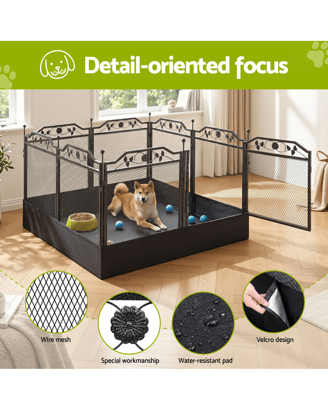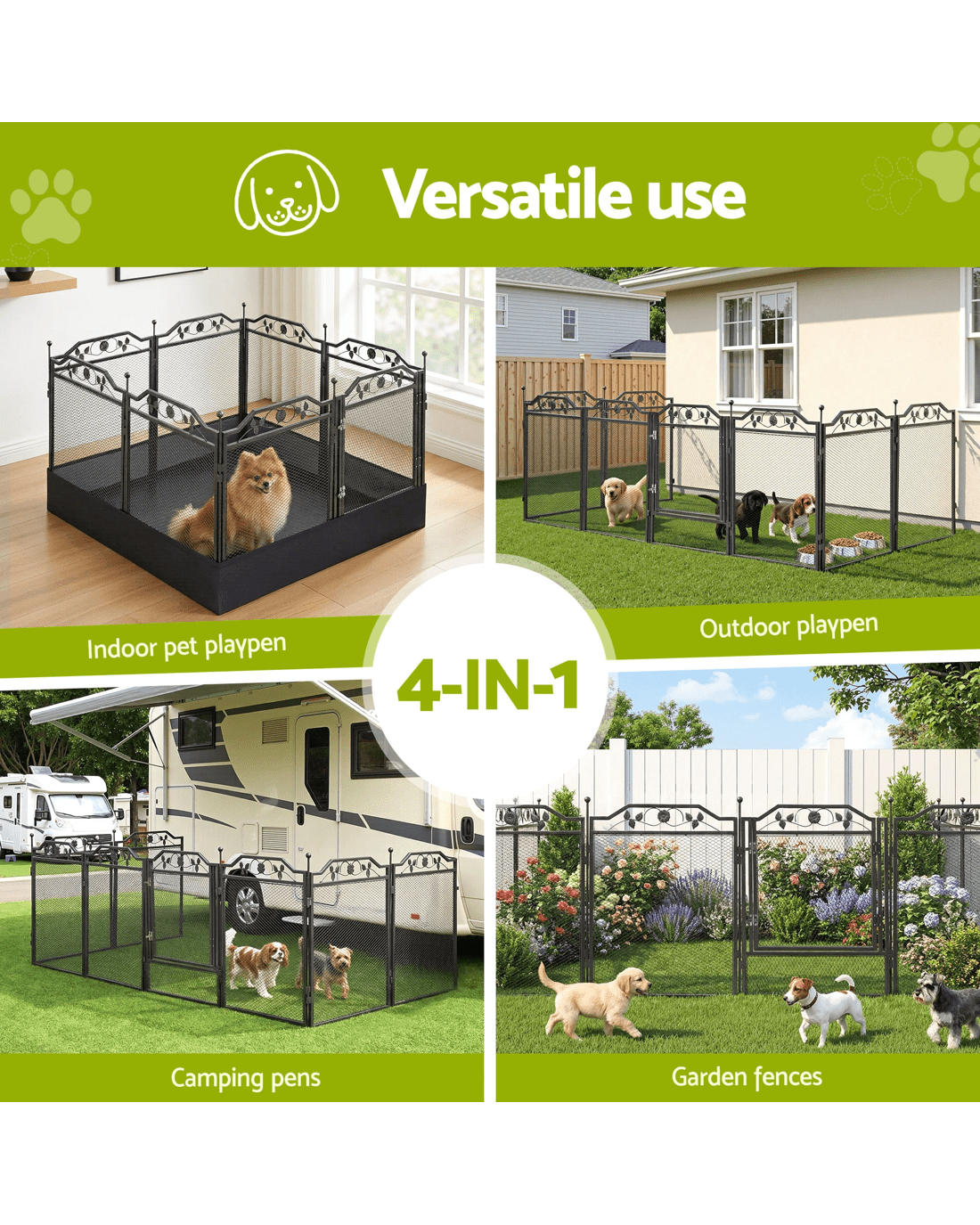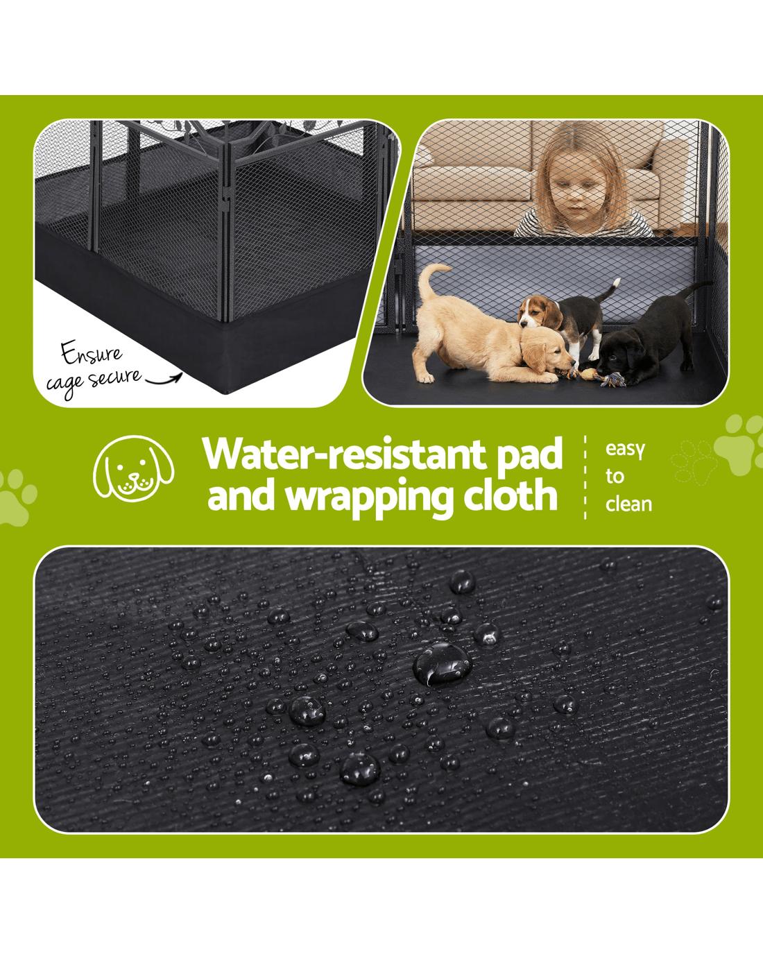Designed with the pet owner in mind, this heavy-duty pet playpen provides a safe and spacious enclosure for a variety of small to medium pets, including puppies, dogs, rabbits, guinea pigs, and even ducks. Whether you're house-training a new puppy or setting up a secure outdoor run for your rabbit, the multi-configuration design offers the flexibility to adapt to your home or yard.The playpen is constructed with strong steel frames to ensure exceptional durability and stability. A sleek black powder-coated finish not only looks great but also enhances the frame's resistance to wear and tear, making it perfectly suited for both indoor and outdoor use. Safety is paramount, which is why the access door is fitted with a secure lock system to keep your pets safely contained within the dog enclosure.The innovative 4-IN-1 usage allows you to easily set up the pen in various shapes to suit your space. It also comes complete with a water-resistant pad and wrapping cloth for added comfort and floor protection. Assembly is a breeze—a simple set up means no tools required, so you can create a safe zone in minutes. When it's time to pack up, the pen is easily foldable for convenient storage and transportation, making it an ideal portable solution for travel.