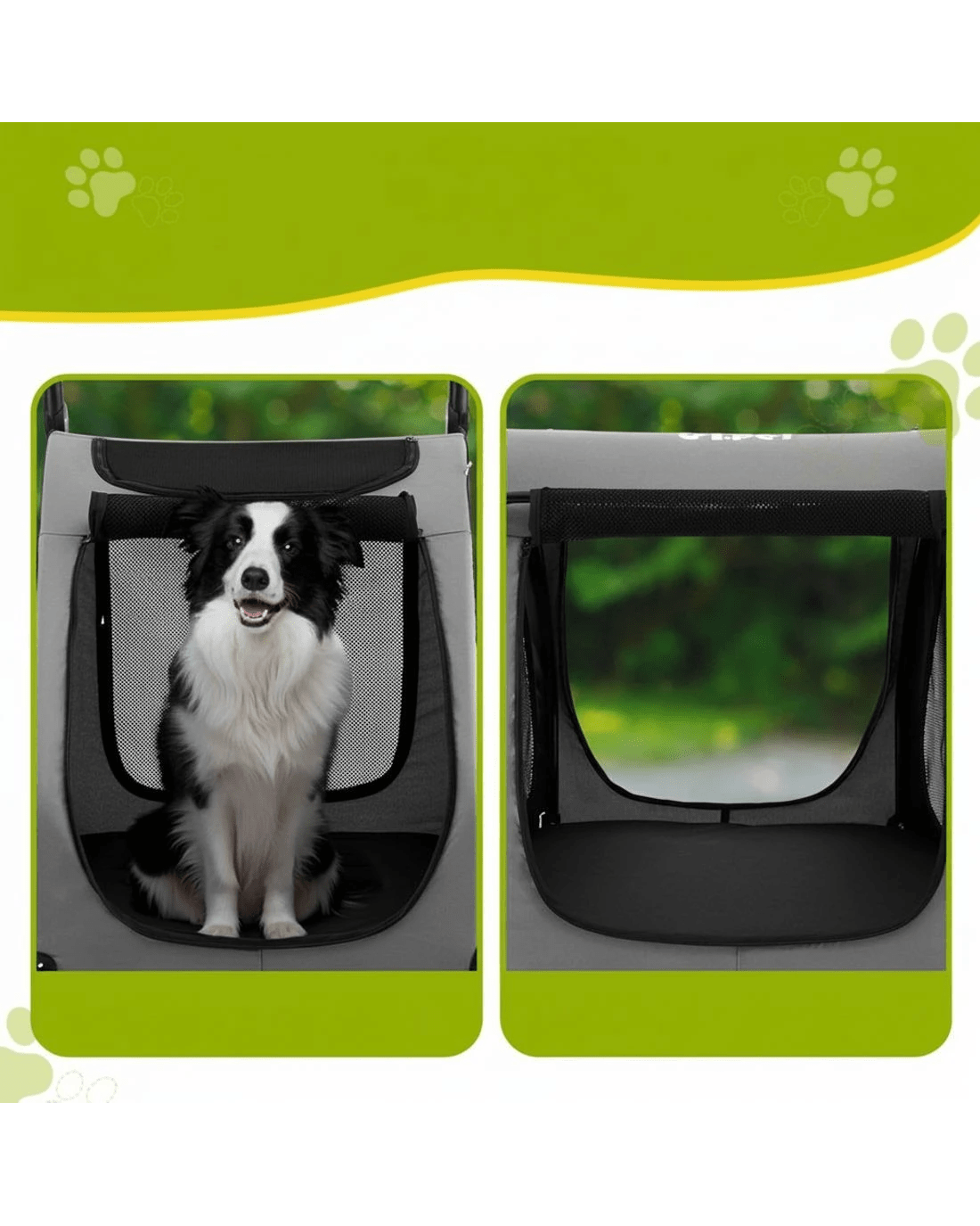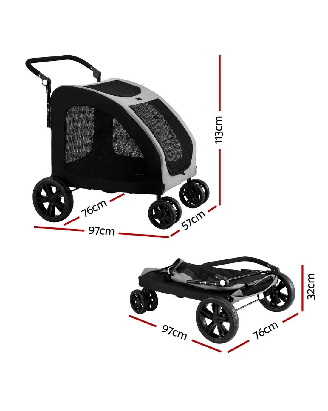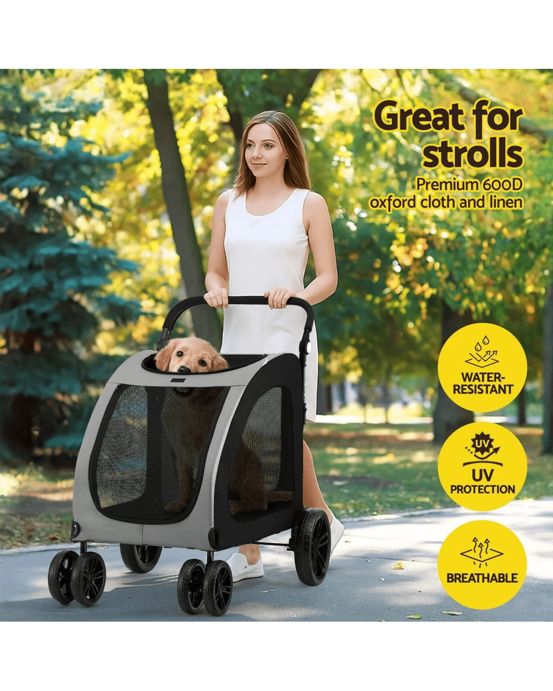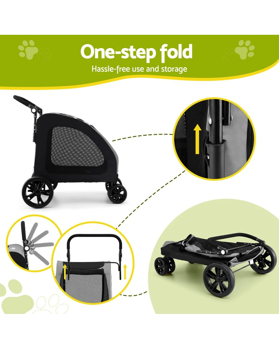i.Pet's pet stroller is perfect to take your furry friend on strolls, especially if you're planning to take those slightly longer strolls that can get you sweating. Or it's a great accessory if your pet is suffering from mobility issues but wants to get outdoors. Featuring a spacious interior, our pet stroller features front and rear entrances with a zippered design that allows easy access. And the mesh window offers good visibility and allows proper airflow as you take your pet for a stroll. This pet stroller is made from high-quality 600D oxford and linen fabric with steel structure and EVA wheels that ensures sturdiness and durability for longlasting use. It comes with 360Ëš rotatable front wheels and lockable rear wheels for smooth movement and safety. Additionally, the built-in safety leashes keep your pets safe, and the UV-resistant material protects them from harmful sun rays. Our pet stroller is quite spacious that ensures your pet's comfort and comes with a removable cushion for additional support. Furthermore, this water-resistant pet stroller is easy to install and features a one-step fold mechanism that allows easy storage, and the foam handle makes it extremely comfortable for you as you tour them at the park or around the neighbourhood. Without any hesitation, shop our reliable and durable i.Pet's pet stroller for your furry companions.