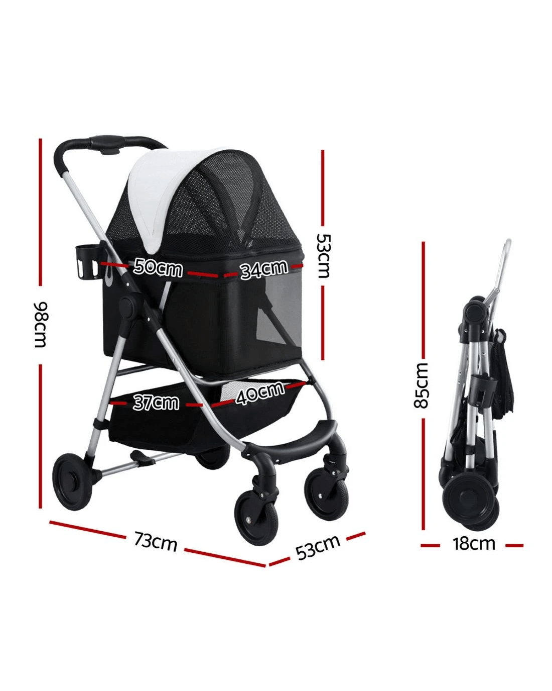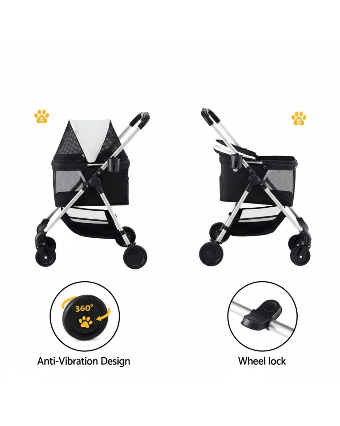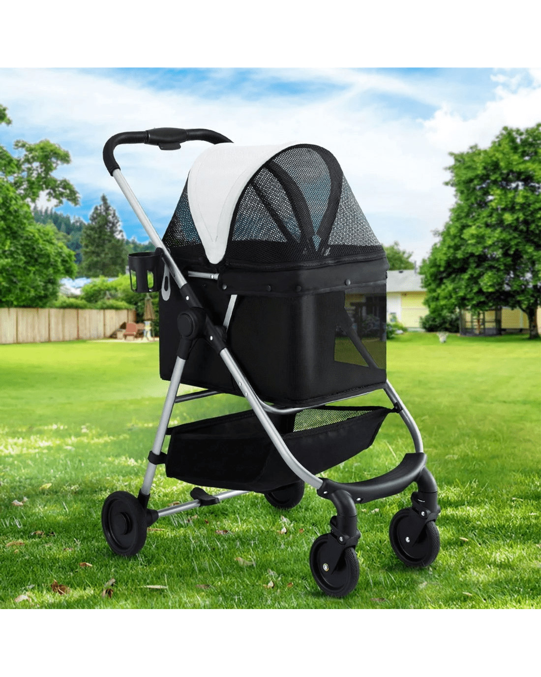 Do you love going outside with your pets? Go for walks hassle-free with an i.Pet Pet Stroller. Our stroller features a frame made from quality powder-coated steel and breathable, durable, water-resistant Oxford cloth and linen. Moving and maneuvering the stroller is effortless with its lockable rear wheels and 360-degree front wheels. It has a convenient bottle holder, a spacious storage basket, built-in safety belts and a see-through mesh window so your pets can see you and the world around them. The convenient foldable design allows you to not only pull back the mesh canopy but completely detach the basket and fold the stroller for storage. You and your pets can enjoy the best the outdoors has to offer with an i.Pet Pet Stroller.