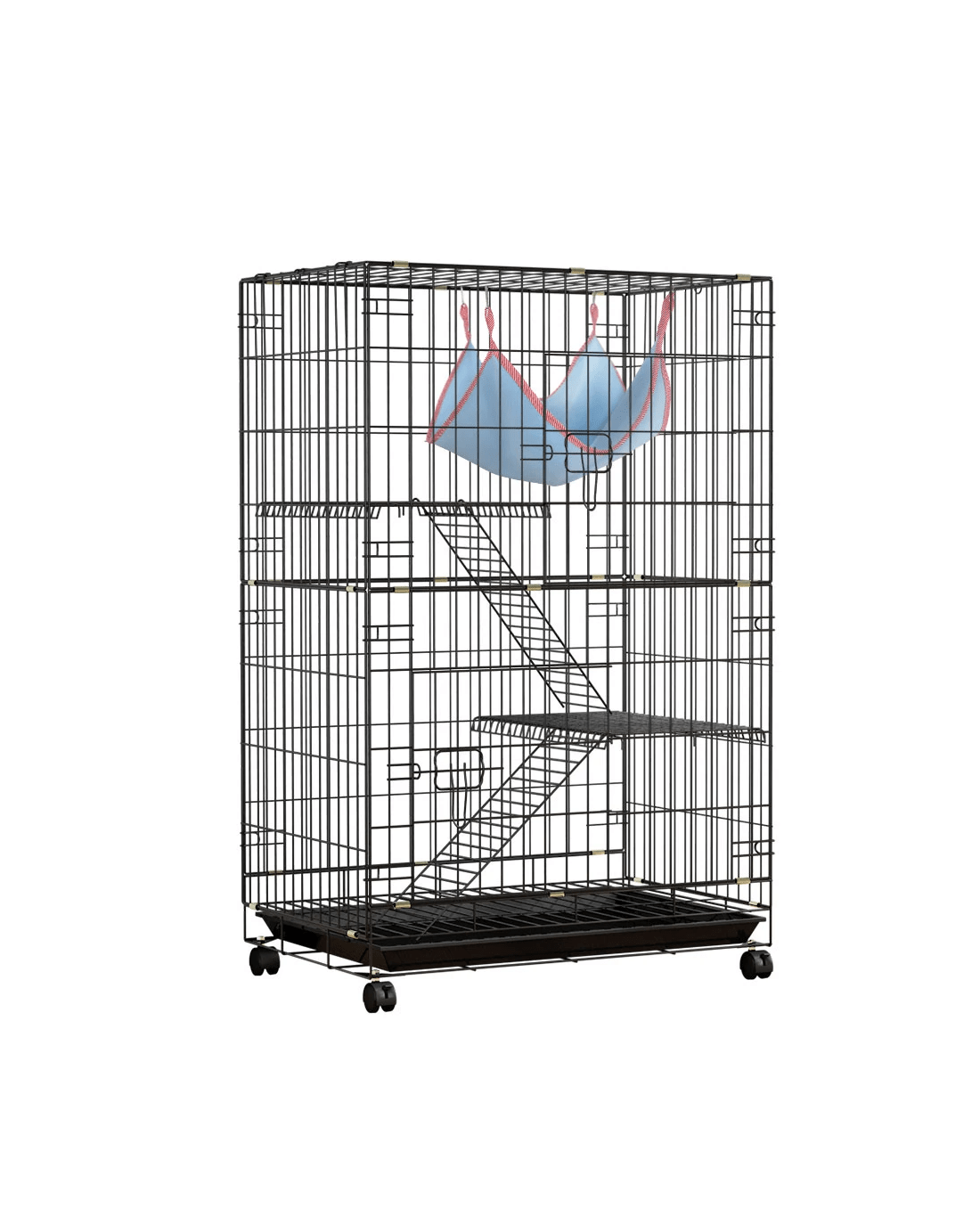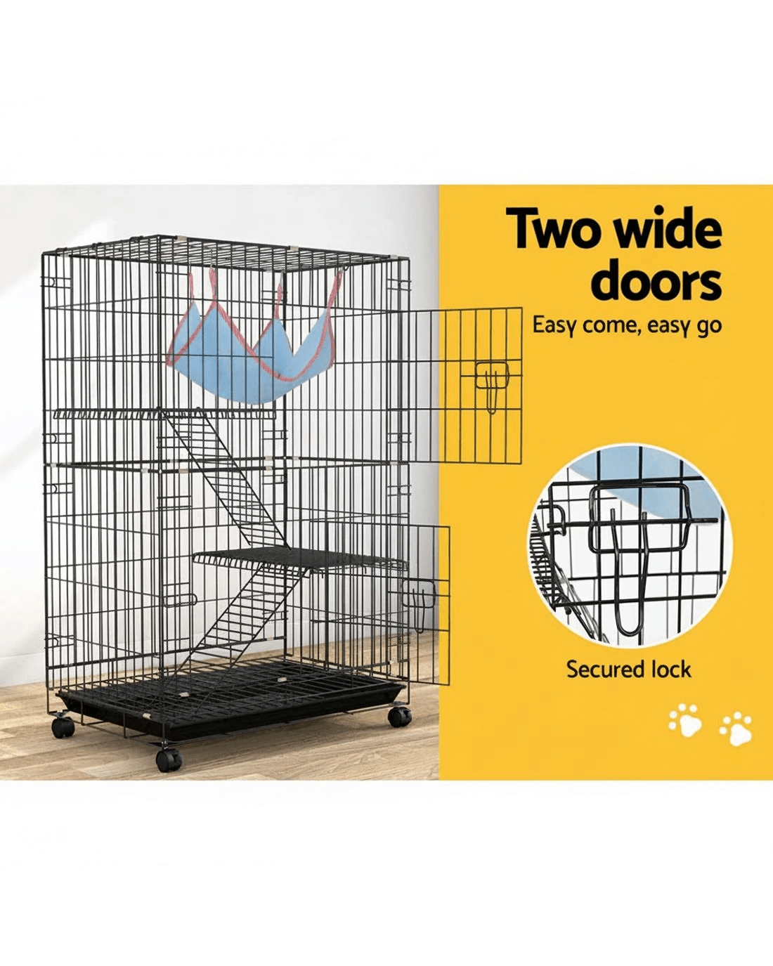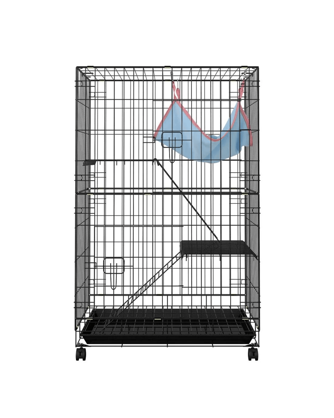 Give your beloved pets a safe and comfortable home to sleep, rest, play, and relax. The i.Pet's pet cage makes a cosy home for your dear pets that they will love and cherish forever. This pet cage is suitable for smaller pets such as rabbits, guinea pigs, cats, ferrets, and chinchillas. Our pet cage features a three-level design and comprises two removable ladders, one swing hammock, two removable platforms, and an easy-to-access tray. Your pets will have a great time climbing on the ladders, playing on the platforms, and resting in the swing hammock. Our pet cage features sturdy rust-resistant black powder-coated wrought iron construction that ensures its durability and long-lasting use, and the smooth castor wheels offer maximum portability. It has large access doors that make feeding a breeze, and the open-panelled cage design will allow proper airflow and keep them well-ventilated. The pet cage is also equipped with locks, which provides them with a sense of security from prying predators. This pet cage will give your beloved pets the utmost joy and pleasure. Gift this pet cage to pets today, and be sure to get much love in return.