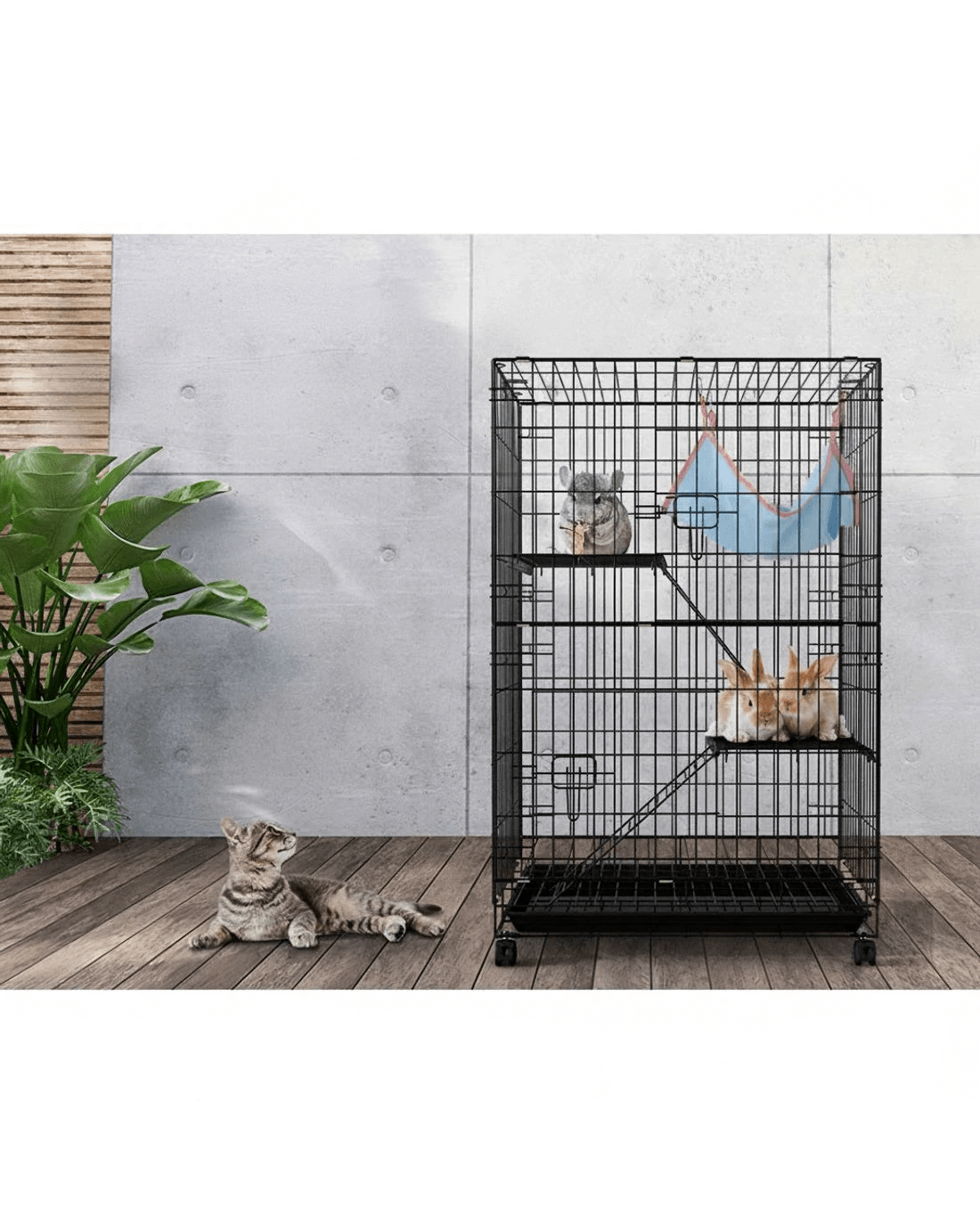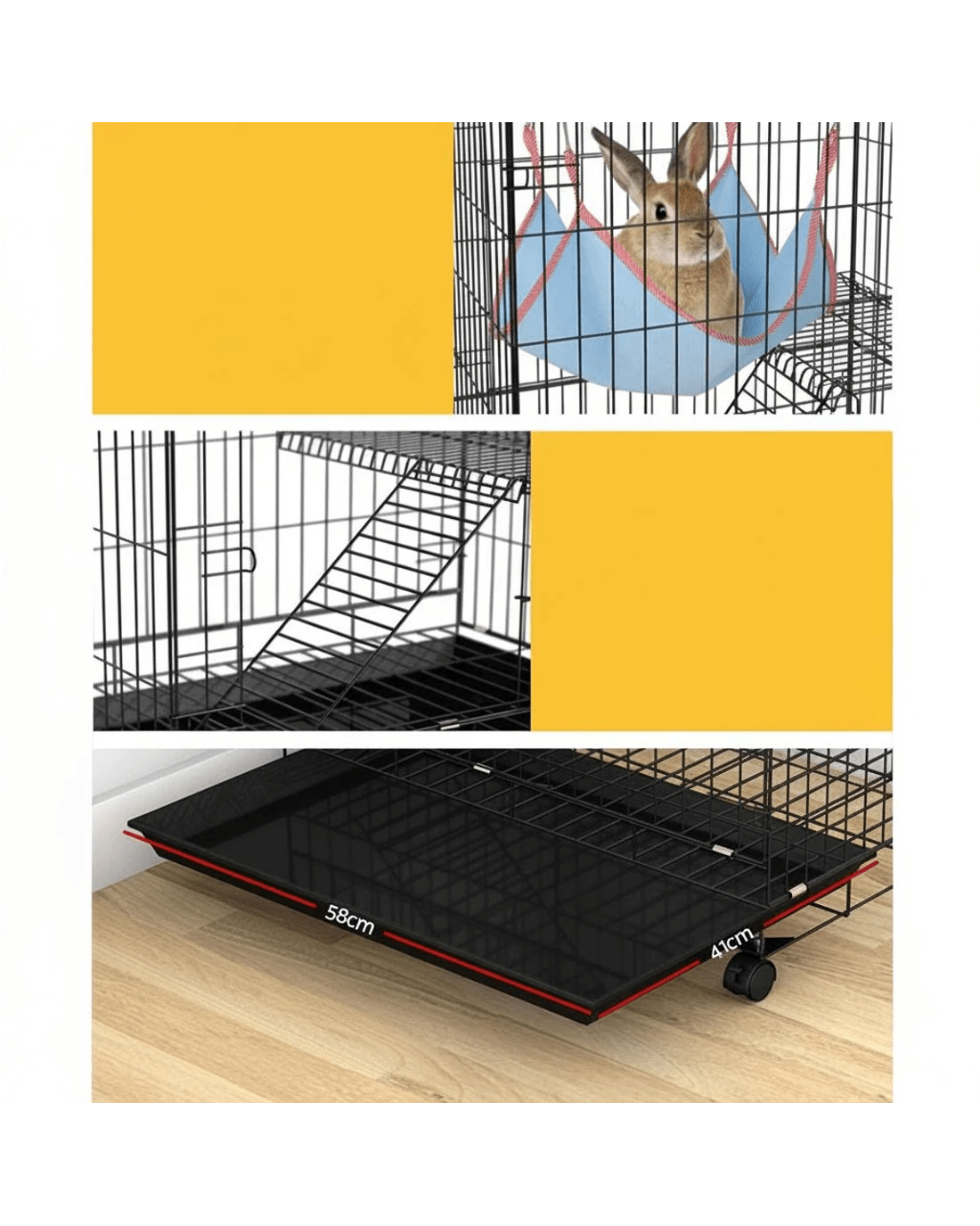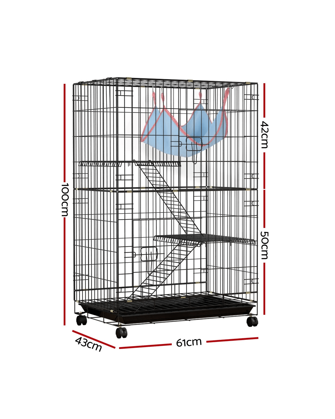 Give your beloved pets a safe and comfortable home to sleep, rest, play, and relax. The i.Pet's pet cage makes a cosy home for your dear pets that they will love and cherish forever. This pet cage is suitable for smaller pets such as rabbits, guinea pigs, cats, ferrets, and chinchillas. Our pet cage features a three-level design and comprises two removable ladders, one swing hammock, two removable platforms, and an easy-to-access tray. Your pets will have a great time climbing on the ladders, playing on the platforms, and resting in the swing hammock. Our pet cage features sturdy rust-resistant black powder-coated wrought iron construction that ensures its durability and long-lasting use, and the smooth castor wheels offer maximum portability. It has large access doors that make feeding a breeze, and the open-panelled cage design will allow proper airflow and keep them well-ventilated. The pet cage is also equipped with locks, which provides them with a sense of security from prying predators. This pet cage will give your beloved pets the utmost joy and pleasure. Gift this pet cage to pets today, and be sure to get much love in return.