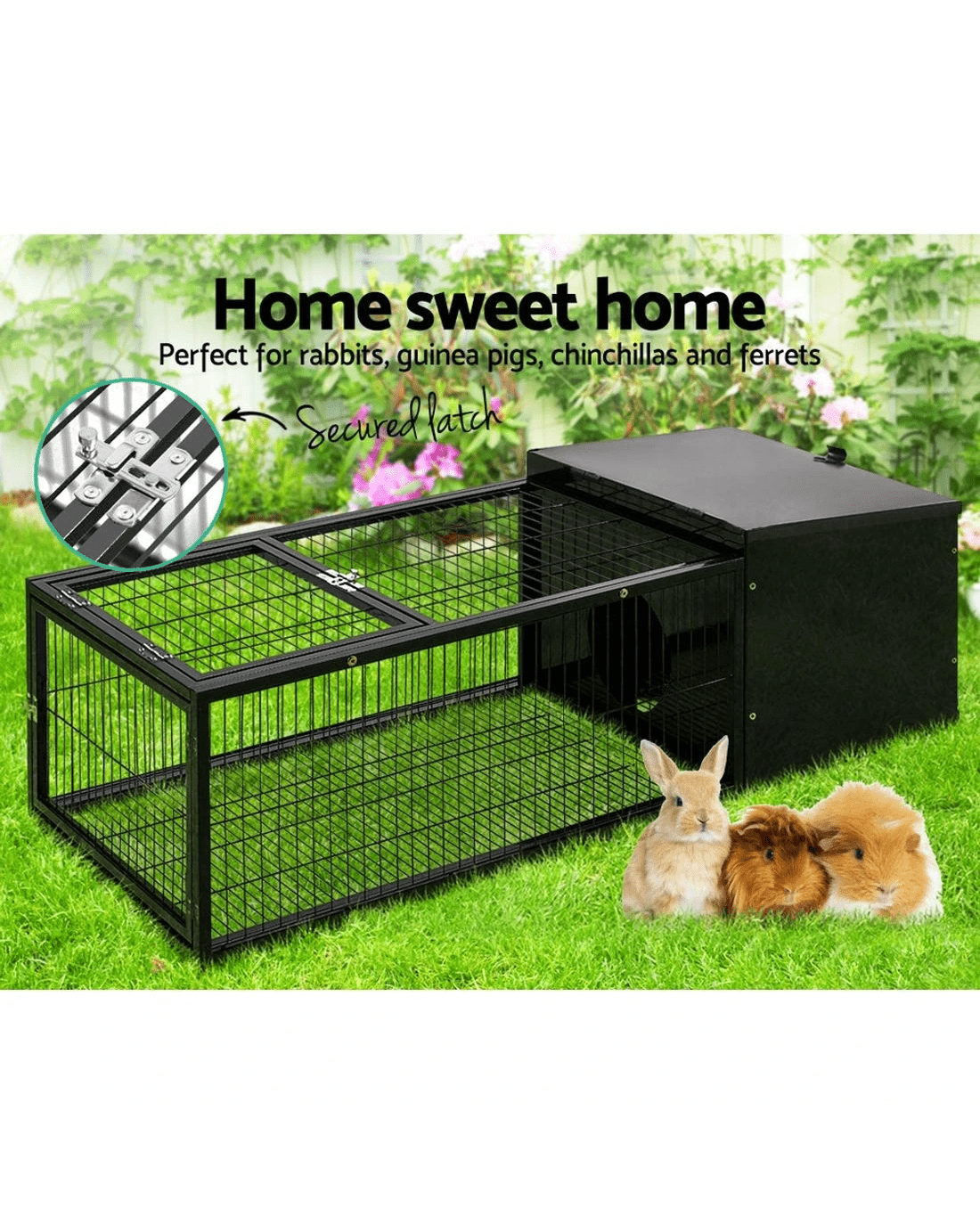 Attached securely to this shelter is a long, weather-roof metal cage that lets your precious ones stretched their legs, have a nibble at the grass or enjoying some fine fresh air and sunshine. The metal cage has lockable openings at the top and front to get your pets in and out in a jiffy or to feed them. Not least, the chew-proof metal frame ensures no easy escape for your pets or unwelcomed break-ins by predators.