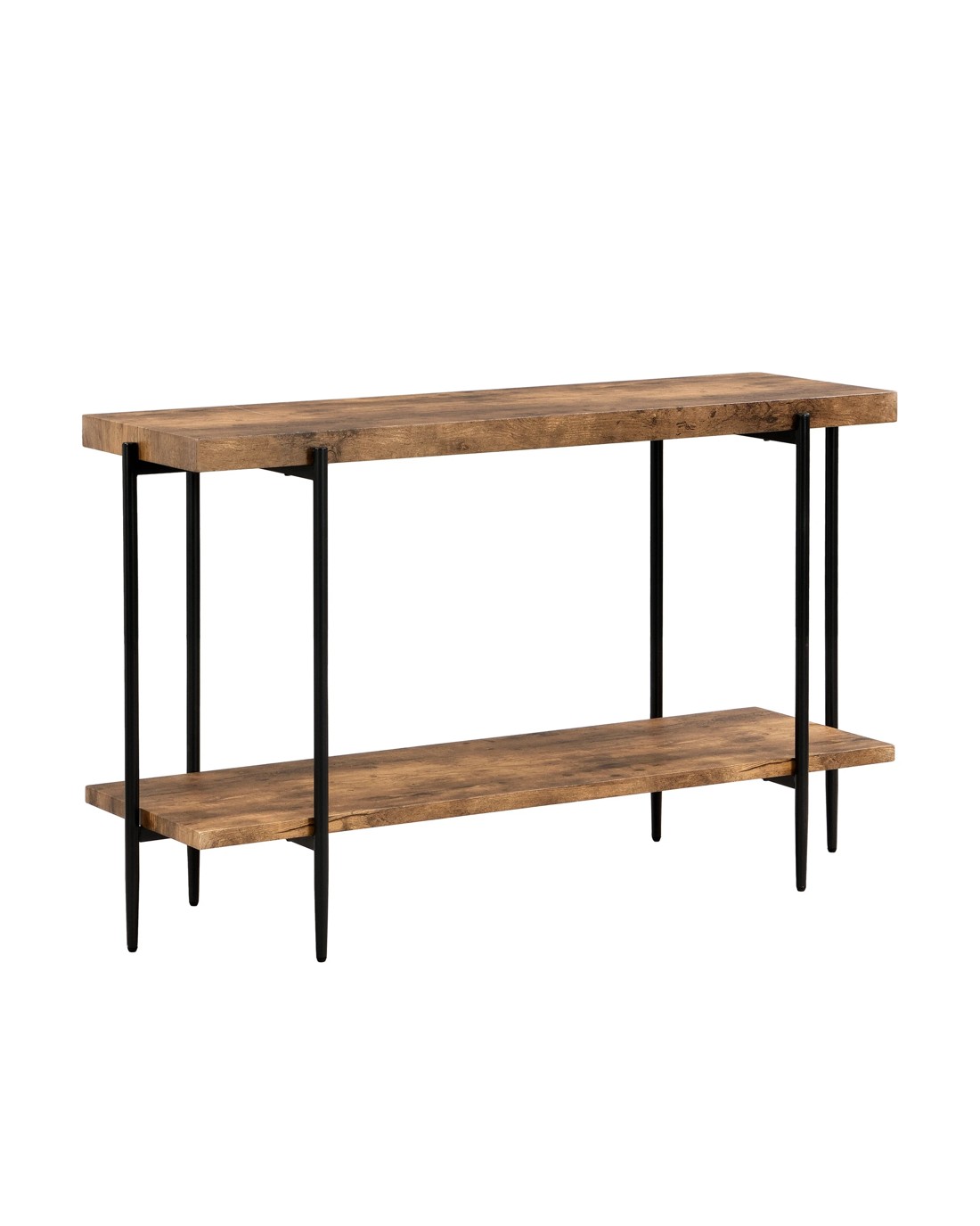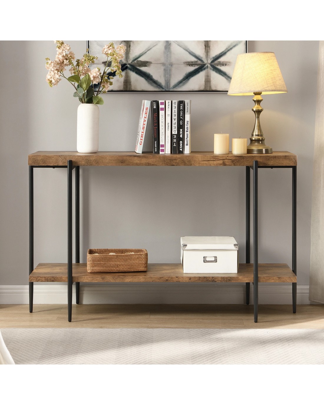 Extra Long Console Sofa Table 135cmW Dark Brown Descriptions Industrial Rustic Style:Defined by its clean lines and minimalist design, this understated console table brings a touch of industrial inspiration to your living room or entryway. Simultaneously, made to tie in with your unique style easily. Multifunctional:you can choose to use it in your foyer as a console table, living room as a sofa table or home pub as a bar height table Sturdy & Durable Construction:This sofa table crafted from a durable premium MDF board and quality steel frame to ensures stability and durability. Adjustable feet can prevent wobbling from uneven places and protect the floor from scratching. Product Details Shelf Material: MDF board(not solid wood)+ melamine surface Frame Material Details: Steel with black painting Primary Colour: Dark Brown Minimal assembly is required, recommend 2 persons Care Instructions: wipe clean & polish frame with microfibre cloth; to protect against scratching & general wear, use of coasters & placemats is highly recommended Dimensions Overall Dimension:81cm H x 135cm W x 45cm D Top shelf dimensions:5cm H x 130cm W x 40cm D Bottom shelf dimensions:2.5cm H x 130cm W x 40cm D Shelves to Shelves Distance:54.8cm Clearance from shelf bottom to floor:18.5cm Each shelf Weight capacity:30kg Overall Product Weight Capacity: 60 Kg Box content 1 x Console Table 1 x hardware pack 1 x assembly manual