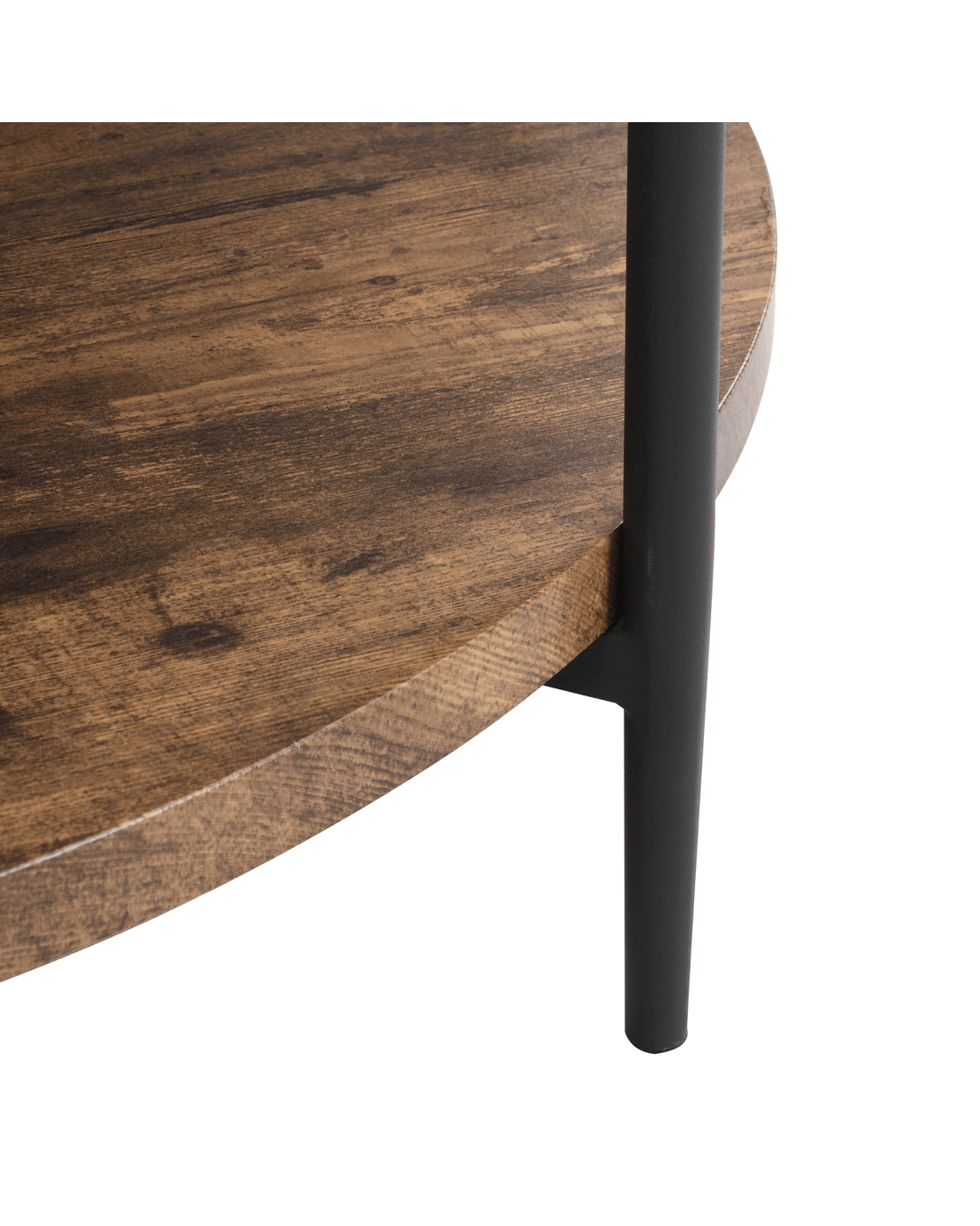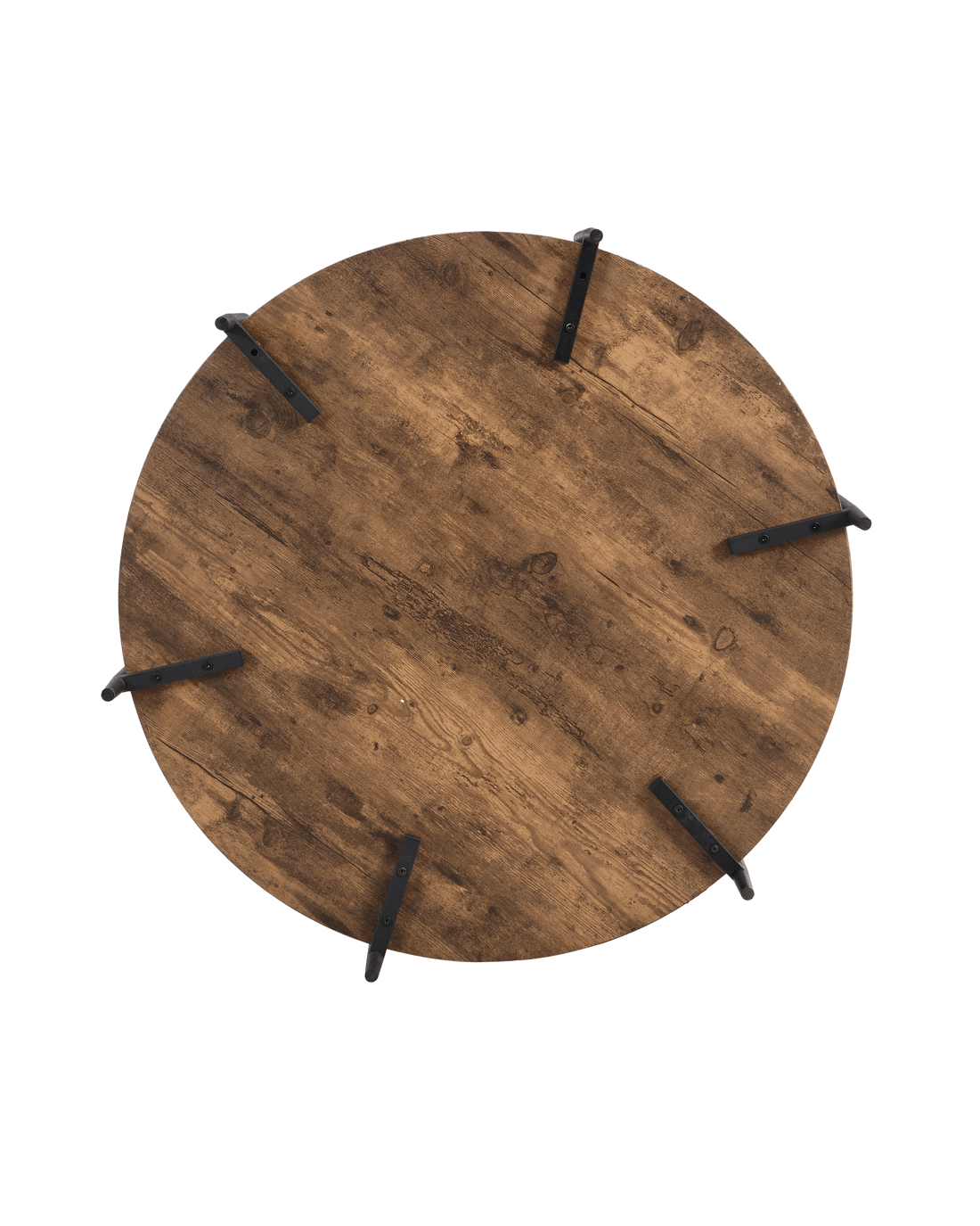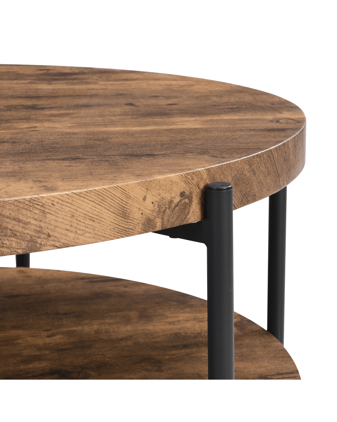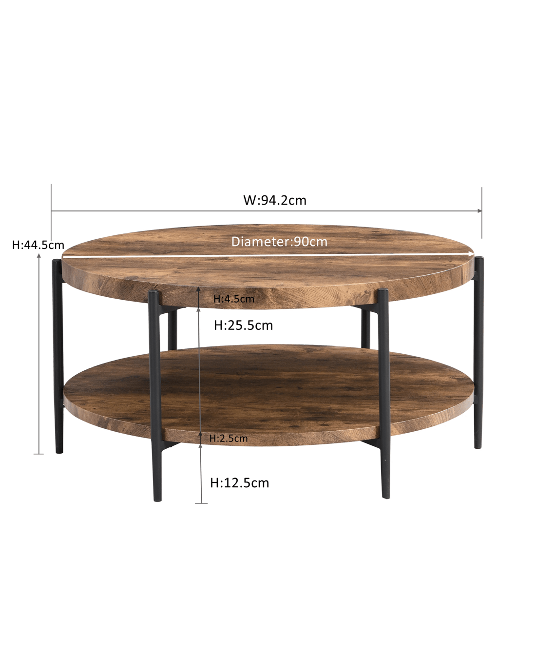 2-Tier Industrial Wooden Round Coffee Table with 6 metal legs Rustic Dark Brown About this item Two Tier Storage:The round table top 90cm with spacious space for living room supplies and keep your daily essentials nearby. the lower open shelf provides another capacity to store your devices, games, or books down below. Rustic Industrial Style:Full of quaint organic charm, this circle coffee table combines its industrial pipe metal frame with a rustic wood-grain top, allowing it to blend well with any style of living room from traditional farmhouse to contemporary. Stable & Durable:Our Coffee table top is crafted with quality MDF board, sturdy and waterproof and wear-resistant. And the constructed by sturdy metal frame. Water pipe leg with footpads protect your floors from scratches and keep the table stable even on uneven surfaces. Easy to Assemble:Easy assembly in 15-30 minutes thanks to its simple design and clear instructions. The packaging contains all needed tools and instructions. Features Materials: steel frame with black finish,MDF board(not solid wood) + melamine surface Color: Rustic Dark Brown 4.5cm height MDF tabletop; 2.5cm height MDF bottom shelf Solid & Durable structure with 6 metal legs Non-Adjustable foot-pads Minimal Assembly Care Instructions:Do not put hot drinks on it directly, use coasters & placemats is highly recommended; wipe clean & polish frame with microfibre cloth to protect against scratching & general wear Dimensions Overall table dimensions: 44.5cmH x 94.2cm W x 94.2cm D Table top dimensions: 4.5cmH x 90cm W x 90cm D Table bottom shelf dimension:2.5cmH x 90cm W x 90cm D Two shelves distance:25.5cm Clearance from floor to bottom of Product: 12.5cm Table top weight capacity:70kg Bottom table shelf weight capacity:30kg Overall Product Weight Capacity: 100 Kg Box content 1 x coffee table 1 x tool kit 1 x assembly manual