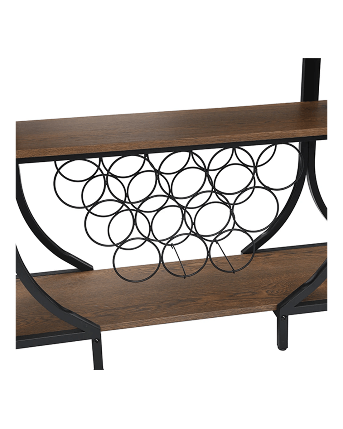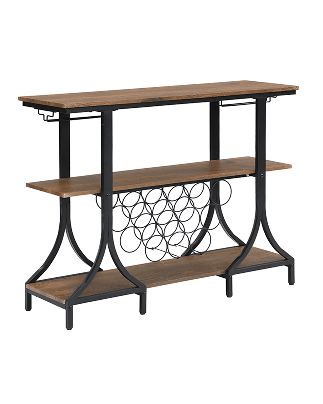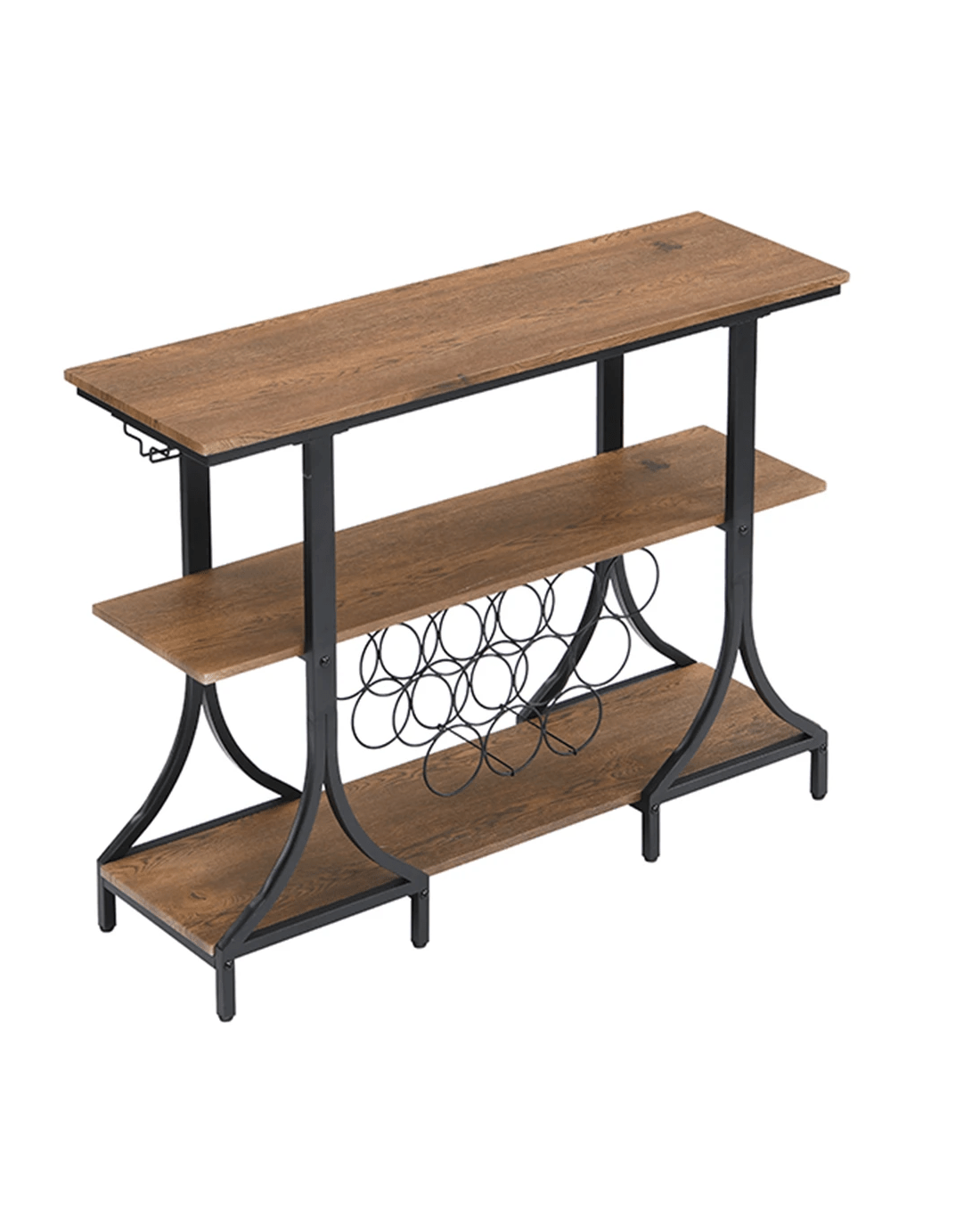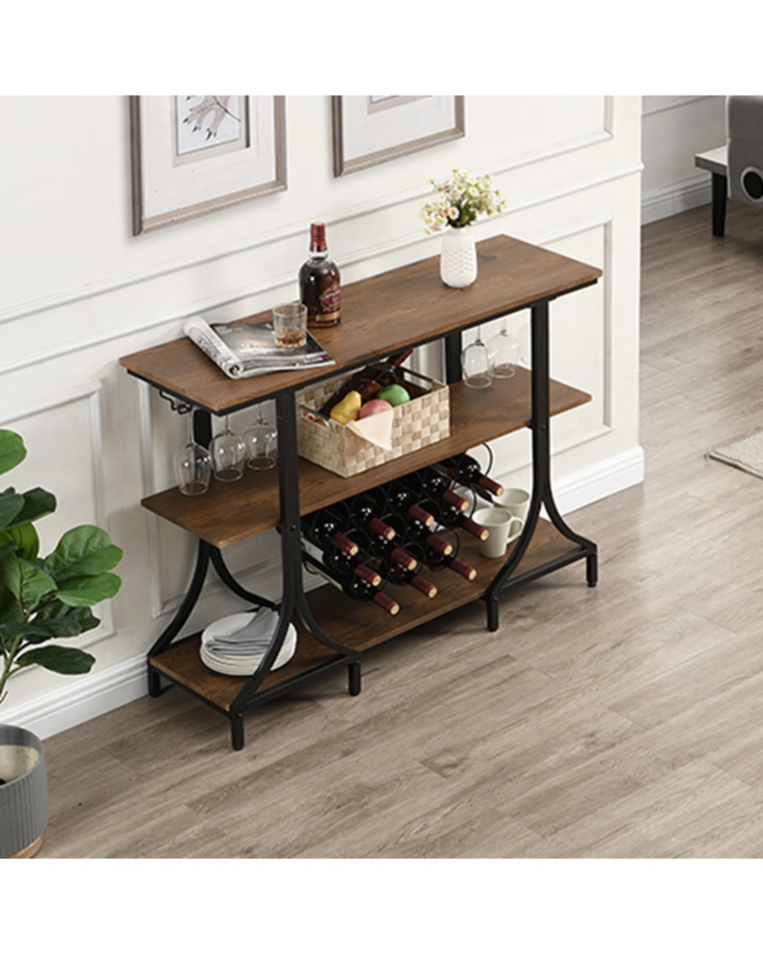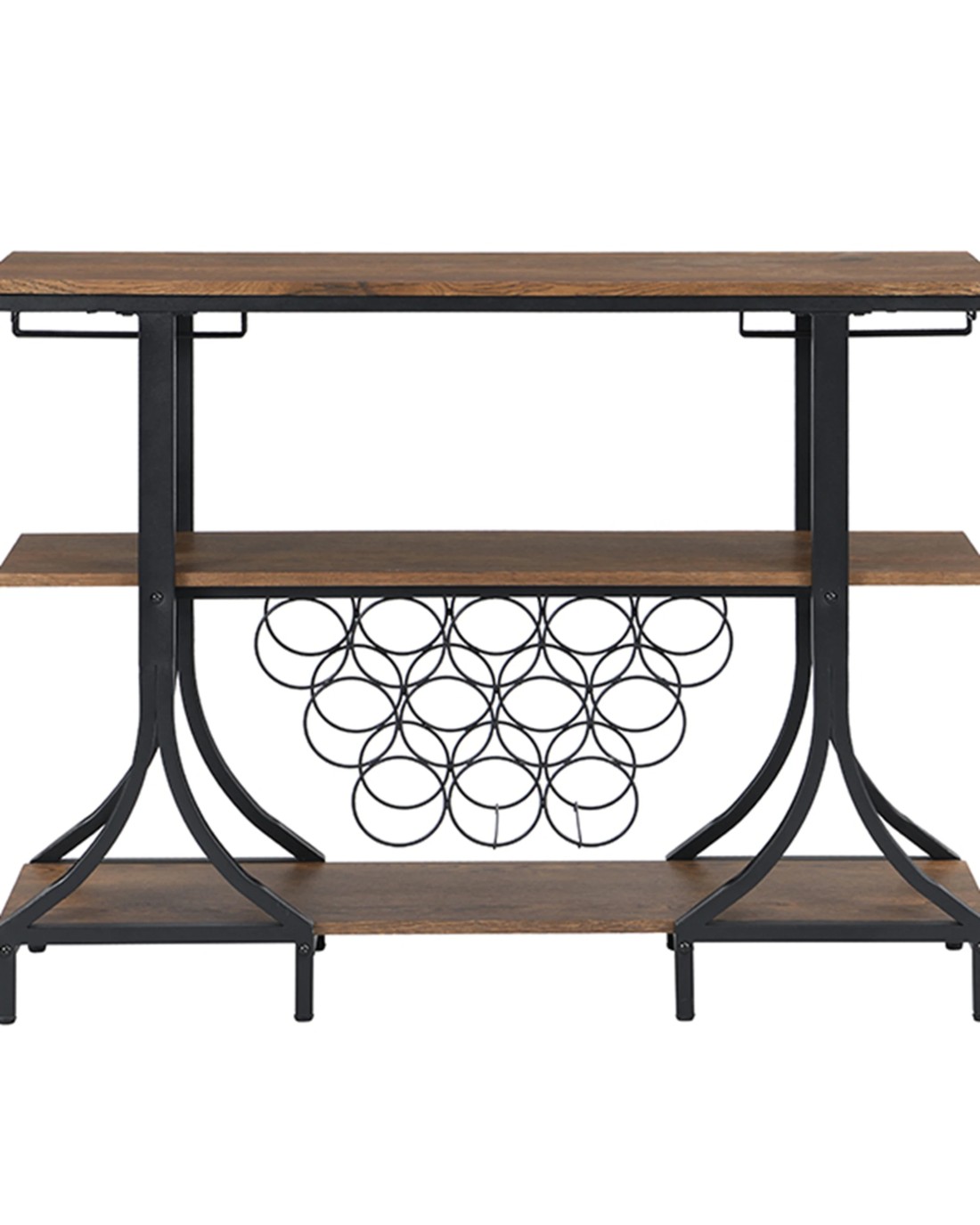 3-Tier Vintage Wine Rack with 12 Bottle Holder, Brown VERSATILE BAR CART: The top shelf can be used for placing trays, wine buckets and snacks. The stemware holders and open storage compartment provide plenty of room to fit your wine glasses and wine bottles. RUSTIC&INDUSTRIAL: Beautifully crafted from MDF board (not solid wood) and sturdy metal. Its sleek metal frame brings stylish and industrial style to any room, while its wood grain details pair perfectly with black frames, adding a rustic touch to your decor. OVERALL SIZE OF WINE CART: 85 x 113 x 35 cm (H*W*D) and feature 15 wine bottle holders under the middle and lower shelves. MINIMAL ASSEMBLY REQUIRED: Come with necessary hardware and simple tool for easy set up. We also provide details instructions that walk you through step by step how to assemble. If you have any questions we are more than happy to help. Product specifications Color: Brown Shelf & Black metal frame Material: MDF Board(Not Solid Wood) and Black Metal Frame Overall Size: 85 x 113 x 35 cm (H*W*D) Top Board Size: 1.5 x 113 x 35 cm (H*W*D) Middle Board Size: 1.5 x 111 x 28.6 cm (H*W*D) Lower Board Size: 1.5 x 111 x 28.6 cm (H*W*D) Height Between Top and Middle Shelf: 30 cm Height Between Lower and Middle Shelf: 39 cm Item Weight: 19kg Note: product colour may slightly vary due to photographic lighting Package Include bar cart x 1 pc + Assembly Manual + necessary hardware + simple tool