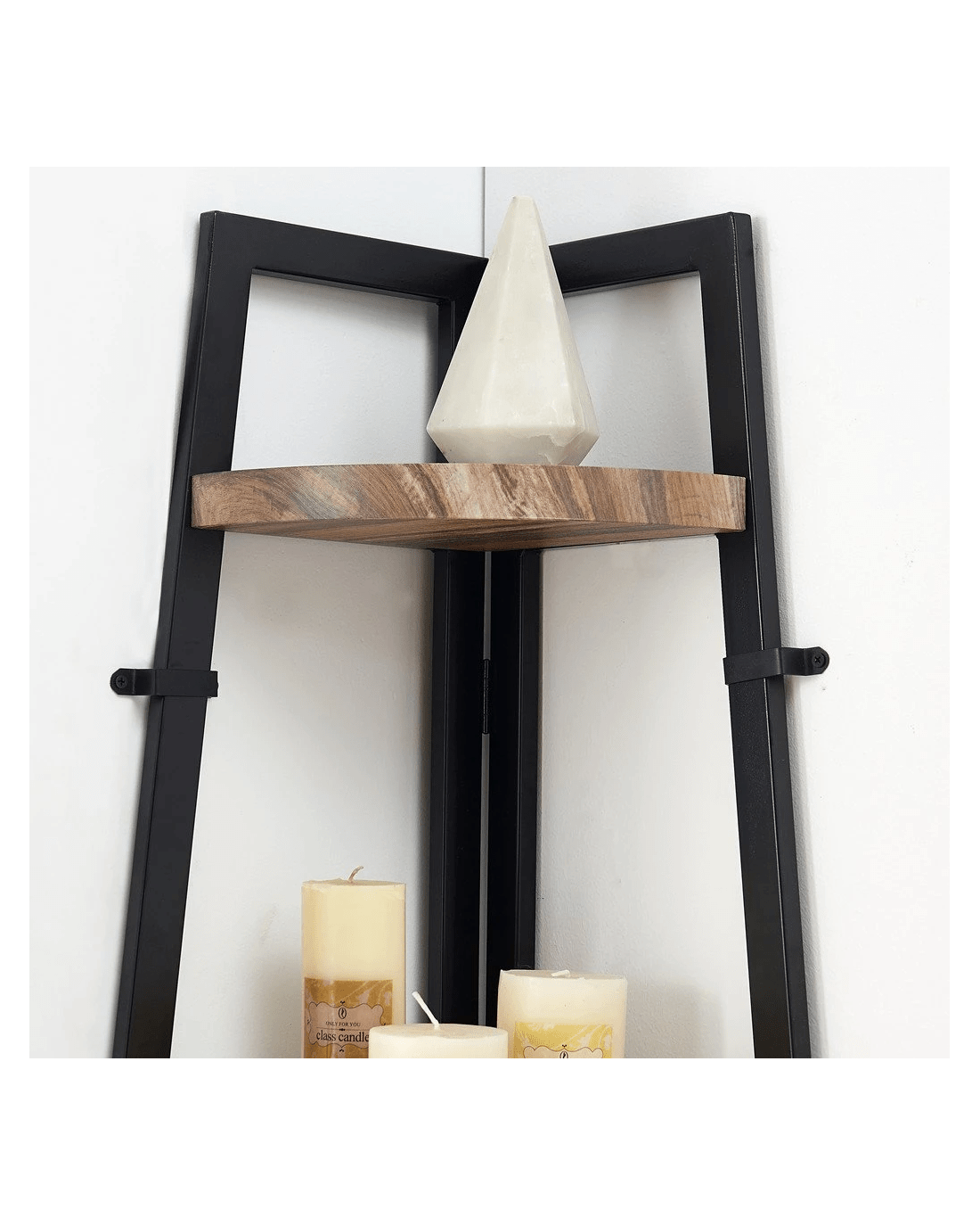 About this item Corner Shelf Dimension:42cm x 42cm x 177.5cm(H); It fits nicely against the wall and doesn't occupy too much floor space. Sturdy Construction:The bookcase made of MDF board with wood grain PVC and clean-lined metal frame. Pretty sturdy, provides longer work life. Multifunctional Use:Shelves are deep enough to hold some photos, houseplants, and travel collectibles, or you can use the the shelf as a bookcase. Suit for any Room:Stylish simple design compliment well with any decor style, and great for your bed room, bathroom, closet, home office, living room, kids room, kitchen, etc. Easily Assemble:All necessary hardware and step-by-step instructions are included, you will finish the assembly within several minutes. A-Shaped Corner Bookcase for Home Decor Color:Brown Panels + Black Tube Dimension:42cm x 42cm x 177.5cm(H) Height between shelves:39cm Net Weight: 11kg Space Saving Beautify your small space Utilize corner space, without taking up the limited space of home