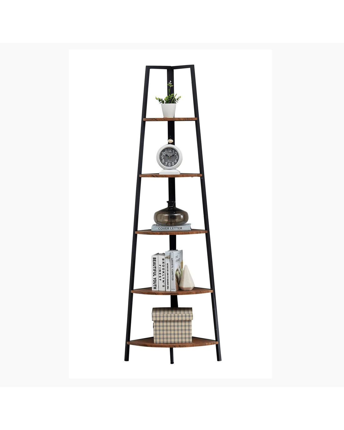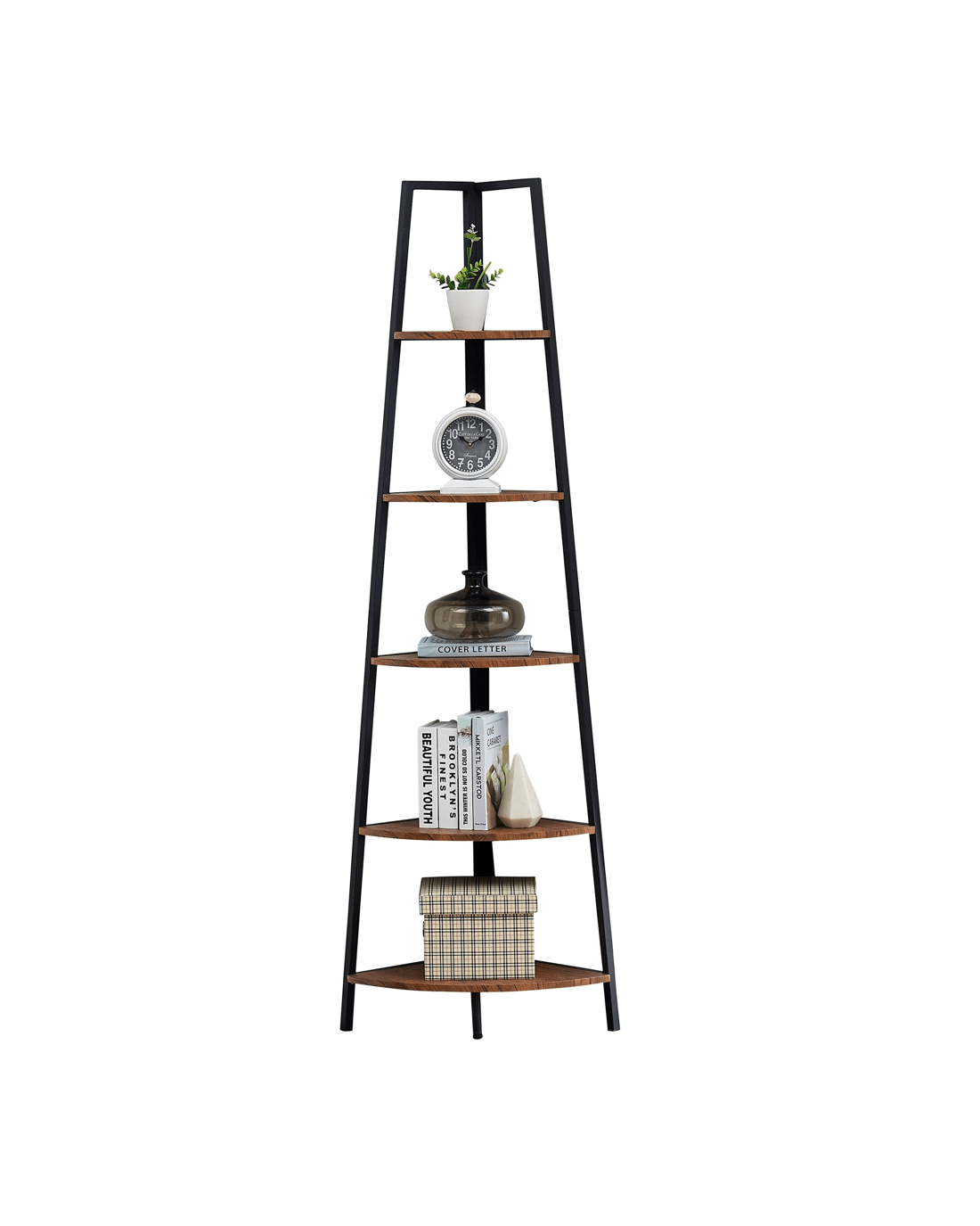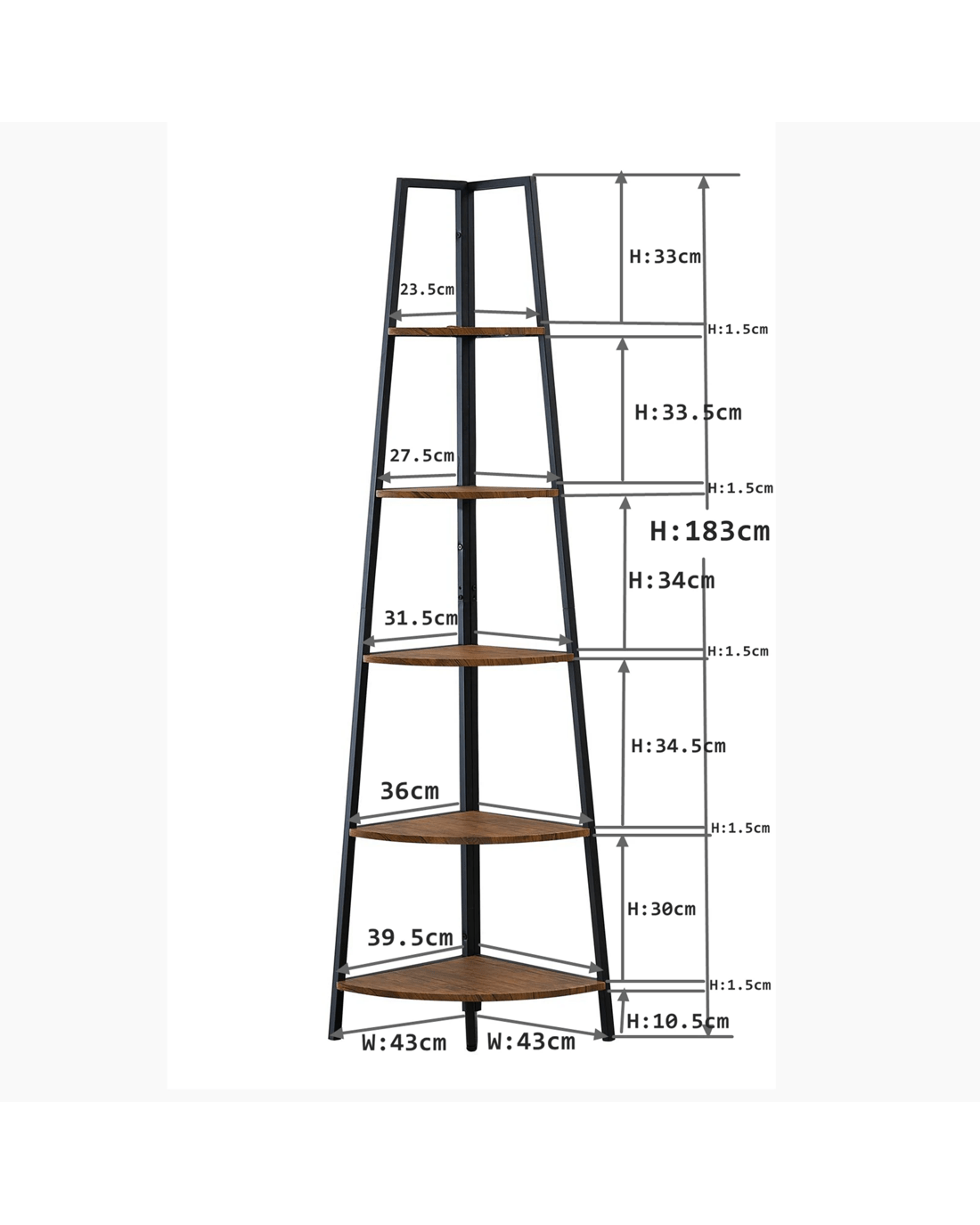 About this item Corner Shelf Dimension:43cm x 43cm x 183cm(H); It fits nicely against the wall and doesnt occupy too much floor space. Sturdy Construction:The bookcase made of MDF board with wood grain PVC and clean-lined metal frame. Pretty sturdy, provides longer work life. Multifunctional Use:Shelves are deep enough to hold some photos, houseplants, and travel collectibles, or you can use the the shelf as a bookcase. Suit for any Room:Stylish simple design compliment well with any decor style, and great for your bed room, bathroom, closet, home office, living room, kids room, kitchen, etc. Easily Assemble:All necessary hardware and step-by-step instructions are included, you will finish the assembly within several minutes. A-Shaped Corner Bookcase for Home Decor Specification Color:Brown Panels + Black Tube Dimension:43cm x 43cm x 183cm(H) Height between shelves:39cm Net Weight: 11kg More Features