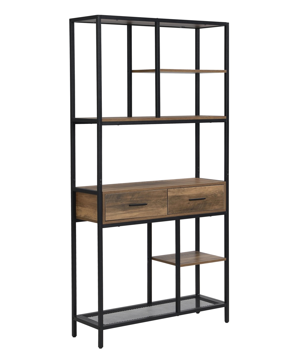 6-Tier Open Multi-function Bookshelf with Drawers 180cm Height Rust Dark Brown About this item MODERN MUTIFUNTION 6 TIER BOOKSHELF---6 Tier 2 Drawers Bookshelf with simple design, is perfect for multiple occasions like office, living room, bedroom and kitchen. Not only can be used as a organizer for your books, photos, plants... , but also can be an accent storage shelf for Toiletries, kitchenware,etc. MORE SPACE STORAGE WITH 2 DRAWERS---The shelf has 2 drawers for store small items like pen, wallet, scissors. It can be open and close with two black drawer handles. FIRM & STABLE CONSTRUCTIONS---bookshelf is made of thick steel frame and MDF board. With 4 adjustable Feet Pads to keep shelf balance and protecting your floor from scratches;Plus Anti-falling Kit to avoid falling down and wobbling. Features Materials: steel frame with black finish,MDF board(not solid wood) + melamine surface Primary Colour: Black; Rustic Dark Brown Number of Shelves:6(total 1 metal layers,5 MDF layers) Including 2 drawers 4 Adjustable plastic foot pads Anti-Topple Anchors including Minimal assembly is required, recommended 2 persons Dimensions Overall Dimension:180cm H x 90cm W x 30cm D Top shelf dimensions(1st):1.5cm H x 86m W x 26cm D The second shelf from top dimensions(2nd):1.5cm H x 47.5m W x 30cm D Middle shelf dimensions(3nd):1.5cm H x 86m W x 30cm D Top shelf of drawers dimensions(4th):1.5cm H x 86m W x 30cm D The 5th shelf close bottom dimensions(5th):1.5cm H x 34.5m W x 30cm D The bottom metal shelf dimensions(5th):2cm H x 86m W x 30cm D Out dimension of two drawers:14.5cmH x 42.5cmW x 27cmD Interior dimension of two drawers:11.5cmH x 35.5cmW x 24cmD Clearance from bottom shelf to floor:10cm Short shelf weight capacity:10kg Long shelves weight capacity:25kg Metal shelf weight capacity:20kg Overall Product Weight Capacity: 150 Kg Box content 1 x bookshelf 1 x hardware pack 1 x assembly manual