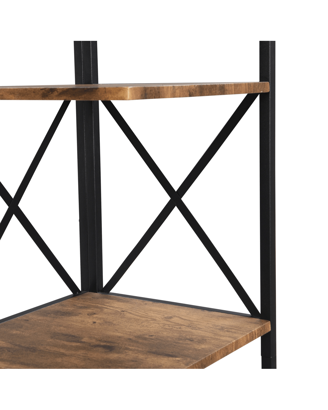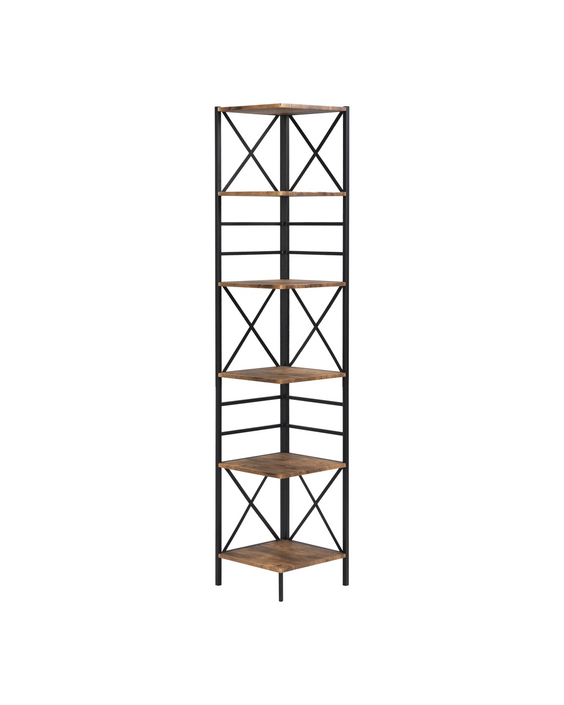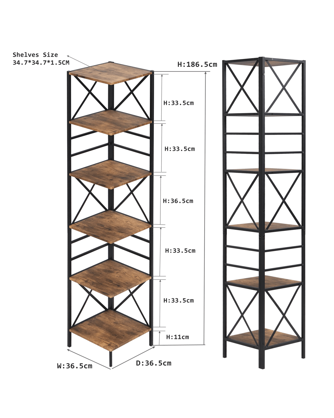 Industrial 6-Tier Square Corner Bookshelf, 186.5cmH Rustic Dark Brown Product details Multifunctional Corner Shelves: Maximize the corner space of your room, kitchen, balcony with this corner shelf unit, which can work as a small corner bookshelf, display rack, plant shelf to help your home out of clutter. Space-saving Design: Freestanding corner bookcase makes full use of limited corner space and easily fit into your room without occupying large space, perfect home decor for your living room, bedroom, study room even kitchen. Solid Construction: Crafted from thick rustic finish MDF board and heavy duty black-finished metal frame, which not only adds an contemporary industrial style, but also strengthens the durability and weight capacity for long time use. Features Materials: steel frame with black painting,MDF board(not solid wood) + melamine surface Number of Shelves:6 Shelves shape:square Solid and durable construction Wall bracket to prevent from wobbling Plastic non-slip feet Product Details Shelf Material: 1.5cm height MDF board+ melamine surface Frame Material Details: Steel with black painting Primary Colour: Black; Rustic Dark Brown Minimal assembly is required, recommended 2 persons Care Instructions: wipe clean & polish frame with microfibre cloth; to protect against scratching & general wear, use of coasters & placemats is highly recommended Dimensions Overall Dimension:186.5cm H x 36.5cm W x 36.5cm D MDF shelves dimensions:1.5cm H x 34.7cm W x 34.7cm D Clearance between Shelves:33.5cm(36.5cm for 3rd & 4th) Clearance from Middle shelf bottom to floor:11cm Each shelf Weight capacity:10kg Overall Product Weight Capacity: 60 Kg Box content 1 x Corner bookshelf 1 x hardware pack 1 x assembly manual