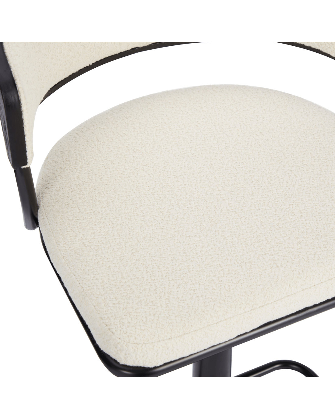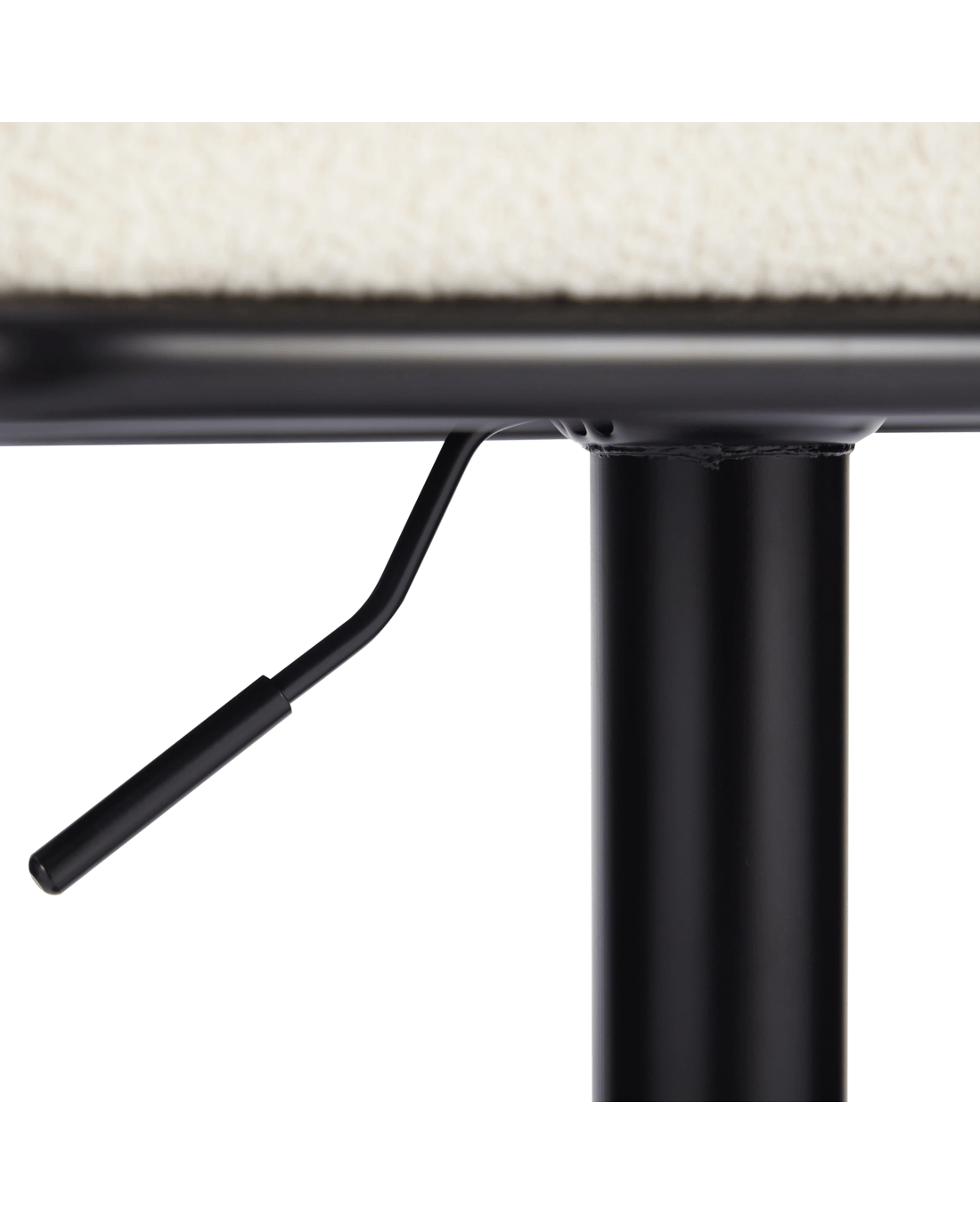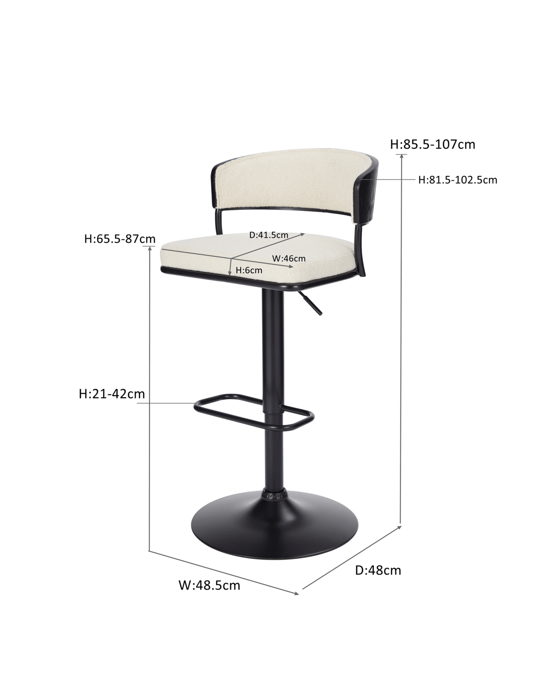 Modern Wing Back Adjustable Swivel Bar Stools White About the item Comfortable Seating-Made from high-quality soft polyester fabric. The backrest and seat of these bar stools cradle your body, providing excellent support and comfort, even during extended periods of use. Modern and Elegant-The curved design of these counter height bar stools is a unique and eye-catching feature that will add a touch of sophistication to any home bar, kitchen counter, cafes or restaurants etc. Adjustable Barstools-The height of these bar stools can be adjusted within 21cm to suit different counter or bar heights, providing maximum comfort and convenience. And the swivel function of these kitchen stool allows for easy movement and conversation. Easy Assembly-These bar chairs are easy to assemble and come with all the necessary hardware and instructions, making it a hassle-free process to get them up and running in no time. Features Material:White polyester Boucle Fabric + High-density Foam cushion & Backrest +Polywood +Black Powder coating metal frame Included: 1 Chair/Set Polywood & Upholstery Curved backrest & Upholstery Seat Cushion Polyester upholstered fabric with high-density foam cushion Round base with metal footrest NOTE: Color and saturation may vary due to lighting and monitor/phone screen settings Product specifications Overall Dimension: 107cmH x 48.5cmW x 48cmD(Highest) Overall Dimension: 85.5cmH x 48.5cmW x 48cmD(Lowest) Cushion Dimension: 6cmH x 46cmW x 41.5cmD Back support dimension:17cmH x 48.5cmW x 5cmD Arm height: 81.5cm - 102.5cm Seat Height:65.5cm - 87cm Footrest Height:21cm - 42cm Maximum weight capacity: 130 KG Package 1 x bar stool 1 x hardware kit 1 x assembly manual