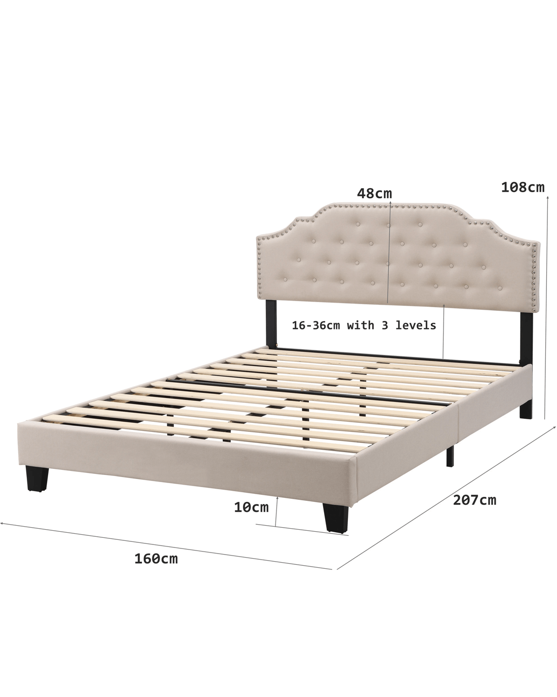 BEF02 Queen Size Upholstered Velvet Button Tufted Bed Frame Re-shape your bedroom with a new, striking centrepiece. This elegant bed is upholstered in a Velvet fabric in a neutral hue, and its beautiful shape headboard generously padded for added comfort. The effect is an inviting place that you'll love falling into each night with a sweet sleep Features Material: 100% polyester velvet upholstery+ high-density foam padding + Plywood + painted-finish steel frame + polypropylene plastic legs Slats: Plywood Headboard can adjust three different height, 5cm for each level Padded with high-density foam Sturdy steel frame Strong centre support strut 12 Wooden arched slats base Heavy-duty metal connectors Reinforced construction with metal bars 2 black polypropylene plastic legs Note: pillows & mattress are not included Specification Queen Size: Overall dimensions: 108cmH x 163cm W x 208cm D Fits standard Queen-sized mattress: 150cm W x 200cm D Bed-Headboard dimensions: 56cm H x 163cm W x 7cm D Panel on foot end dimension: 17.5cm H x 155cm W x 5cm D Per Panel on two sides dimension: 17.5cm H x 100cm W x 4cm D Slats dimensions:1.2cm H x 148.5cm W x 5.5cm D Clearance from bed to floor : 10cm Weight capacity: 240kg Package Content Bed Frame x1 Assembly Manual x1 Hardware pack x 1