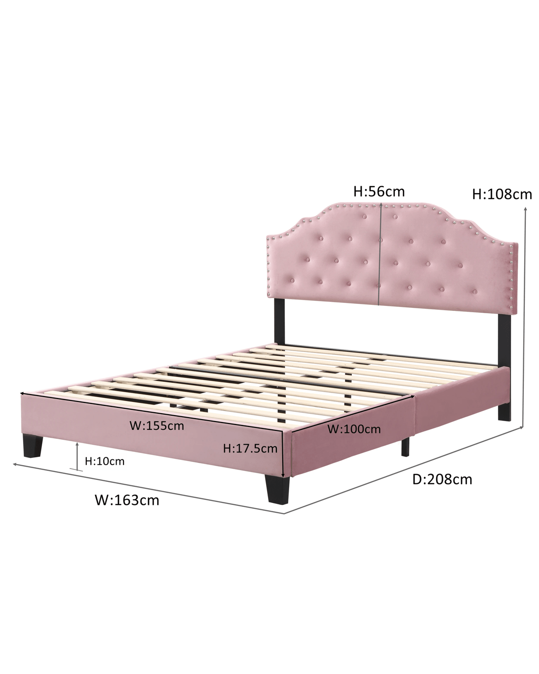BEF02 Queen Size Upholstered Velvet Button Tufted Bed Frame Re-shape your bedroom with a new, striking centrepiece. This elegant bed is upholstered in a Velvet fabric in a neutral hue, and its beautiful shape headboard generously padded for added comfort. The effect is an inviting place that you'll love falling into each night with a sweet sleep Features Material: 100% polyester velvet upholstery+ high-density foam padding + Plywood + painted-finish steel frame + polypropylene plastic legs Slats: Plywood Headboard can adjust three different height, 5cm for each level Padded with high-density foam Sturdy steel frame Strong centre support strut 12 Wooden arched slats base Heavy-duty metal connectors Reinforced construction with metal bars 2 black polypropylene plastic legs Note: pillows & mattress are not included Specification Queen Size: Overall dimensions: 108cmH x 163cm W x 208cm D Fits standard Queen-sized mattress: 150cm W x 200cm D Bed-Headboard dimensions: 56cm H x 163cm W x 7cm D Panel on foot end dimension: 17.5cm H x 155cm W x 5cm D Per Panel on two sides dimension: 17.5cm H x 100cm W x 4cm D Slats dimensions:1.2cm H x 148.5cm W x 5.5cm D Clearance from bed to floor : 10cm Weight capacity: 240kg Package Content Bed Frame x1 Assembly Manual x1 Hardware pack x 1