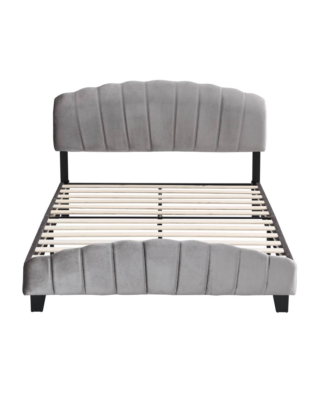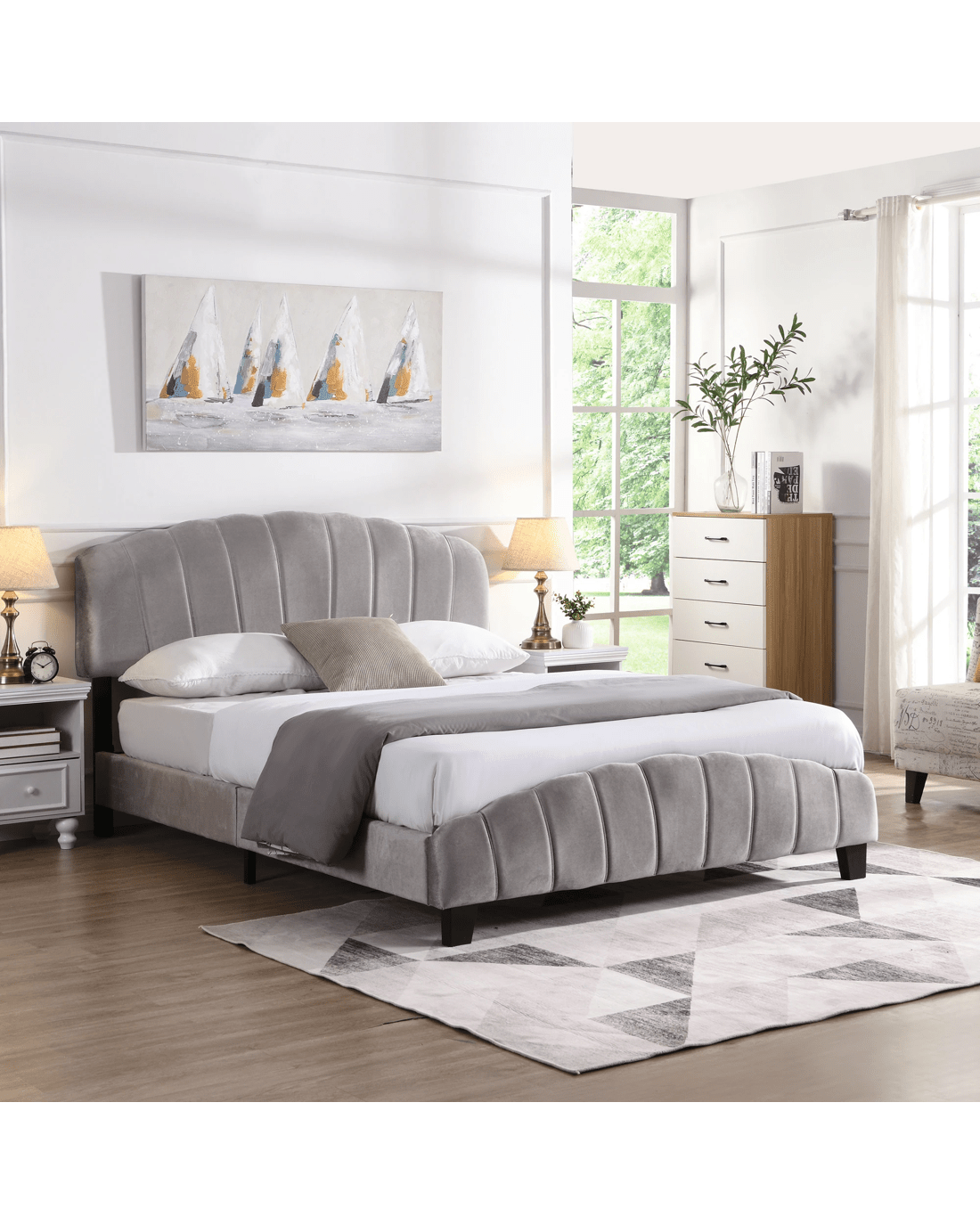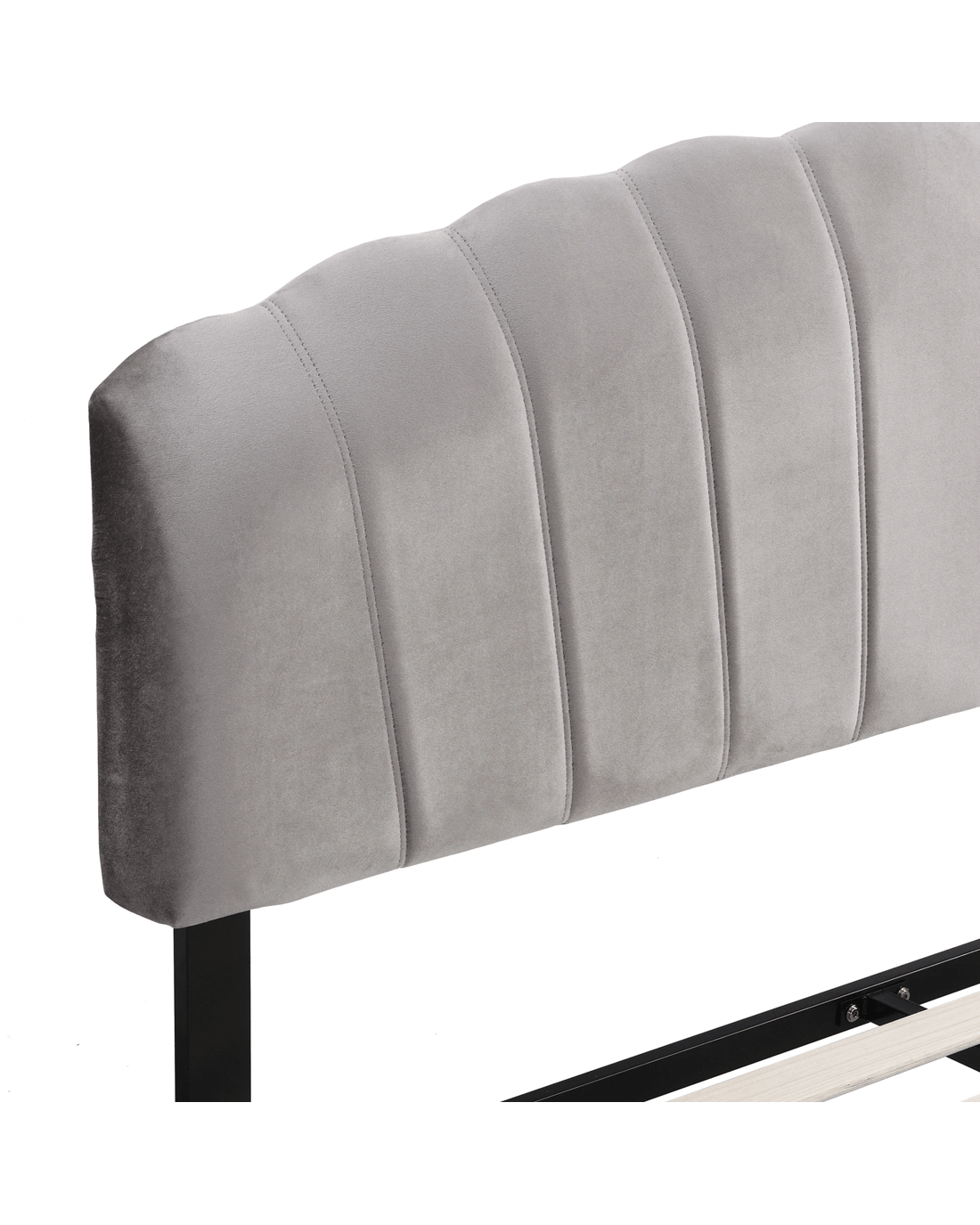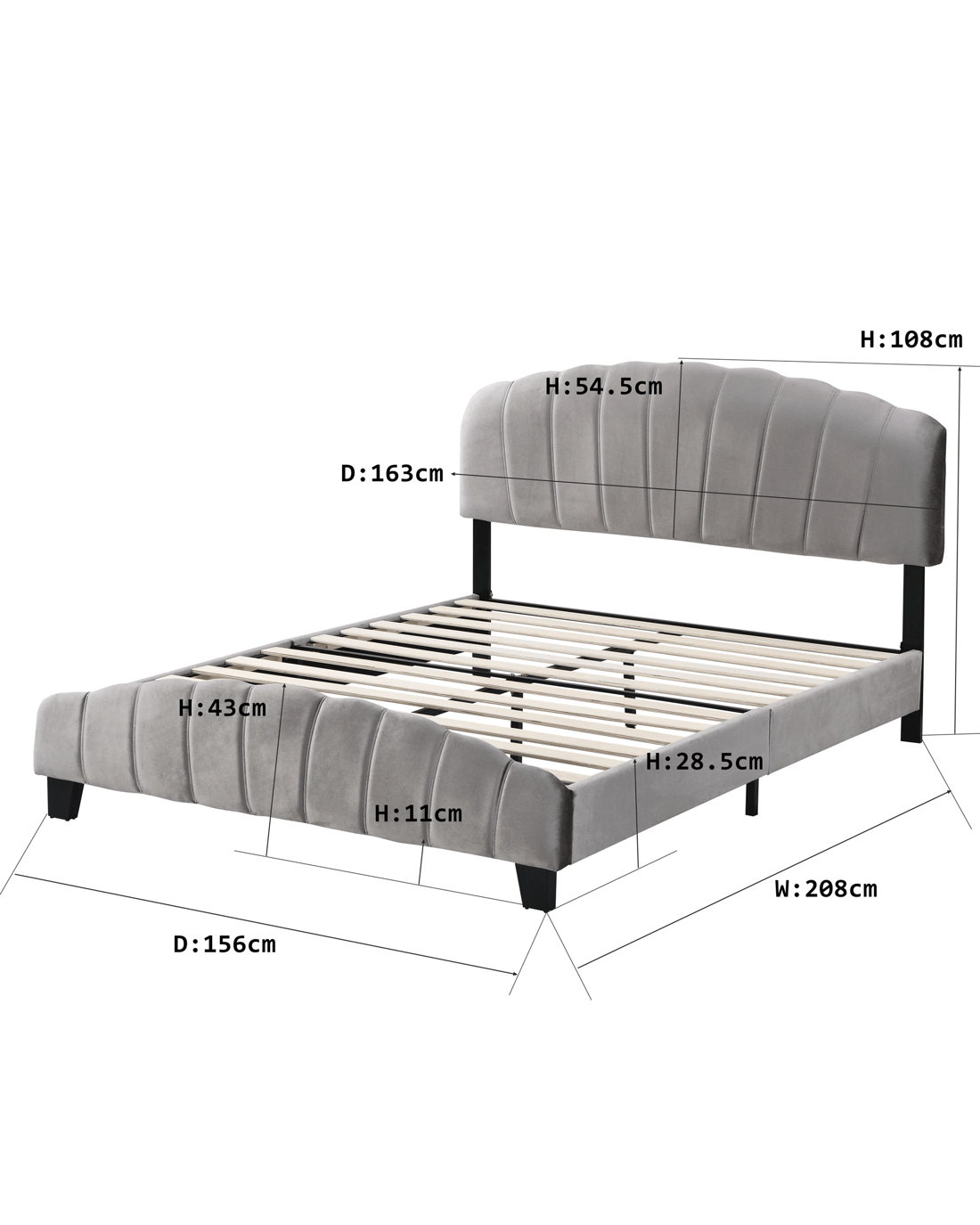 BEF04 Queen Size Shell-Style Bed Frame Base Mattress Platform Re-shape your bedroom with a new, striking centrepiece. This elegant bed is upholstered with 100% polyester velvet in a neutral hue, and its shell-shape headboard generously padded for added comfort. The effect is an inviting place that you'll love falling into each night with a sweet sleep Features Material: 100% polyester velvet upholstery+ high-density foam padding + Plywood + painted-finish steel frame, + polypropylene plastic legs Slats: Plywood Headboard can adjust three different height, 5cm for each level Upholstered with premium Velvet Plush Shell-style bedhead Padded with high-density foam Sturdy steel frame Strong centre support strut Heavy-duty metal connectors Reinforced construction with metal bars 2 black plastic feet Mattress not included Specifications: Queen Size: Overall dimensions: 108cmH x 163cmW x 212cmD Fits standard Queen-sized mattress: 150cmW x 203cmD Bed-End Board: 8cmH x 156cmW x 32cmD Bed-Head Board: 11cmH x 163cmW x 54.5cmD Height between floor and footboard: 11cm Weight capacity: 240kg Package Content 1 x Bed Frame 1 x Assembly Manual 1 x hardware pack