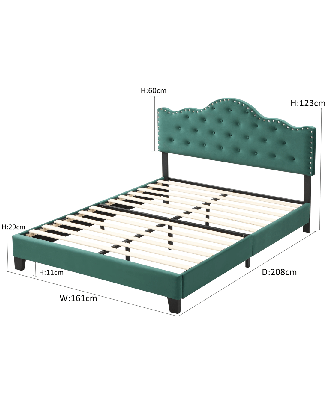 BEF05 Upholstered Button Tufted Queen Size Bed Frame Re-shape your bedroom with a new, striking centrepiece. This elegant bed is upholstered in velvet fabric in a neutral hue, and its crown-shape headboard generously padded for added comfort. The effect is an inviting place that you'll love falling into each night with a sweet sleep Features Material: 100% polyester velvet upholstery+ high-density foam padding + Plywood + painted-finish steel frame + polypropylene plastic legs Slats: Plywood Headboard can adjust three different height, 5cm for each level(Bed Height range from 113cm to 123cm) Padded with high-density foam Sturdy steel frame Strong centre support strut 12 Wooden arched slats base Heavy-duty metal connectors Reinforced construction with metal bars Crown-shape bedhead 4 black plastic feet Note: pillows & mattress are not included Queen Size: Overall dimensions:123cm H x 161cm W x 208cm D Fits standard Queen-sized mattress:150cm W x 200cm D Bed-Headboard dimensions:60cm H x 161cm W x 8cm D Panel on foot end dimension:18cm H x154.5cm W x 6cm D Panel on two sides dimension:18cm H x200cm W x 3cm D Slats dimensions:1.2cm H x 148.5cm W x 7cm D Clearance from bed to floor: 11cm Weight capacity: 240kg Package Content Bed Frame x1 Assembly Manual x1 Hardware pack x 1