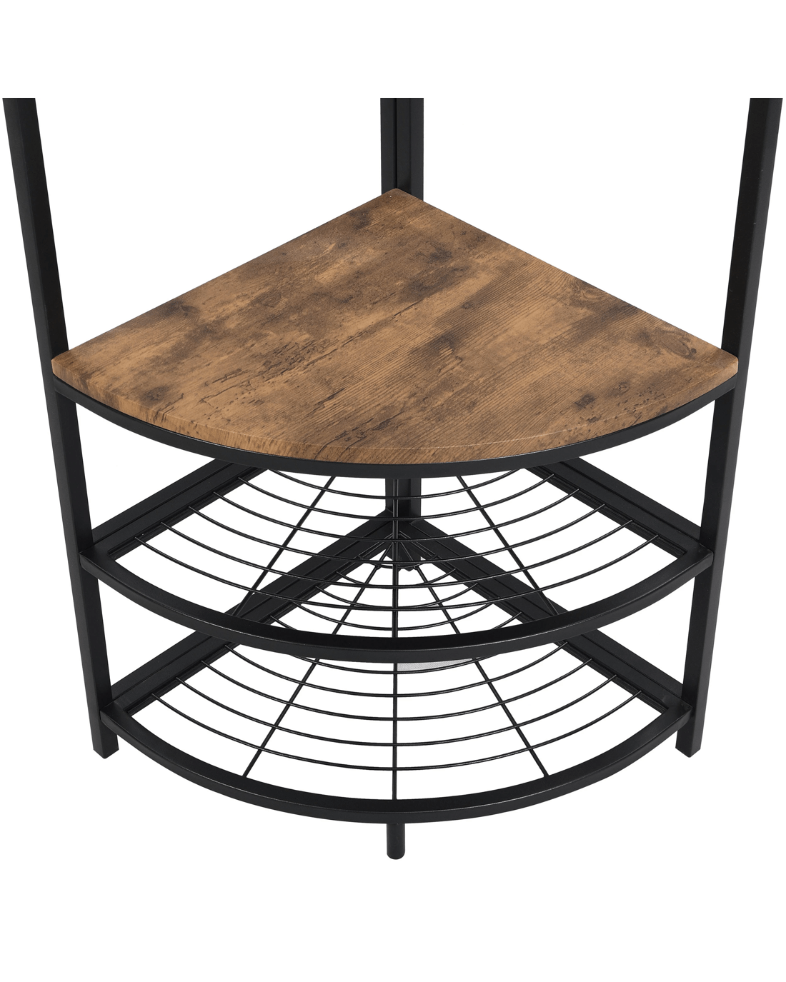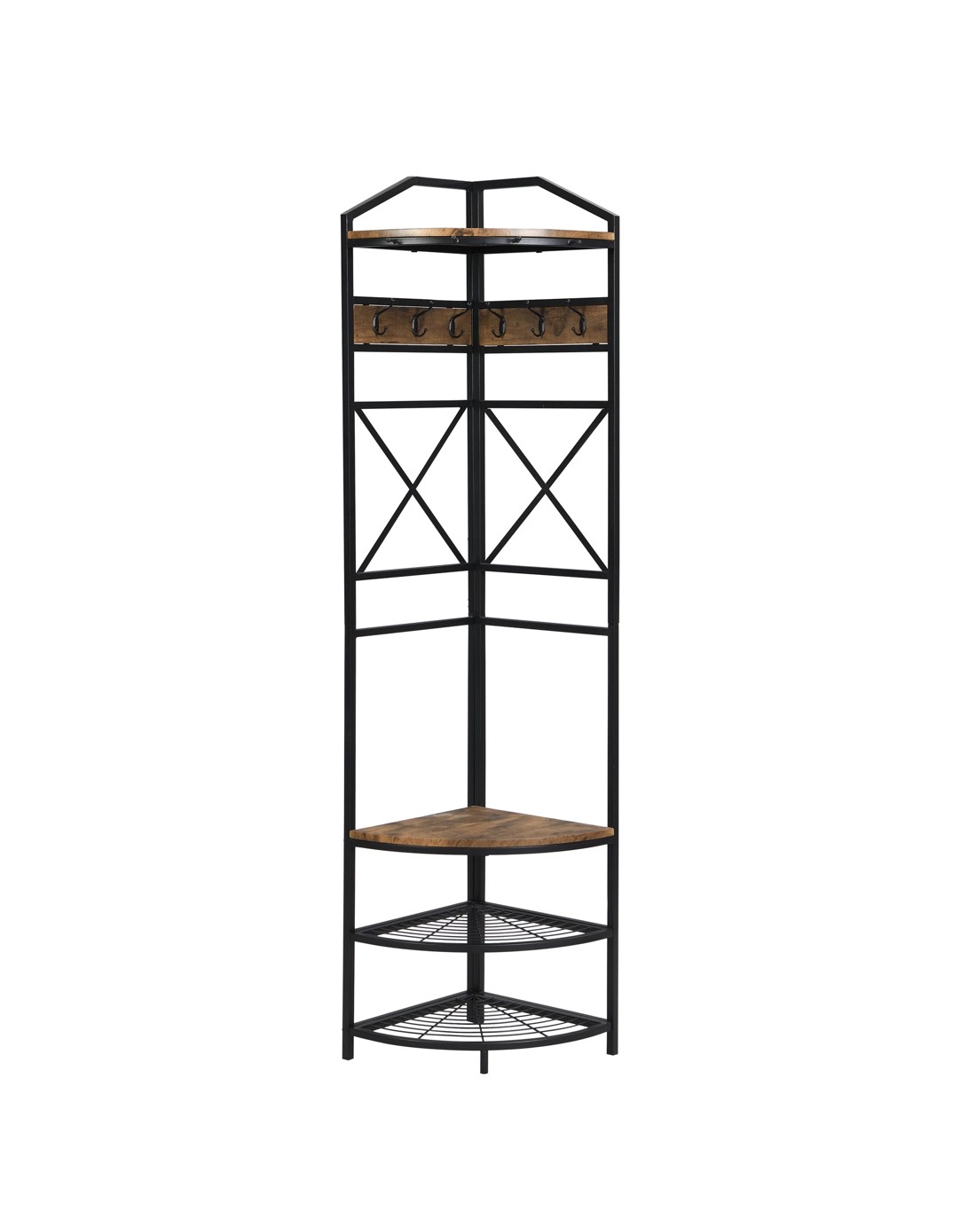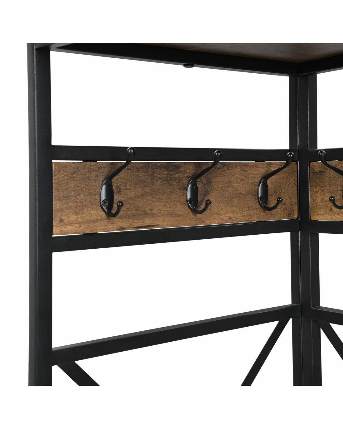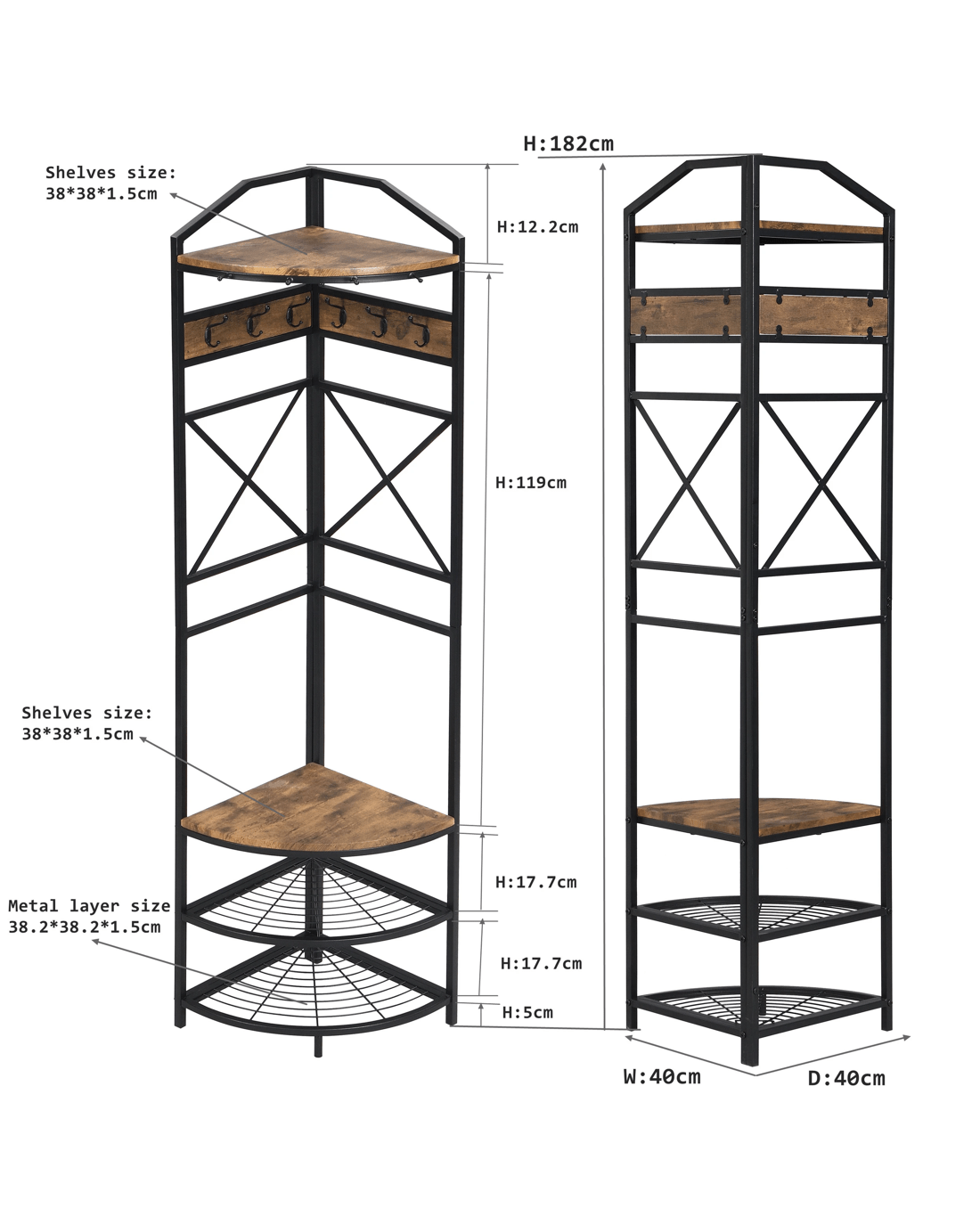 Industrial Corner Hall Tree with Shoe Bench, Entryway Coat Rack 182cmH Rustic Dark Brown Descriptions Industrial Style with Simple Design: Made of steel frame tube and MDF shelf (Not solid wood), add this elegant hall tree to the entryway or hallway to complement a fashionable aesthetic. Multi-Function Hall Tree with Bench:not only works great as a shoe bench & coat racks in the entry, but also can be an extra storage shelf to keep daily items and accessories in your living room Features Materials: steel frame with black painting,MDF board(not solid wood) + melamine surface Number of Shelves:4 (2 metal mesh layers, 2 shelves layers) Solid and durable construction Wall bracket to prevent from wobbling Plastic non-slip feet Hall Tree with 6 hooks adds extra storage space Product Details Shelf Material: 1.5cm height MDF board+ melamine surface Frame Material Details: Steel with black painting Primary Colour: Black; Rustic Dark Brown Minimal assembly is required, recommended 2 persons Care Instructions: wipe clean & polish frame with microfibre cloth; to protect against scratching & general wear, use of coasters & placemats is highly recommended Dimensions Overall Dimension:182cm H x 40cm W x 40cm D MDF shelves dimensions:1.5cm H x 38cm W x 38cm D Metal layers dimensions:1.5cm H x 38.2cm W x 38.2cm D Clearance of Bottom Shelves:17.7cm Clearance from Middle shelf bottom to floor:5cm Each shelf Weight capacity:10kg Overall Product Weight Capacity: 60 Kg Box content 1 x Corner Hall Tree 1 x hardware pack 1 x assembly manual