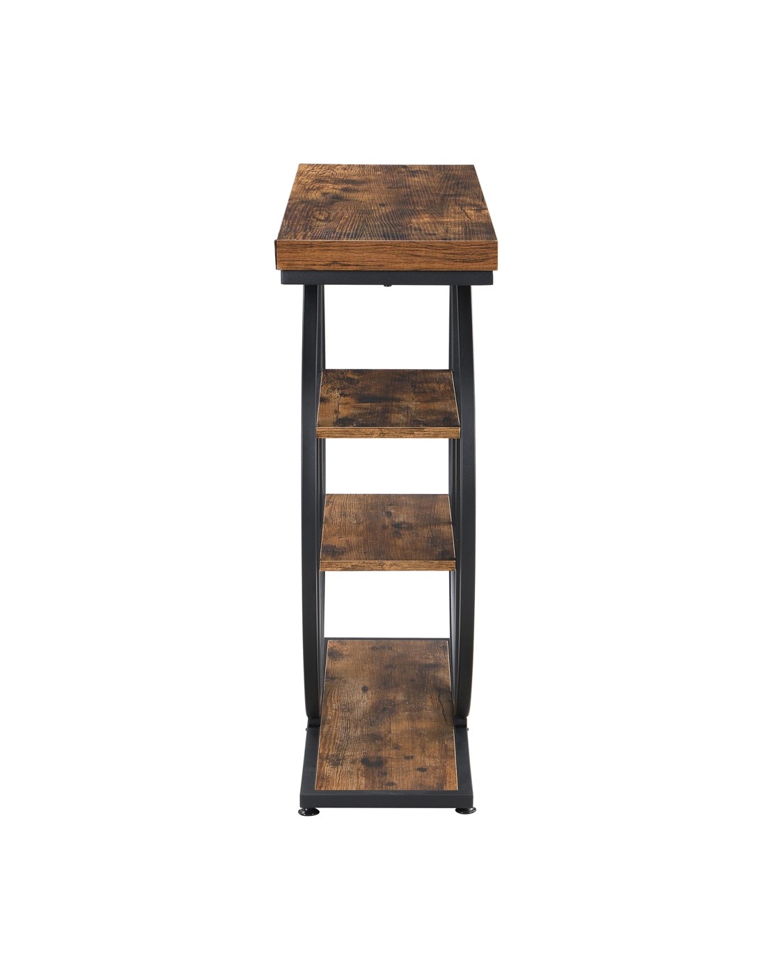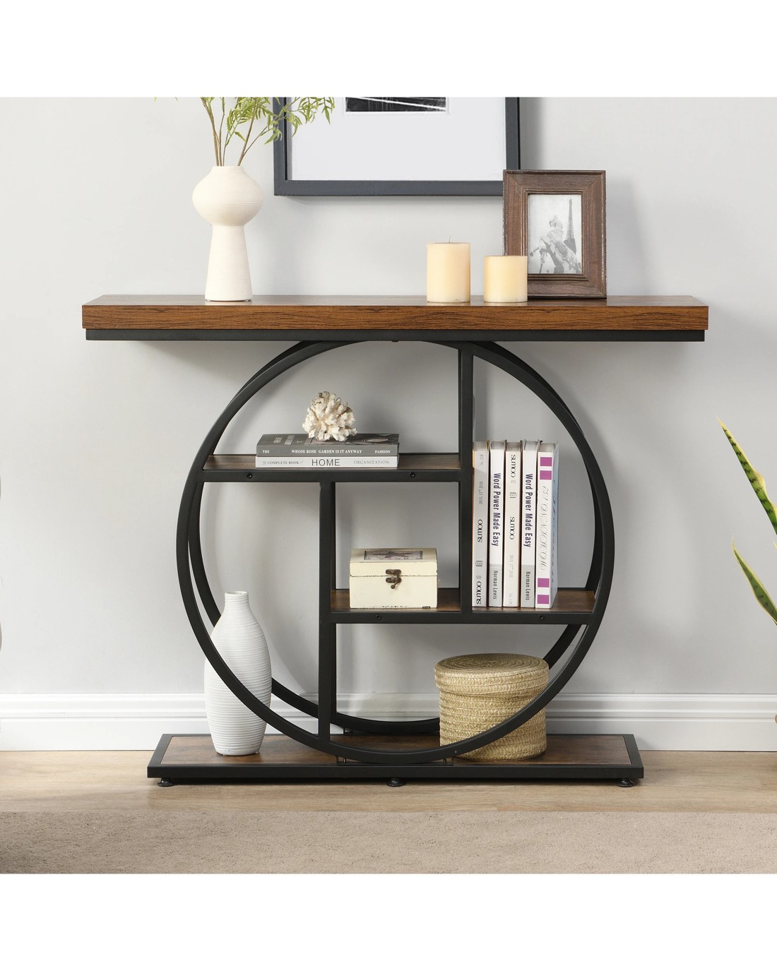 Industrial MDF and Metal Entryway Console Table with 4-Tier Open Storage Shelf Warning: Children have died from furniture toppling over. Always secure this furniture with an anchor device; never allow children to stand, climb or hang on drawers, doors, or shelves. Descriptions Unique Design--This 4-tier console table is designed with a ROUND metal shape frame, that perfectly fits for a tighter space yet it still provides an extra surface for decor. It's surprisingly stylish and keeps your things looking organized. Multifunctional--This marble texture laminated MDF board console table is narrow and good for small spaces since they can be placed anywhere from tiny entryways to more spacious living areas. Works greatly as a console table, sofa table, or entryway table. Perfectly used for all kinds of room. You could use it for your living room, dining room, kitchen, bedroom. study, hallway, workshop, etc. Strong and Stable--Made of sturdy metal frame and high-quality MDF board, this wood and metal console table has a long service time. Waterproof surface is easy to clean. Features Shelf Material: MDF board(not solid wood) with marble texture + melamine surface Frame Material Details: Steel with black powder-coated; Round steel frame with open shelves storage design 4cm thickness top shelf, total 4-tier shelves 6 adjustable plastic feet Minimal assembly is required, recommend 2 persons Care Instructions: wipe clean & polish frame with microfibre cloth; to protect against scratching & general wear, use of coasters & placemats is highly recommended Specifications Overall Dimension:81cm H x 104cm W x 29cm D Top shelf dimensions:4cm H x 104cm W x 29cm D Bottom shelf dimensions:1.5cm H x 80cm W x 20cm D Two middle shelves dimensions:1.5cm H x 37.5cm W x 20cm D Top Shelves to 2nd Shelf Distance:21.5cm Two middle shelves distance:22.5cm Bottom shelf between above shelf:24cm Outer diameter of round metal frame:74cm Clearance from shelf bottom to floor:1cm Top shelf Weight capacity:20kg Middle shelves and bottom shelf weight capacity:10kg Overall Product Weight Capacity: 50 Kg Box content 1 x Console Table 1 x hardware pack 1 x assembly manual