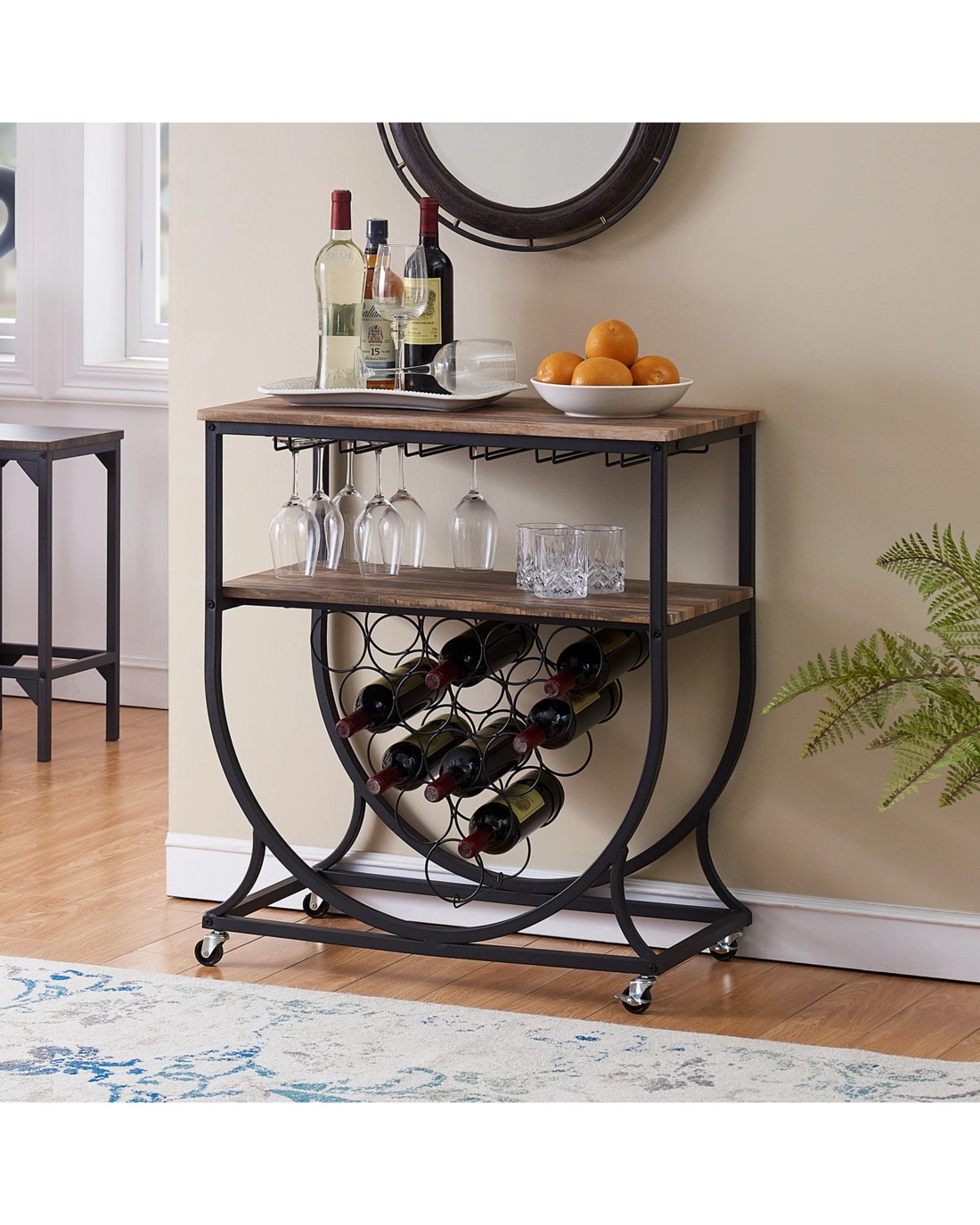 About this item Versatile Bar Cart: The top shelf can be used for placing trays, wine buckets and snacks. The stemware holders and open storage compartment provide plenty of room to fit your wine glasses and wine bottles. Rustic&Industrial: Beautifully crafted from MDF board (not solid wood) and sturdy metal. Its sleek metal frame brings stylish and industrial style to any room, while its wood grain details pair perfectly with black frames, adding a rustic touch to your decor. Mobile Serving Cart: It includes four universal wheels that allow you to easily move in multiple rooms or crowds, two of them are locking casters for easy placement anywhere throughout your home. Wine Cart: Overall size is 74.5 wide by 41cm deep by 85.8cm tall and feature 15 wine bottle holders and glass racks hold up to 18 stemmed glasses under the top and lower shelves. Product specifications Overall Size: 74.5 X 41x 85.8cm (W*D*H) Top Board size: 74.5X41X1.5cm (W*D*H) Lower Board size: 73.5X34.5X1.5cm (W*D*H) Material: MDF Board with wood veneer and Metal Item Weight: 13.9kg Package Include: bar cart x 1 pc + step by step Instruction + necessary hardware + simple tool