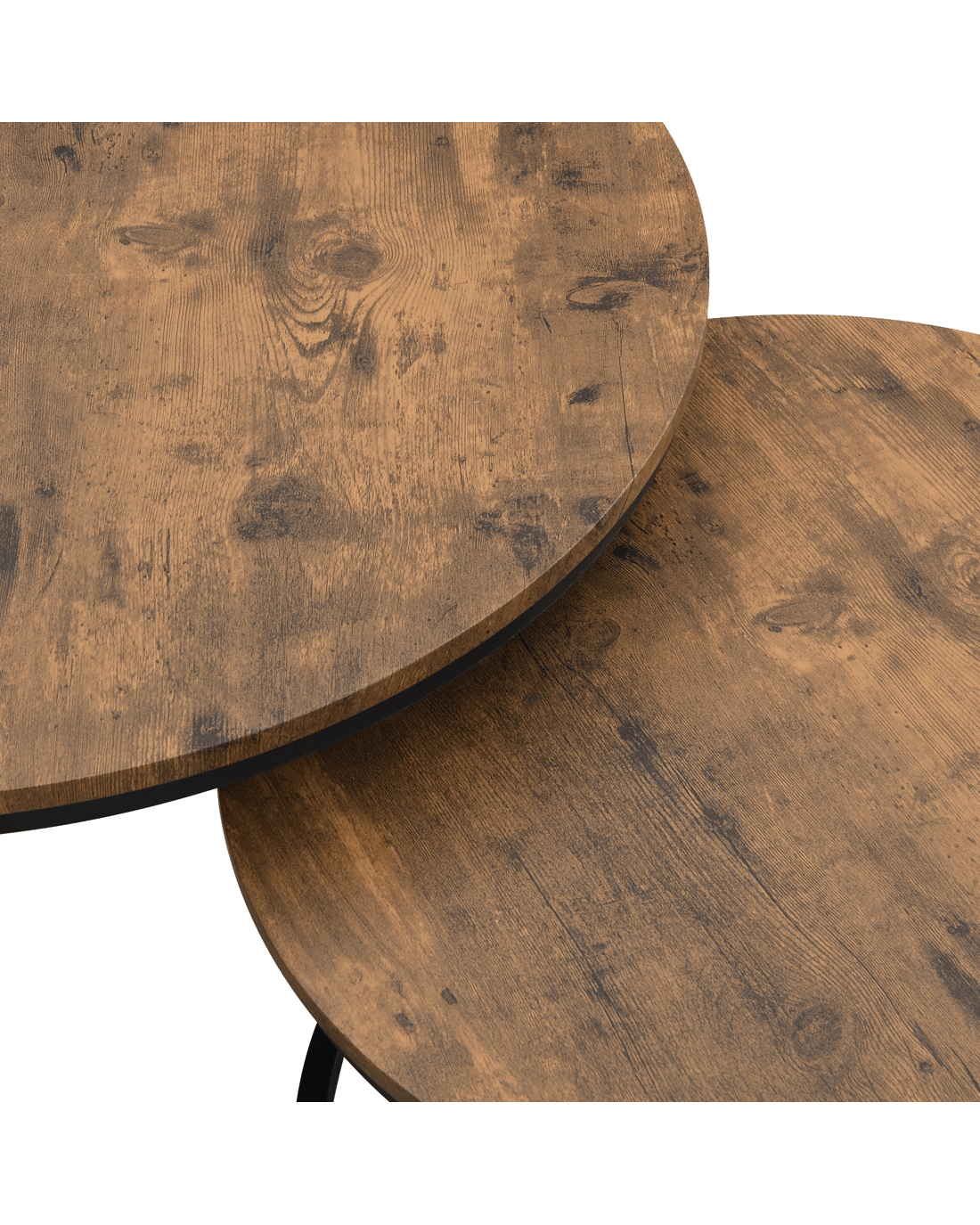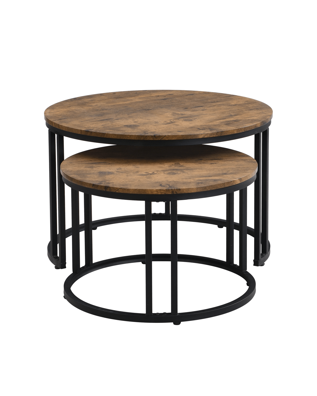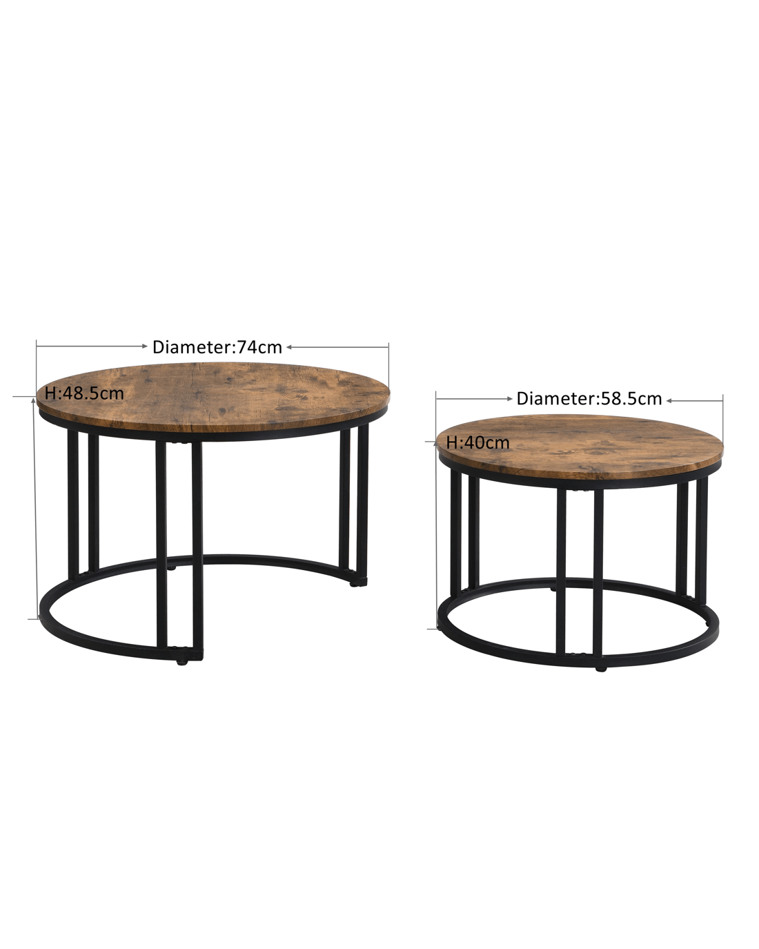 Nesting Coffee Table Set of 2 Rustic Dark Brown Description The nesting coffee table set of 2 feature minimalist design that will complement most living room styles. High quality material wood and steel, sturdy structure to ensure durability. Set of 2 nesting round table design for space-saving. Fits perfectly for living room, balcony or garden, patio furniture as well. Simple industrial style nesting table---The elegant and industrial retro style and nesting form design bring a unique experience to your Balcony living space. The MDF wood grain engraved tabletop makes the overall line of the coffee table smooth and beautiful, which is very suitable for families. Multi-functional combination---Large side table:74 cm (diameter) x 48.5cm (height), small side table:58.5cm (diameter) x 40cm (height). You can use them as The coffee table and side table are very suitable for the living room, bedroom, balcony, small space, etc. to be combined and placed at will Product Details: Shelf Material: MDF board(not solid wood)+ melamine surface Frame Material Details: Steel with black powder finish Color:Rustic Dark Brown Round table top with MDF board Sturdy Metal Stand Support and solid constructions and Easy to clean 0.8cm thickness steel tube Adjustable Non-slip Foot Pad Free Combination: Big and Small table provide multiple placement as you want. Assembly required, simple instructions Product Specifications: Large round table dimensions: 48.5cm H x 74cm W x 74cm D Small round table dimensions: 40cm H x 58.5cm W x 58.5cm D Large round table top dimensions: 1.5cm H x 74cm W x 74cm D Small round table top dimensions: 1.5cm H x 58.5cm W x 58.5cm D Clearance floor to bottom:1cm Big table weight capacity:30kg Small table weight capacity:30kg Overall weight capacity:60kg Box content 1 x nesting Table 1 x hardware pack 1 x assembly manual