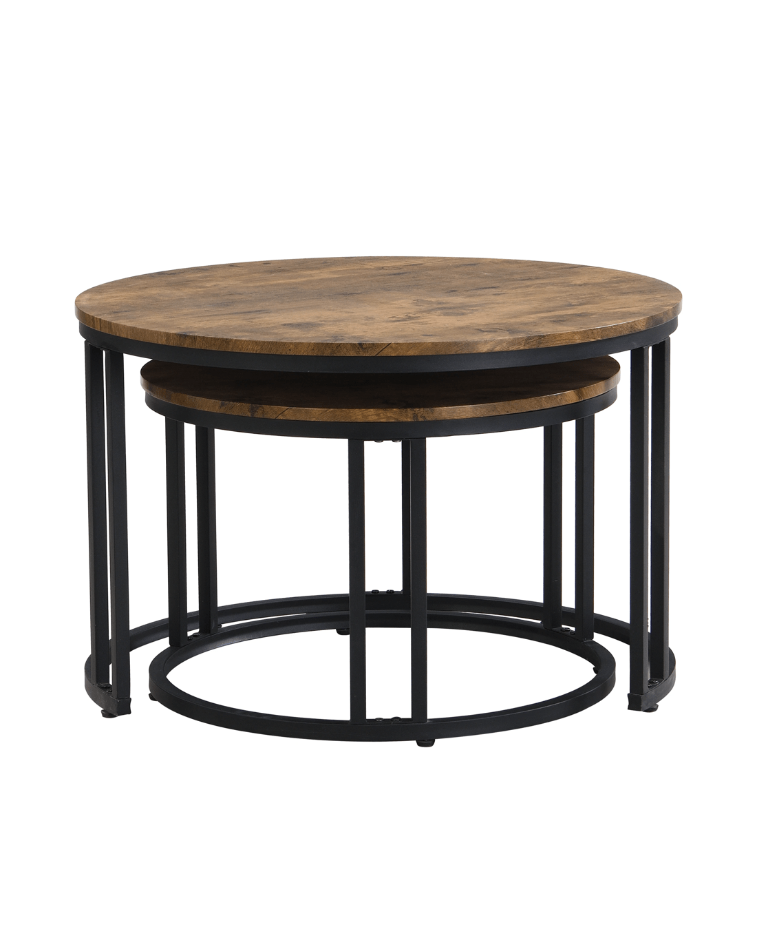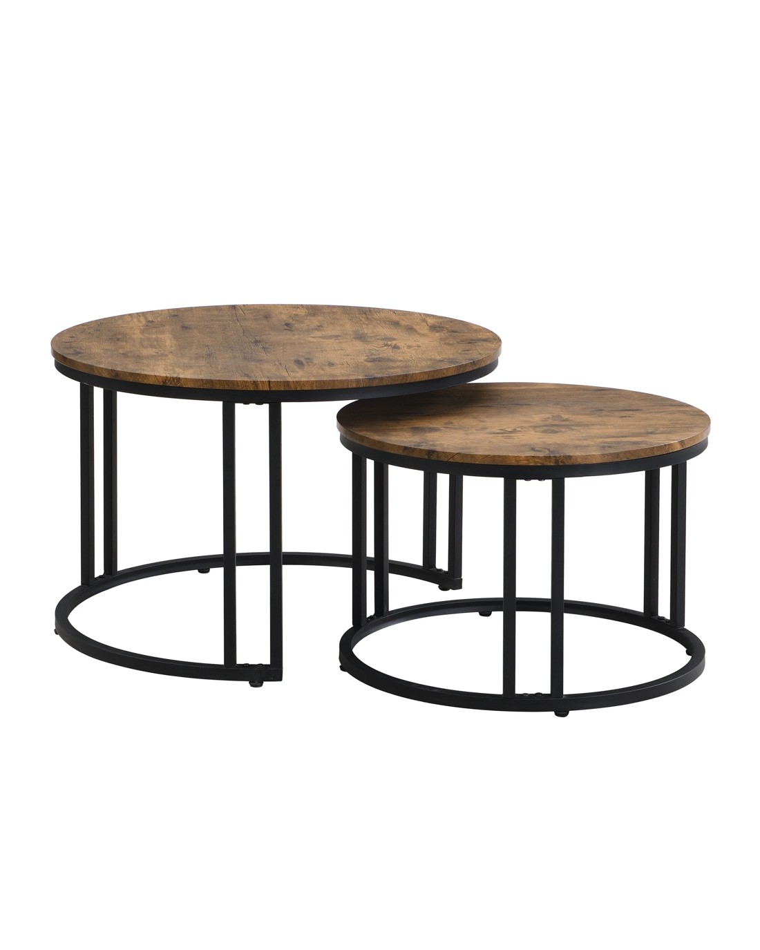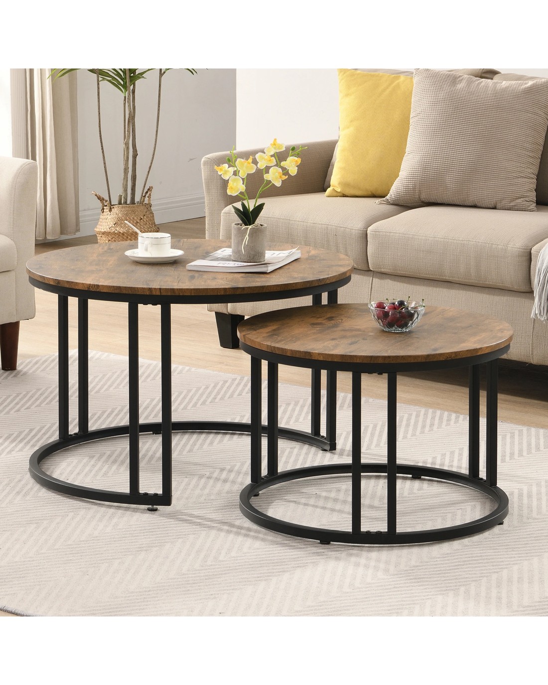 Nesting Coffee Table Set of 2 Rustic Dark Brown Description The nesting coffee table set of 2 feature minimalist design that will complement most living room styles. High quality material wood and steel, sturdy structure to ensure durability. Set of 2 nesting round table design for space-saving. Fits perfectly for living room, balcony or garden, patio furniture as well. Simple industrial style nesting table---The elegant and industrial retro style and nesting form design bring a unique experience to your Balcony living space. The MDF wood grain engraved tabletop makes the overall line of the coffee table smooth and beautiful, which is very suitable for families. Multi-functional combination---Large side table:74 cm (diameter) x 48.5cm (height), small side table:58.5cm (diameter) x 40cm (height). You can use them as The coffee table and side table are very suitable for the living room, bedroom, balcony, small space, etc. to be combined and placed at will Product Details: Shelf Material: MDF board(not solid wood)+ melamine surface Frame Material Details: Steel with black powder finish Color:Rustic Dark Brown Round table top with MDF board Sturdy Metal Stand Support and solid constructions and Easy to clean 0.8cm thickness steel tube Adjustable Non-slip Foot Pad Free Combination: Big and Small table provide multiple placement as you want. Assembly required, simple instructions Product Specifications: Large round table dimensions: 48.5cm H x 74cm W x 74cm D Small round table dimensions: 40cm H x 58.5cm W x 58.5cm D Large round table top dimensions: 1.5cm H x 74cm W x 74cm D Small round table top dimensions: 1.5cm H x 58.5cm W x 58.5cm D Clearance floor to bottom:1cm Big table weight capacity:30kg Small table weight capacity:30kg Overall weight capacity:60kg Box content 1 x nesting Table 1 x hardware pack 1 x assembly manual