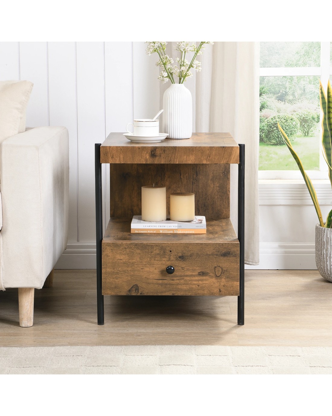 Retro Metal Tube and Wood Side Table with Drawer Rustic Dark Brown Descriptions Stable and Sturdy : This bedside table features a drawer with sturdy particleboard panels and round steel tube frames, durable and load-bearing capacity up to 35kg.4 non-adjustable feet keep the table level to avoid scratching the floor. 3-Tier Storage Option: This tall side table includes 2 tiers of open shelves provide ample space for storage and display. The open top shelf is perfect for displaying picture frames and plants. A drawer with handles provides more space to store personal items you want to put in. Multi-function Stand: You can place it in many places, such as a bedside table, a small dresser in your dorm room, a printer stand or a coffee table next to your sofa. Decorate your space with an industrial style nightstand. Easy to Assemble:Manual with detailed operation instructions, the hardware and tools included and each accessory is labeled for easy installation. Features Materials: round steel tube with powder finish,MDF board(not solid wood) + melamine surface Color: Rustic Dark Brown Pull out Drawer with round handle and slide rail Two round steel tube legs support Non-Adjustable foot-pads Solid & Durable structure Minimal Assembly Care Instructions:Do not put hot drinks on it directly, use coasters & placemats is highly recommended; wipe clean & polish frame with microfibre cloth to protect against scratching & general wear Dimensions Overall table dimensions: 52cm H x 42.5cm W x 48cm D Drawer outer dimension:15cm H x 38.5cm W x 48cm D Drawer inner dimension:11cm H x 29.5cm W x 29.5cm D Top shelf dimensions: 4.8cm H x 38.5cm W x 48cm D Clearance from floor to bottom of Product: 10cm Clearance between drawer top and shelf bottom:22cm Table top weight capacity:20kg Bottom shelf weight capacity:15kg Overall Product Weight Capacity: 35 Kg Box content 1 x side table 1 x hardware pack 1 x assembly manual