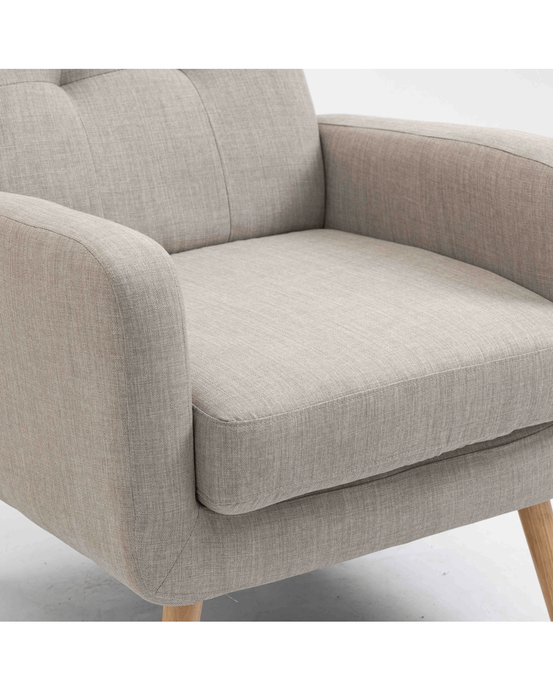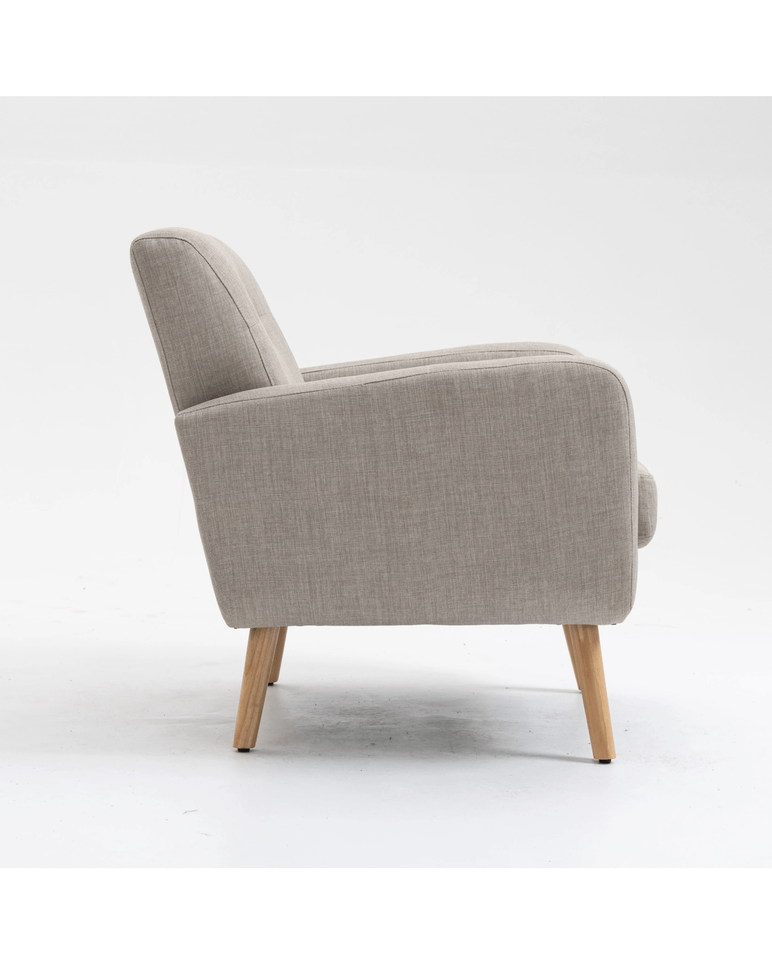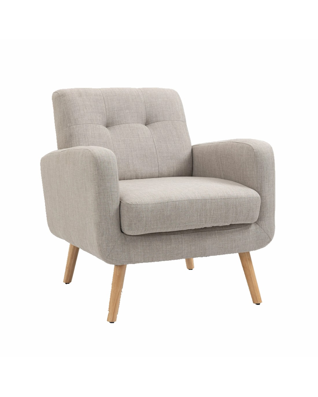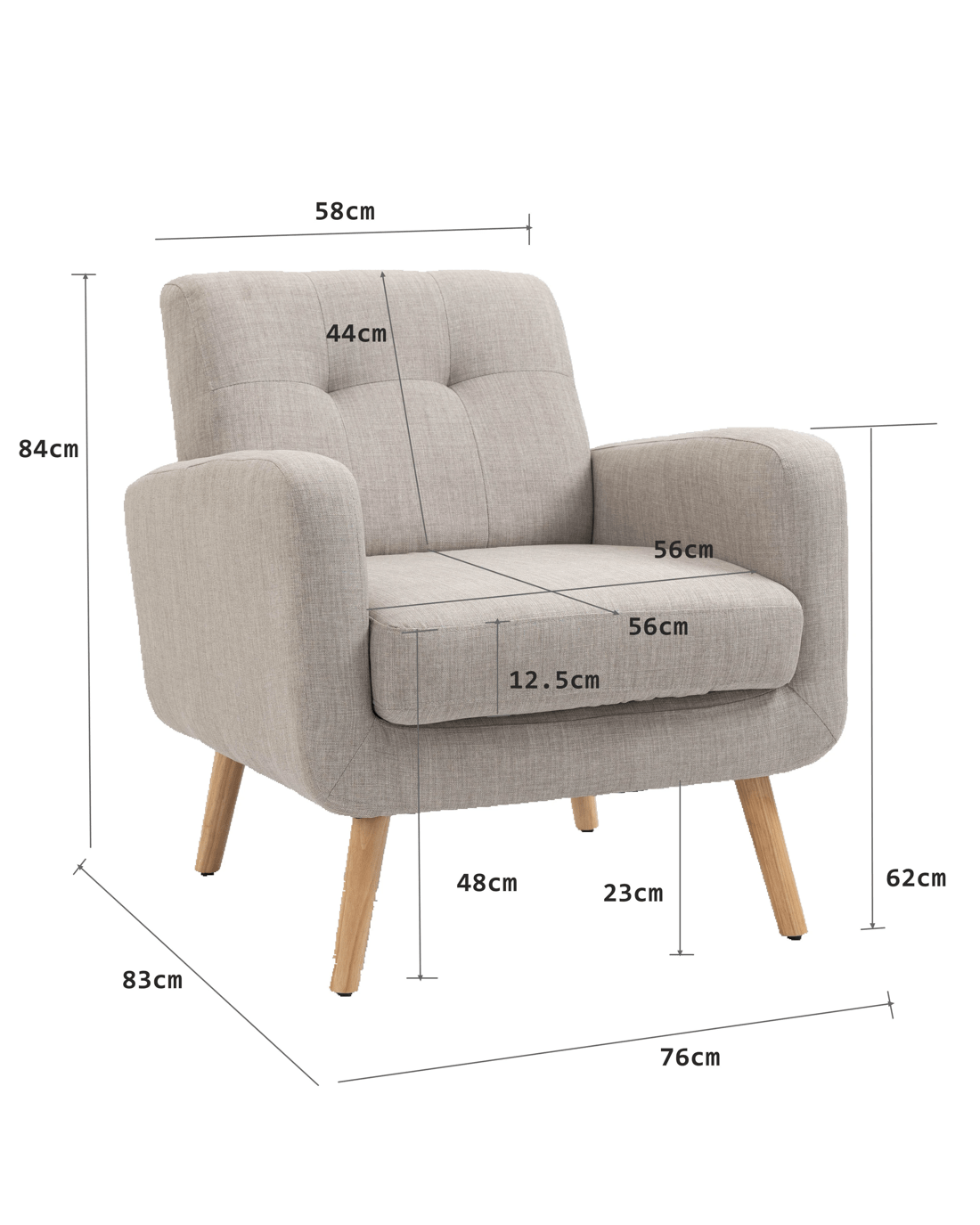 Mid Century Upholstered Tub Armchair with Rubber Wood Legs Description Relax in Style: Brimming with evocative charm, the tub chair with soft seat cushion, Solid Rubber wood legs, comfortable brushed fabric upholstery, and retro stylish appearance, which adds a delicate and beautiful look to your home. Stay in Coziness: The seat cushion is removable. Sink into the plump cushion, upholstered backrest, and extra-wide and deep seat with supporting foam underneath, and prepare for movie marathons or cozy relaxing with the family. Anti-Slid protection: Adjustable plastic leg pads not only prevent your floor from unwanted scratches, but also avoid undesired sliding, letting you truly relax with peace of mind Minimal Assembly: With the detailed instructions and numbered parts, youll have a new sofa chair installed well in the living room in just a few steps Features Materials: 100% polyester Brushed fabric; solid rubber wood for structure; rubber wood for legs; high-density foam Leg with adjustable with plastic screw-in anti-slid padding Removable cushion with velcro attached to avoid slid away and with zip open & close Note: product colour may slightly vary due to photographic lighting Specifications Overall Dimension: 84cm H x 76cm W x 83cm D Seat cushion dimension: 12.5cm H x 56cm W x 56cm D Seat Height: 48cm Arm height:62cm Backrest width:58cm Backrest dimension:44cm H x 58cm W Clearance from floor to bottom:23cm Weight capacity: 120KG Package Content 1 x tub chair 1 x Assembly Manual 1 x hardware pack