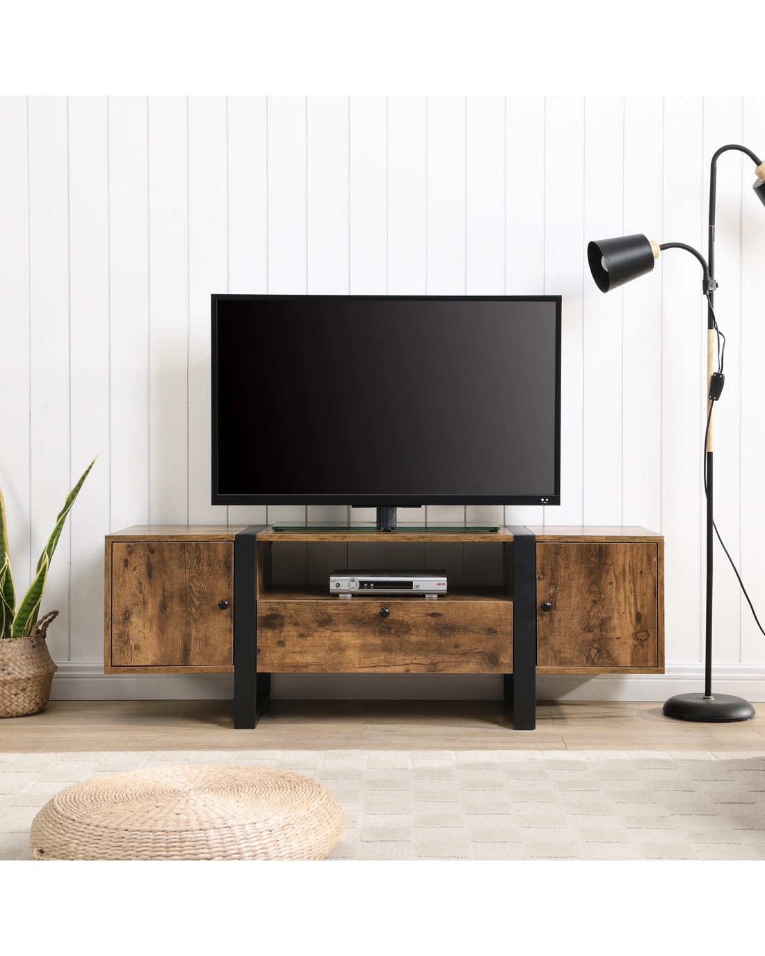 Metal & Wood TV Cabinet TV Stand with Cabinets and Open Shelf Rustic Dark Brown Descriptions Convenient 3 Cabinets and Open Shlef---Featuring this TV stand offers a practical solution for storing and organizing various items, keeping them easily accessible yet safely out of reach of children, ensuring a clutter-free and child-friendly environment. Solid Constructions---With a top surface that can withstand a remarkable weight of max 80kg, this TV stand ensures secure and stable support for your TV, providing peace of mind and reliability. Unique and stylish design---Its eye-catching aesthetic adds a touch of sophistication and elegance to any living space, making it a statement piece that enhances your home decor. Ample storage space for all your needs---This TV stand provides generous storage capacity, allowing you to neatly organize and store your media devices, DVDs, gaming consoles, and other accessories. Enjoy a clutter-free entertainment area where everything is within reach and well-organized. Features Materials: steel frame with black painting, MDF board(not solid wood) Metal frame base, Three cabinets with doors, One open storage Handle material:aluminum alloy Hinge material of Cabinet doors: stainless steel rectangle tube 0.8cm thickness 5cm width steel tube, 2cm depth Dimensions Overall dimensions:45cm H x 130cm W x 39cm D Top shelf dimension:1.5cm H x 120cm W x 40cm D Left & Right Cabinet Outer dimension: 32cm H x 30cm W x 39cm D Left & Right Cabinet Inner dimension: 29cm H x 28.5cm W x 36cm D Middle cabinet outer dimension: 15cm H x 60cm W x 36cm D Middle open storage dimension:14cm H x 60cm W x 39cm D Clearance from floor to bottom of Product: 13cm Steel metal tube dimension:0.8cm thickness x 5cm W x 2cm D Top shelf weight capacity:50kg Overall Product Weight Capacity:80 Kg Box content 1 x TV Unit 1 x hardware pack 1 x assembly manual