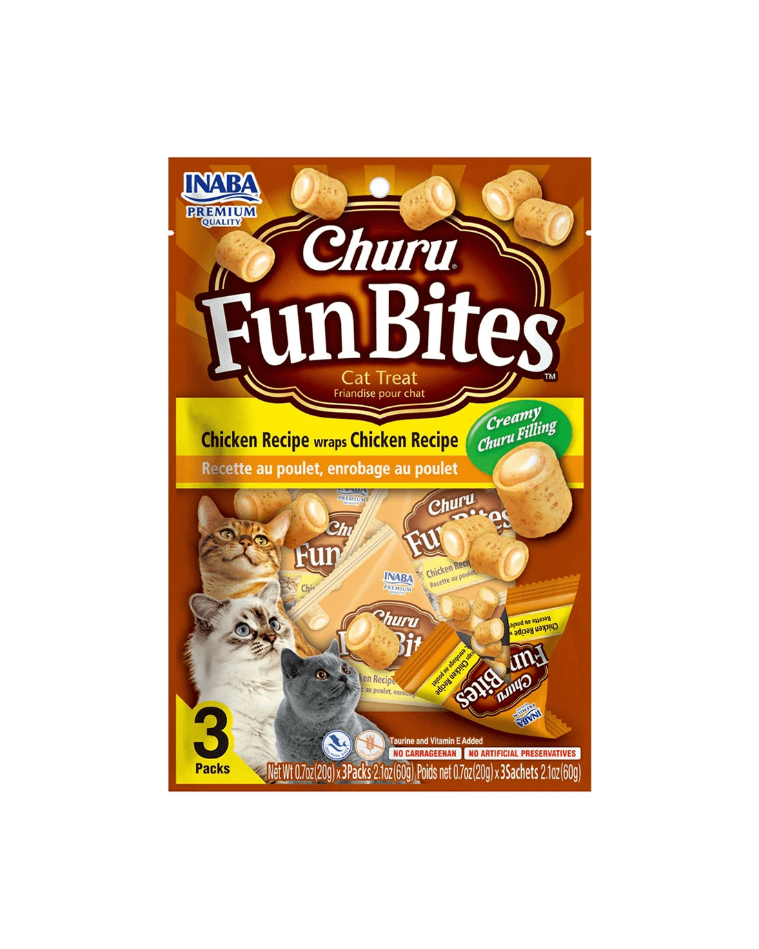 Inaba Churu Fun Bites Chicken are irresistible cat treats that delight even the fussiest felines. These pillow-shaped bites feature a soft-baked chicken paste filling, delivering double the texture for ultimate enjoyment. Crafted with wholesome, 100% natural farm-raised chicken, they include taurine and vitamin E to support immune health. Low in calories and high in moisture, these grain-free treats are perfect for hand-feeding.