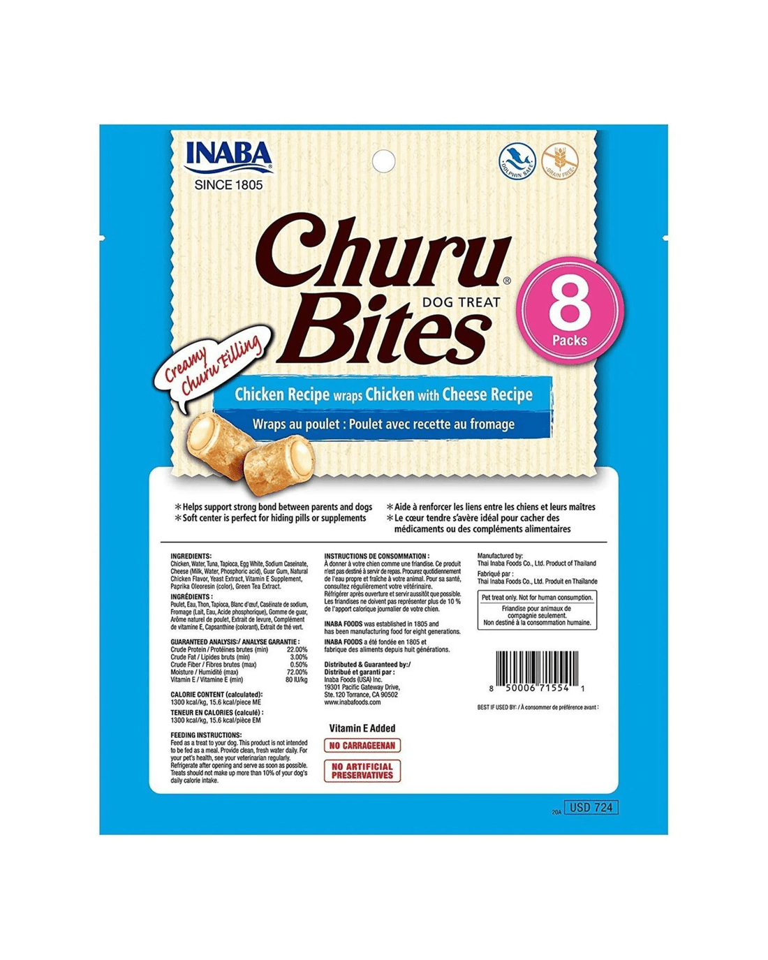 Churu Bites are soft pillow-shaped natural chicken treats seasoned with natural flavours, green tea extract and vitamin E. No grains, preservatives or artificial colours. Each package includes eight individual packs to maintain maximum freshness.