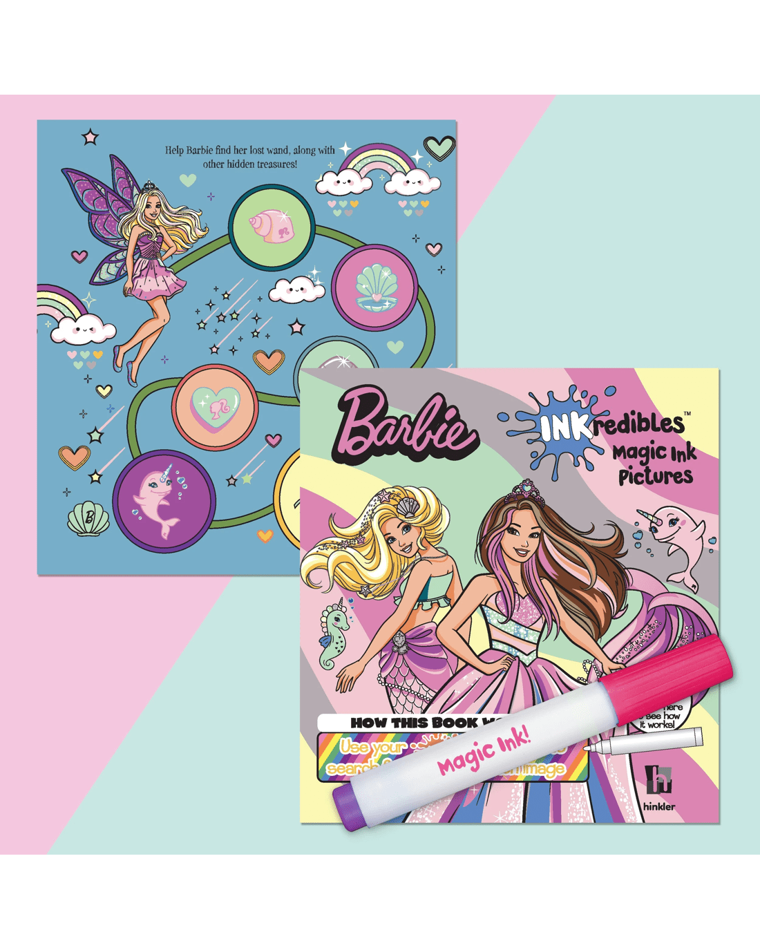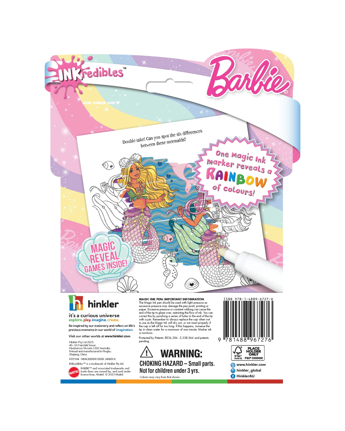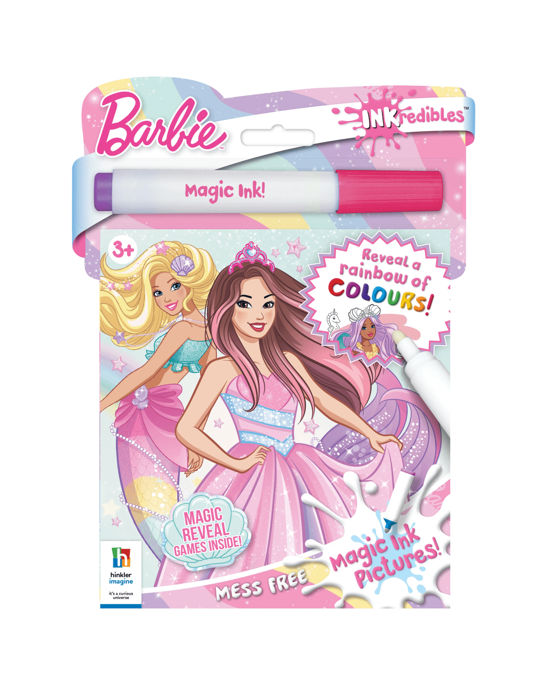 A sparkly, magical adventure awaits in this INKredibles Magic Ink Barbie Fantasy! This fabulous 24-page colouring and activity pad is bursting with images of Barbie having a blast! Little ones will love using the special Magic Ink marker to reveal vibrant colours as they colour pictures and solve puzzles to help Barbie have a great time!