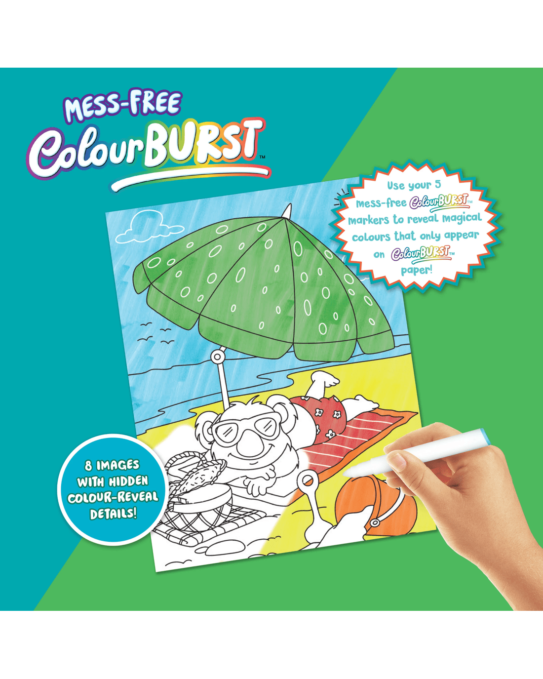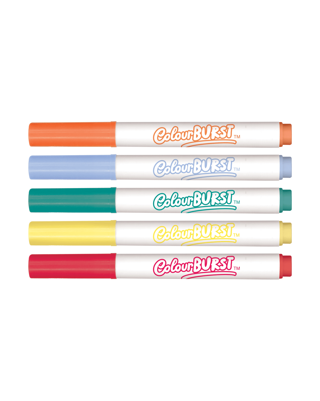 • Use your 5 mess-free colour burst markers to reveal magical colours that only appear on colour burst paper!