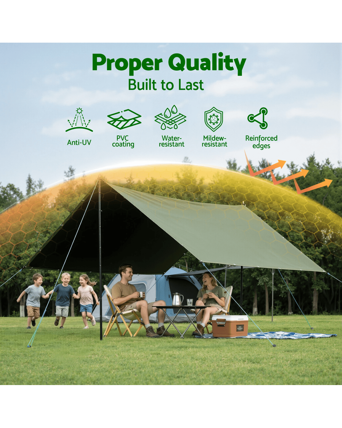 Crafted from heavy-duty 600gsm silicone-coated canvas with a thick PVC layer, this robust tarp is built to last. The solid 0.5mm thick green material is not only visibly tough but also fully waterproof, UV-resistant, and anti-fade, standing up to extreme heat and deep cold without failing. Reinforced edges and corners, along with heavy-duty steel eyelets, ensure secure and hassle-free tie-downs. Come wind, rain, or harsh sun, this tarp delivers unwavering performance.