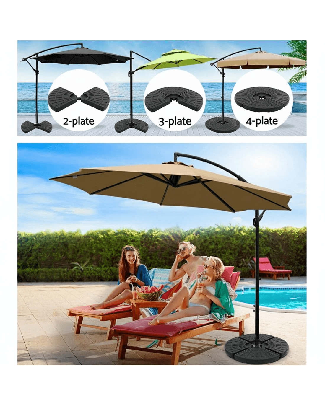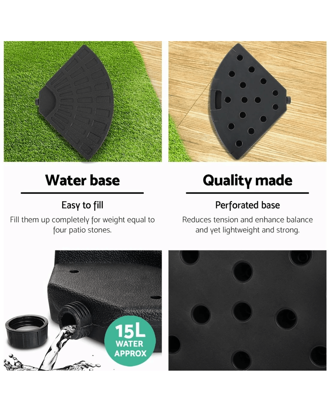 Secure your umbrella with our Instahut fillable base, designed for maximum stability. Easily add water for steadfast support, even on windy days. Relocating? The integrated hand grip ensures effortless mobility. Always check compatibility to ensure it fits your outdoor umbrella. Crafted for both strength and convenience, it's the essential anchor for your outdoor shade needs.
