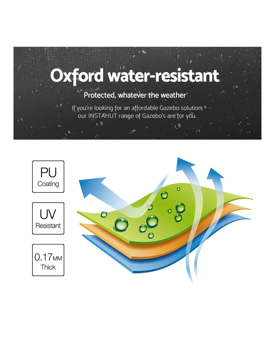 Ideal for outdoor weddings, sports events, trade shows, market days or camps, the INSTAHUT Gazebo is your premium quality shelter at an affordable cost all year round.