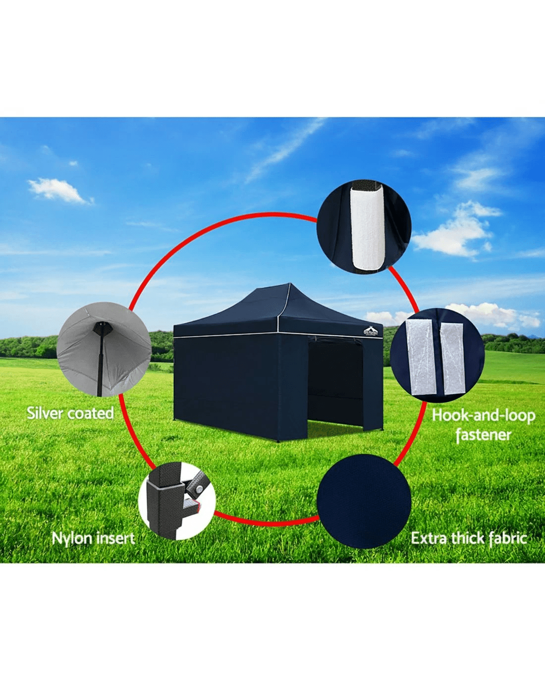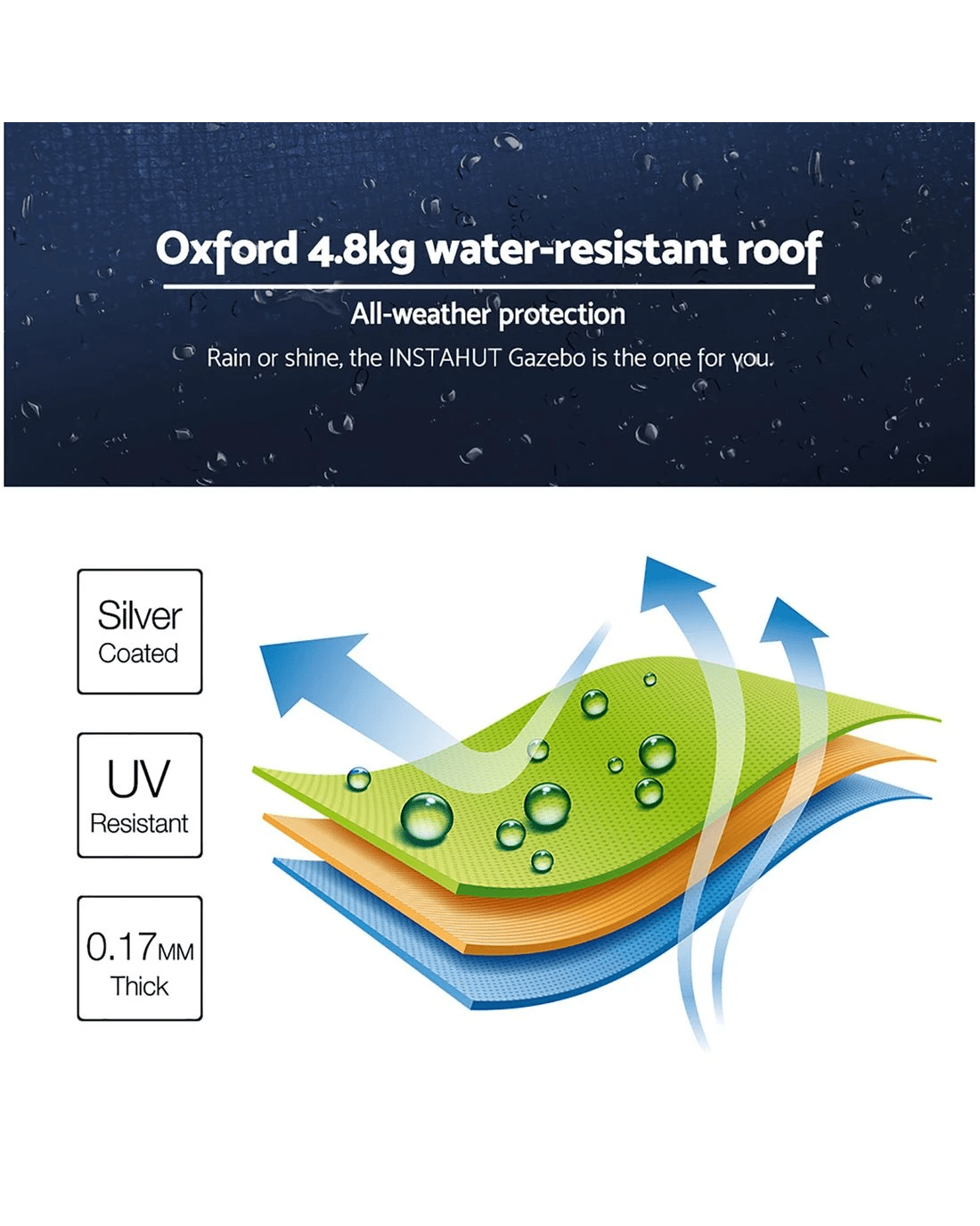 Featuring high density, long lasting PU coating oxford fabric with effective UV and water repellent treatments, this INSTAHUT 3X4.5m Pop Up Gazebo provides a lovely ground and canopy coverage of 300 x 450cm. It is perfect for all your upcoming outdoor activities, as a sunshade station as well as a shelter for unexpected rains.