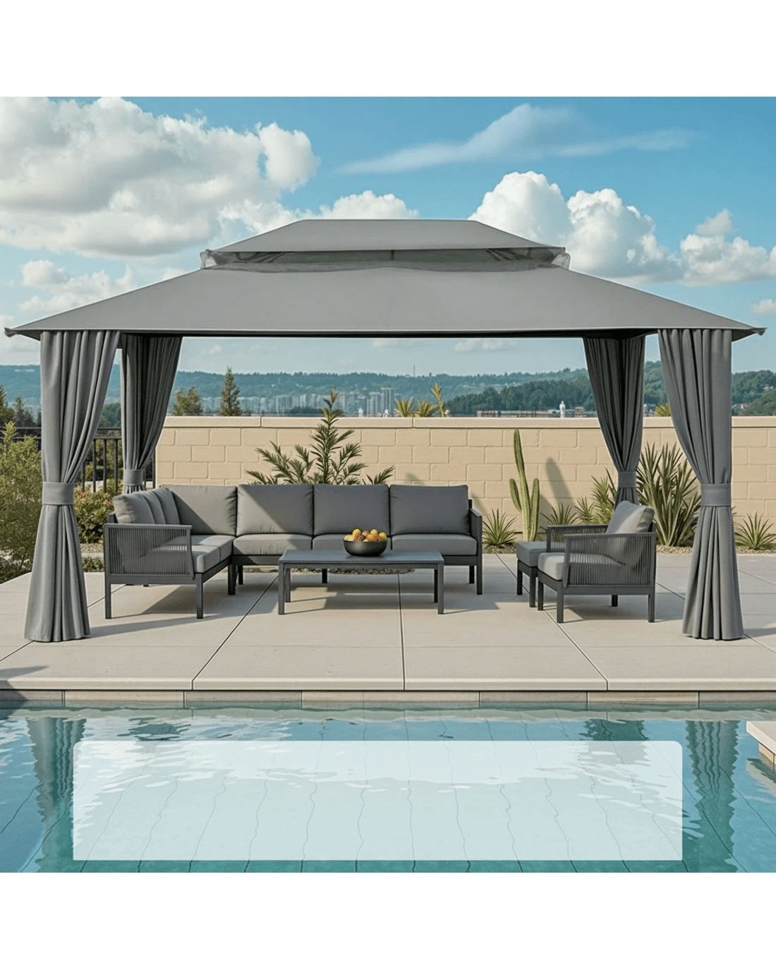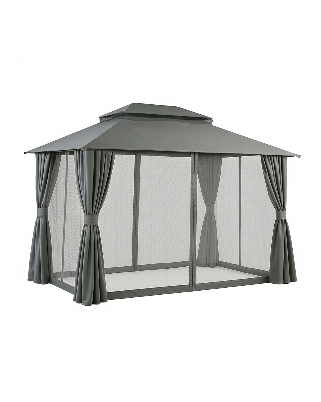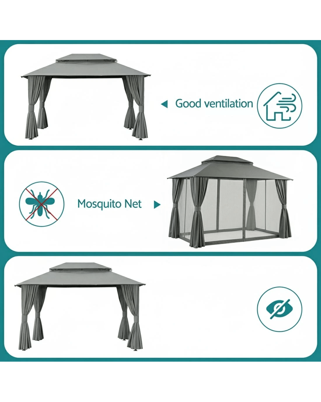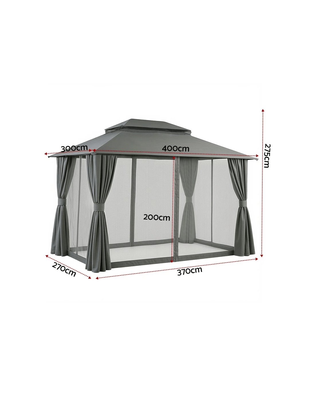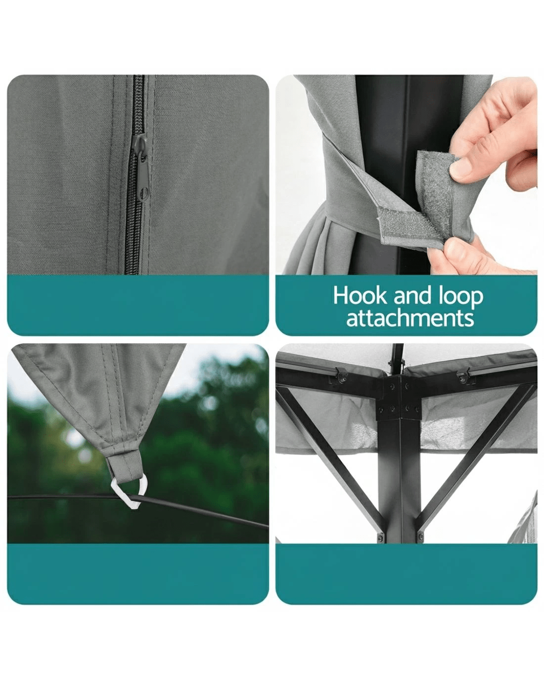 Keep comfortable outdoors year-round with this sturdy Instahut gazebo. Its ventilated double-roof design promotes airflow while the UV-resistant, water-resistant top protects from harsh Aussie sun and light rain. Features practical 8 water leakage holes to prevent pooling. Enjoy bug-free relaxation with full removable flyscreens and curtains, thanks to the dual-track system and double-sided zippers. The heavy-duty powder-coated steel frame ensures stability, while convenient hanging hooks and hook & loop attachments add versatility. Mosquito-proof mesh walls provide reliable insect protection. Sets up to a spacious footprint in classic grey. Constructed from durable steel and polyester.