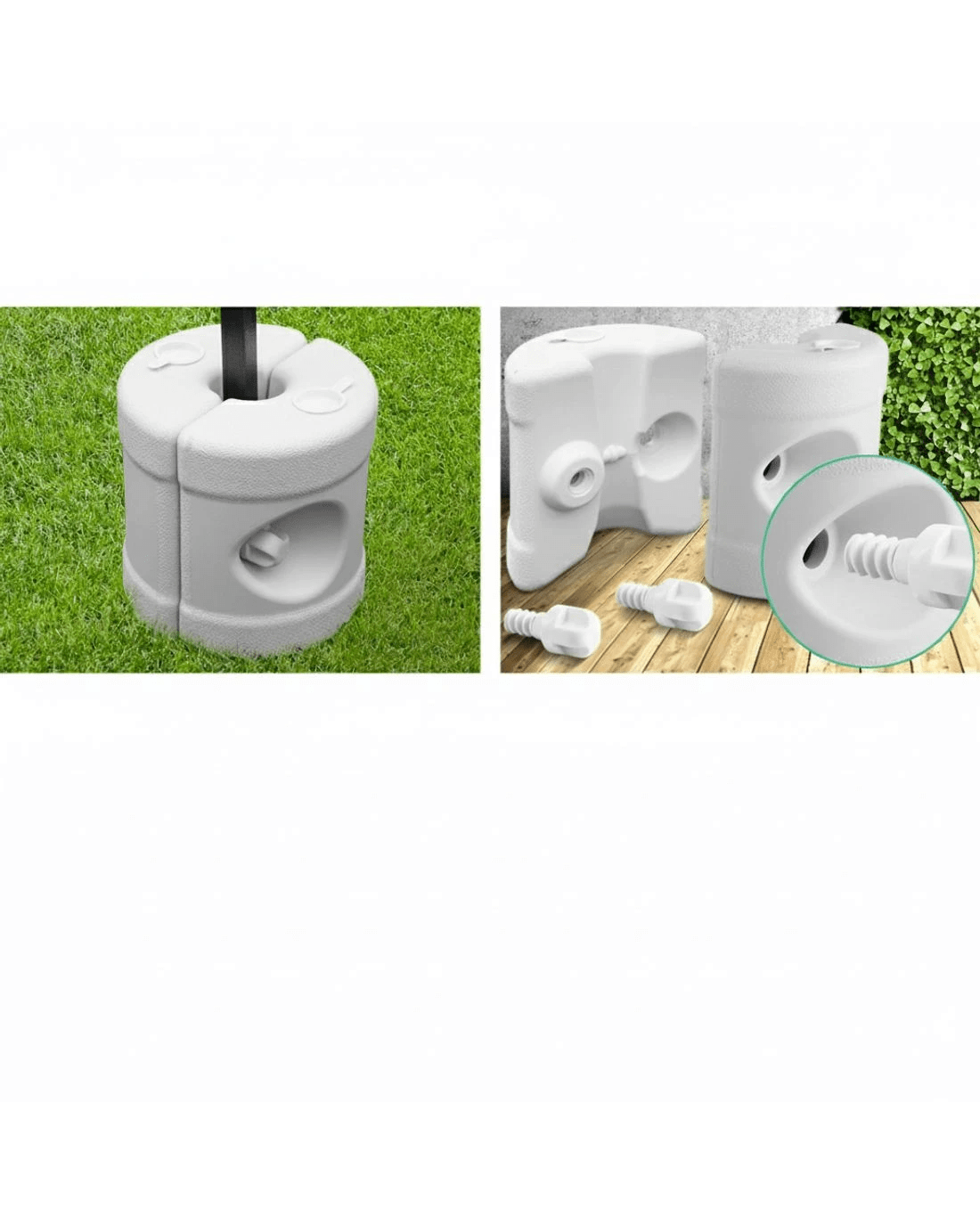 Featuring a convenient pack of 4 gazebo base pods, simply attach these pods to the bottom of your gazebo legs; they will increase the stability of the gazebo. These gazebo base pods are ideal when pegs cannot be used on the hard surfaces. Extremely easy to set up with no tools required; each pod comprises of 2 halves secured together by an oversize moulded thumb screw. The pods can be filled with either water or sand.