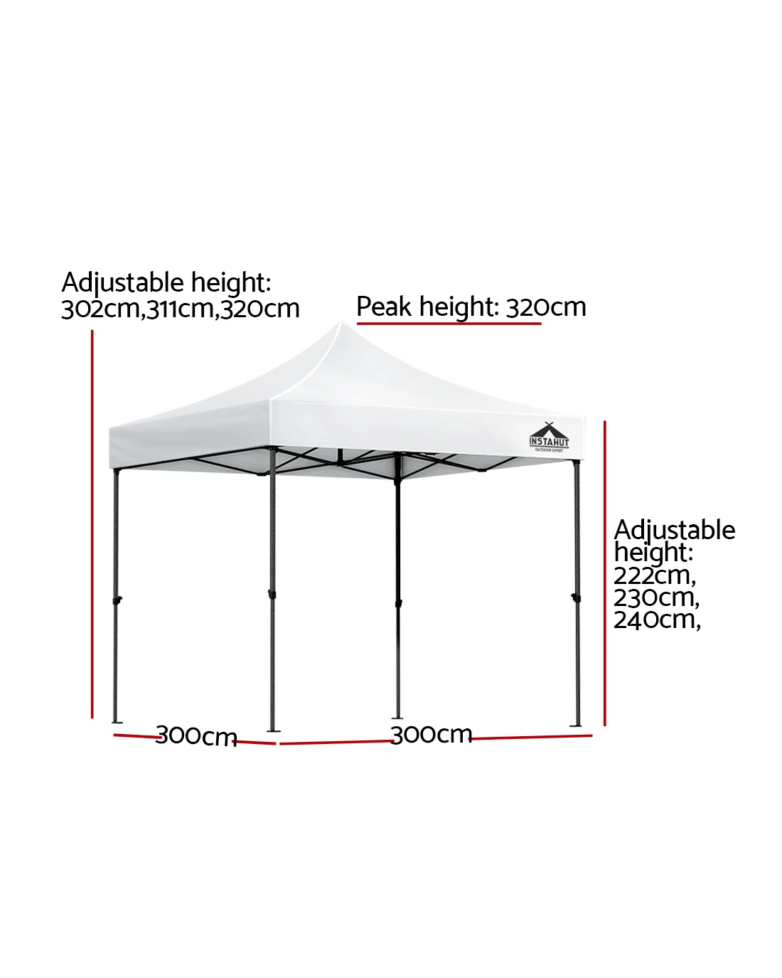 The INSTAHUT gazebo has 3 adjustable height levels to suit different height needs. It is ideal for markets, sporting events, camping, garage and yard sales, school events, trade shows and many more.
